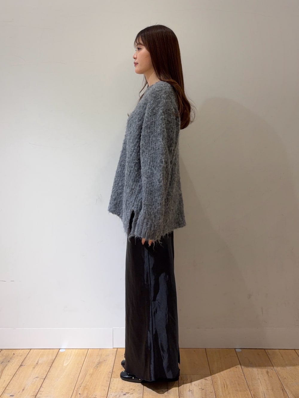 ニットはゆったりシルエットなので下はマーメイドラインのサテンのスカートを合わせてスタイルアップ◎