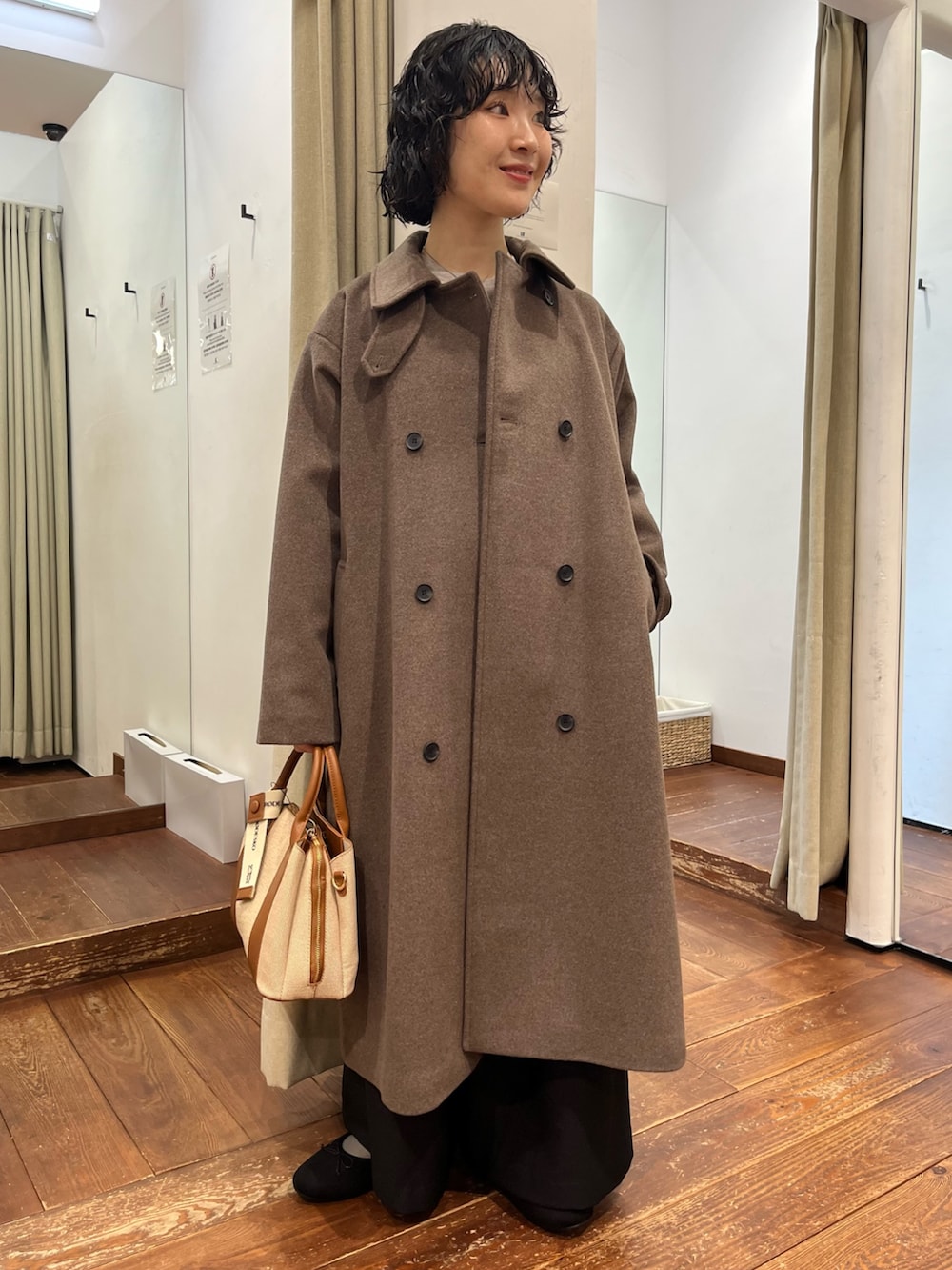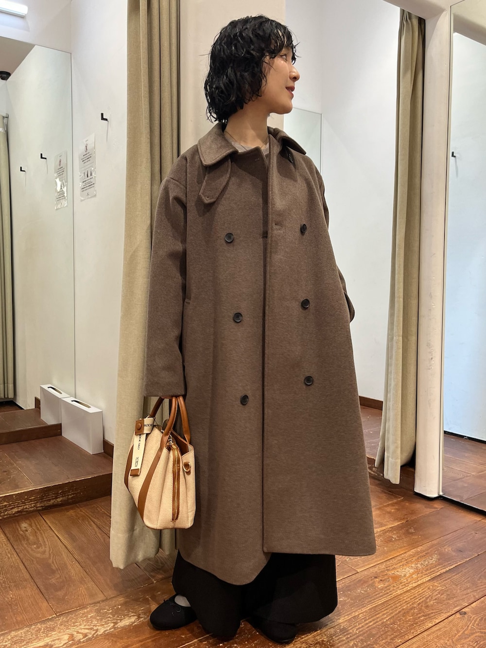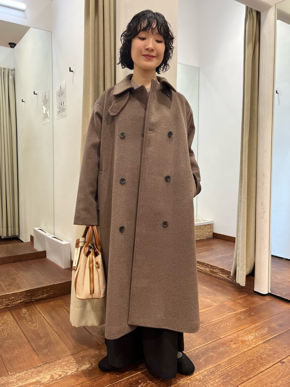 上質なウール素材を使用した生地は、重厚感がありますが見た目より軽いです。フロントはダブルの仕様でクラシックでクールな雰囲気がありますが、マキシ丈で女性らしさも。