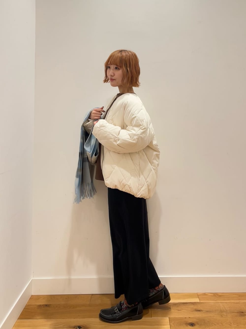すっきりとしたノーカラーなので、タートルネックやパーカーとのレイヤードスタイルも楽しめます。ストールとの相性も◎