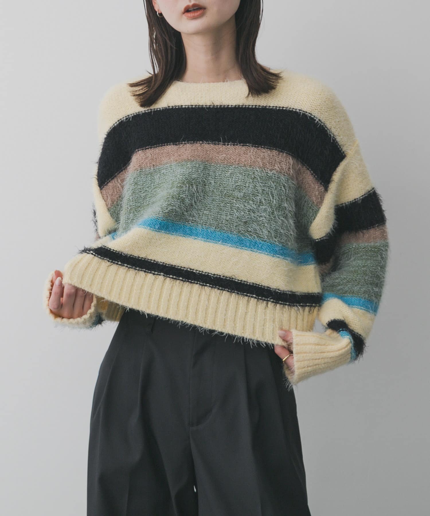 毛足が少し長く、触り心地も柔らかいこちらのニットは丈も長すぎないので、レイヤードしやすいアイテムです◎