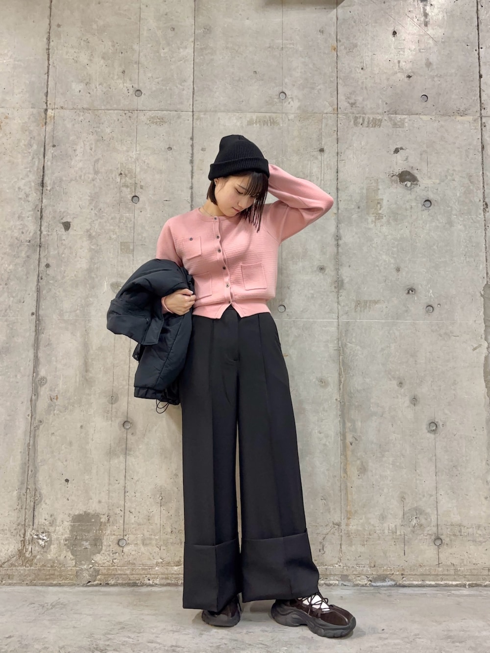 ブラックのアウターにカラーを合わせたく、肌触りがとてもいいポケット付きのピンクカーディガンを選びました!デニムやスカートと合わせても🙆♀️