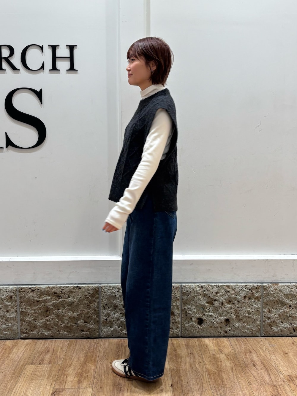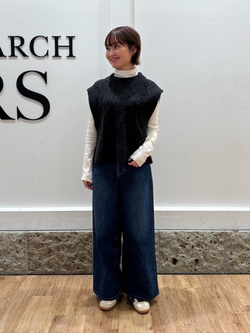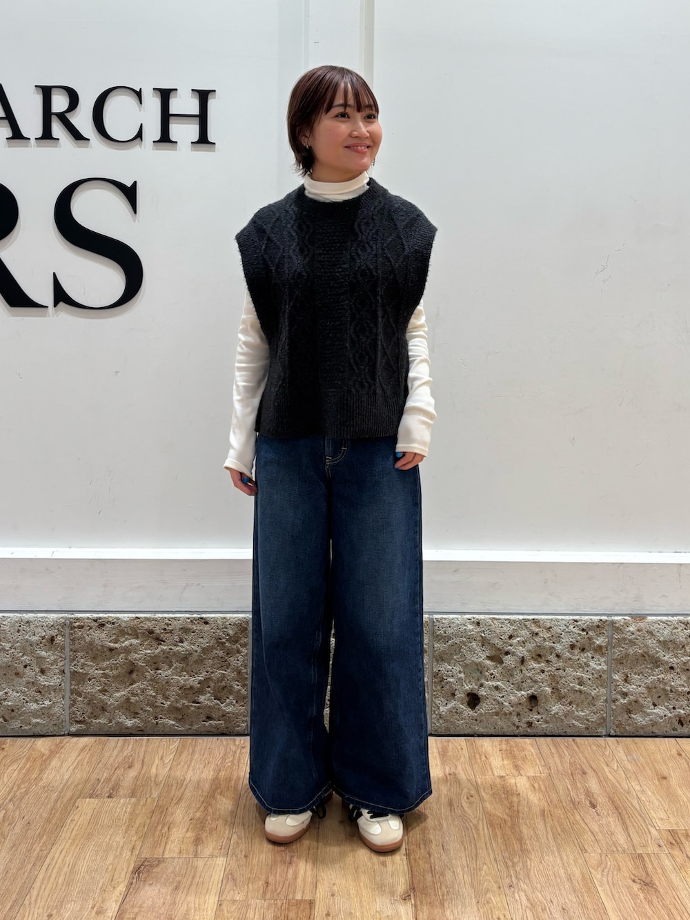 ケーブルニットベスト着用しています。体型にフィットしすぎないのでゆったりと着ることができます。肩も少し落ちているので腕が細く見えますよ◎