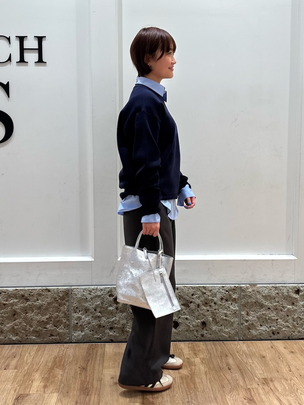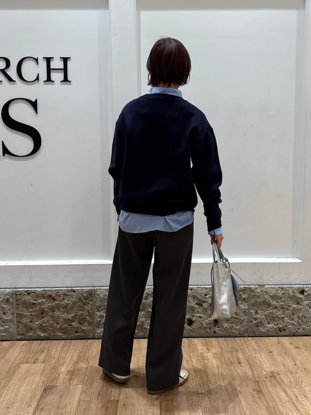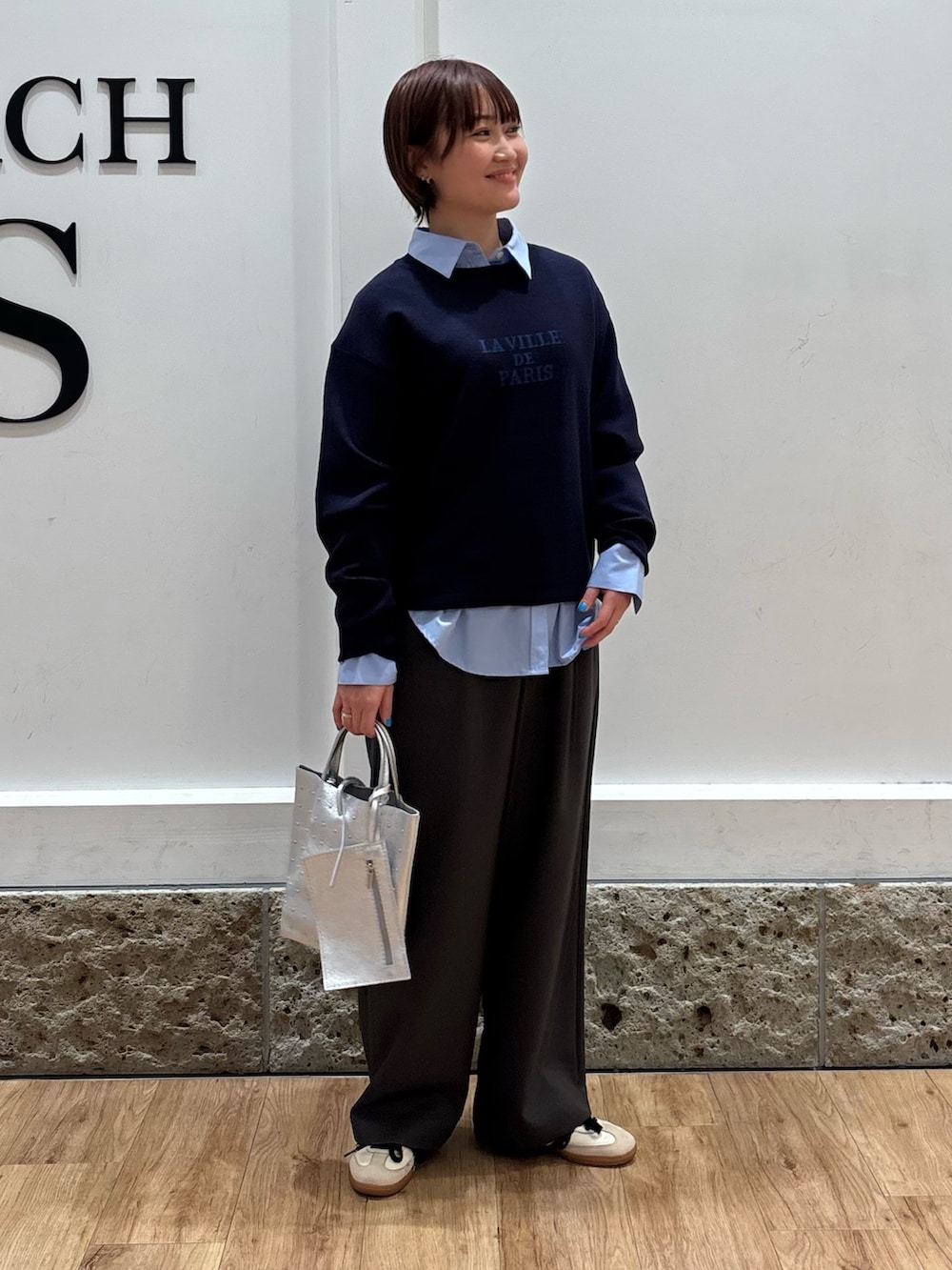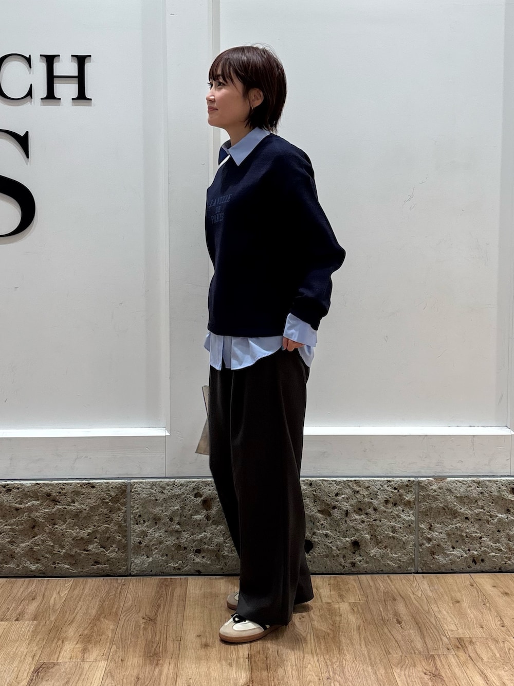 新入荷アイテムのロゴニットプルオーバーを着用しています。ネイビーとブルーのシャツを合わせてみました。シンプルなロゴなのでかわいくも綺麗めにも着こなすことができますよ◎