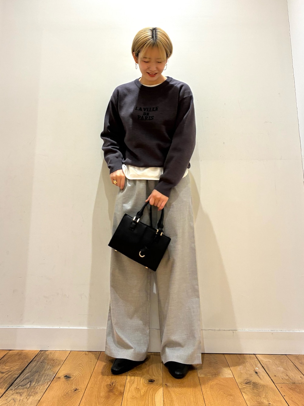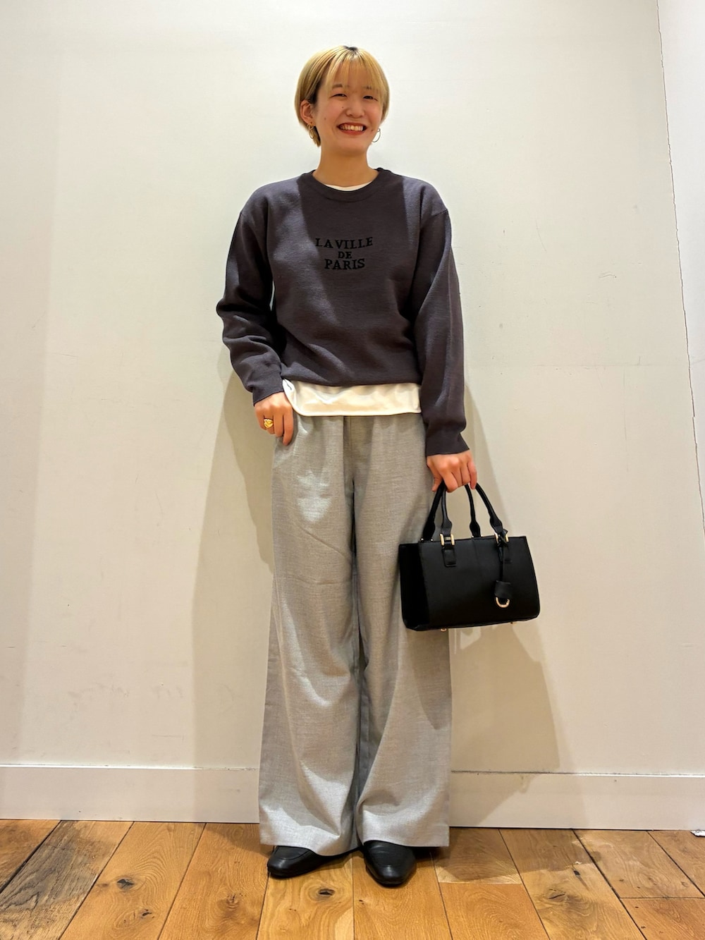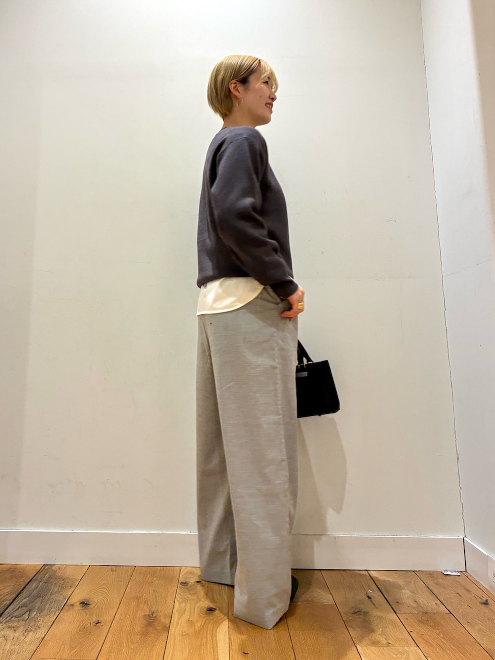エカルのアイボリーのカラーのパンツは、ワイドめでゆったり履けるのでゆるっとこなれ感が出ますね〜