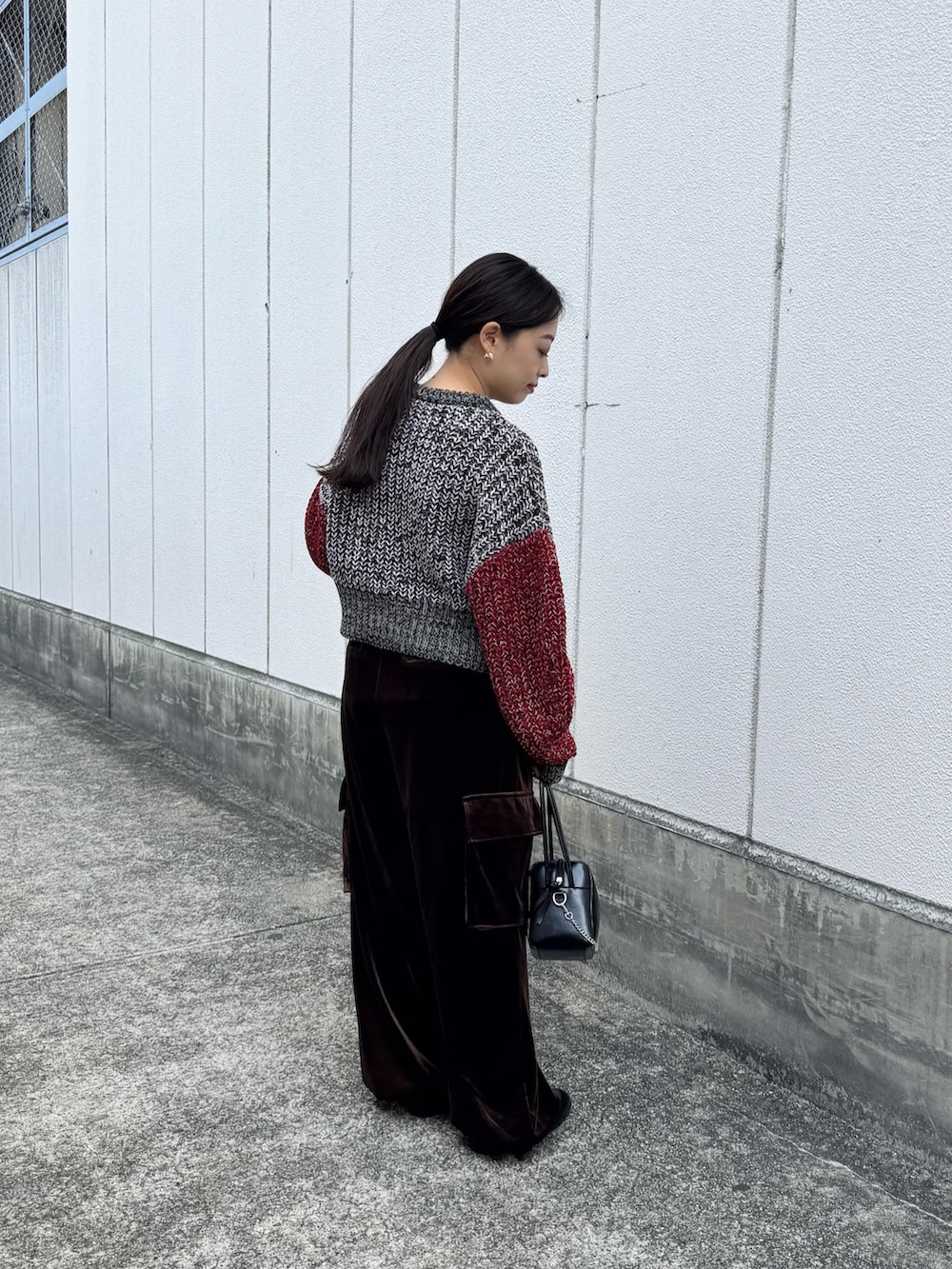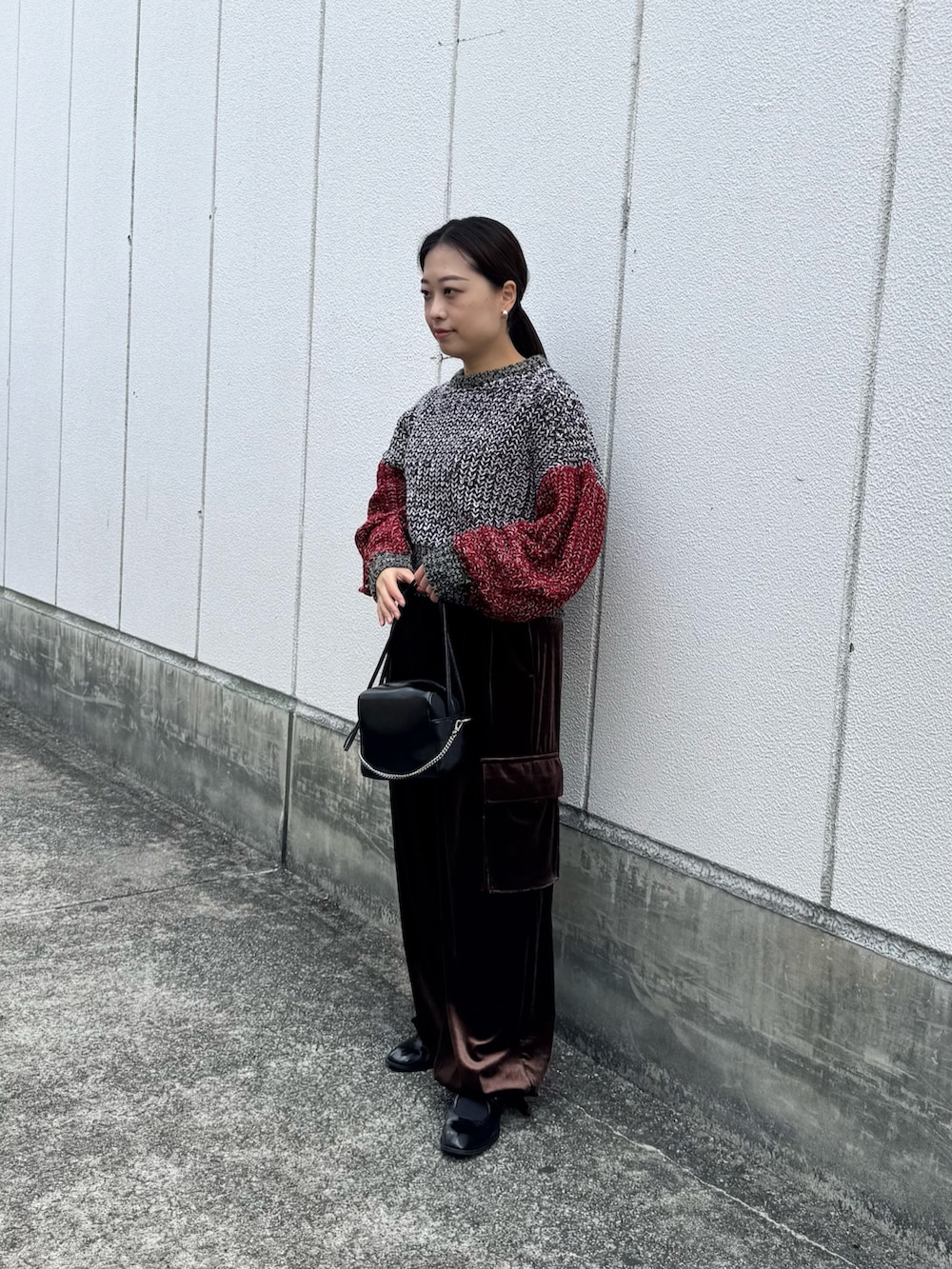 ベロアパンツをと黒のバッグを合わせてカジュアルすぎずキレイめすぎない普段使いしやすいスタイリングにしました。