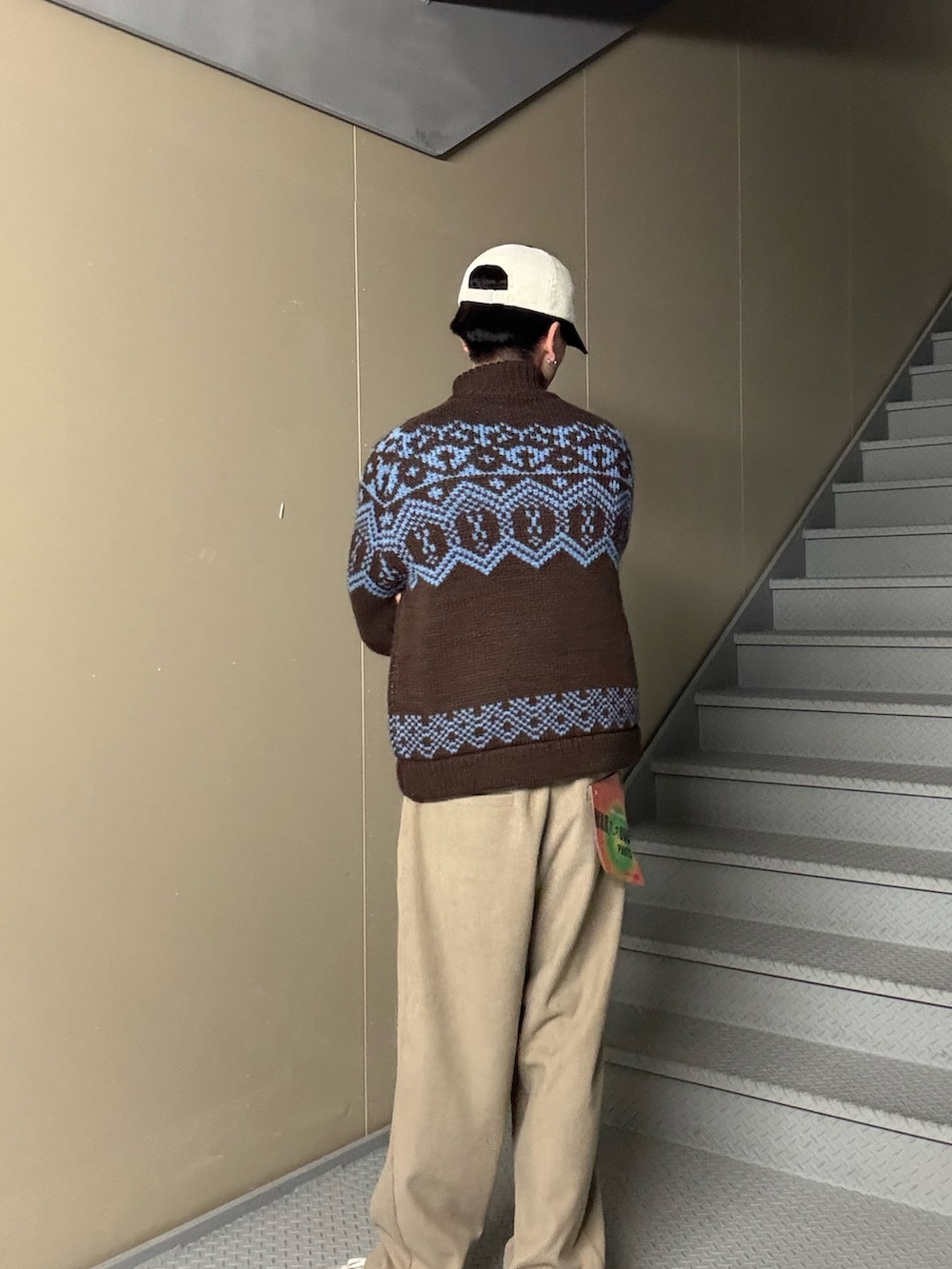 ブラウンにブルーの柄が入ったニットカーデは、季節感がしっかり出せるアイテム。