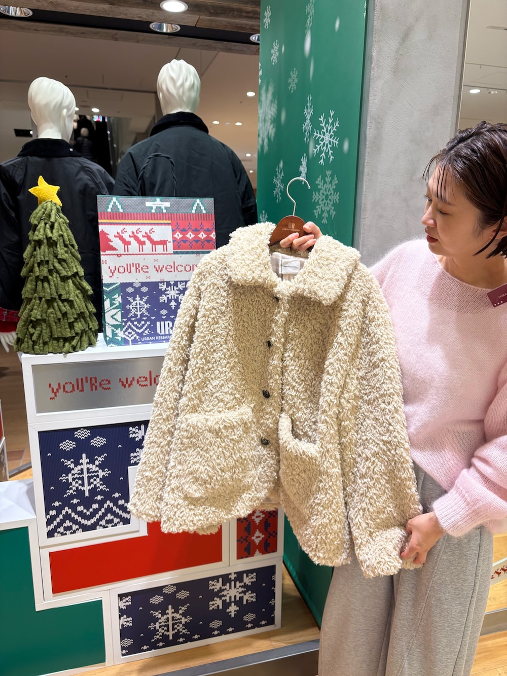 もこもこの生地感が目を惹くかわいいアウター😍クリスマスのかわいらしさを演出してくれます✨