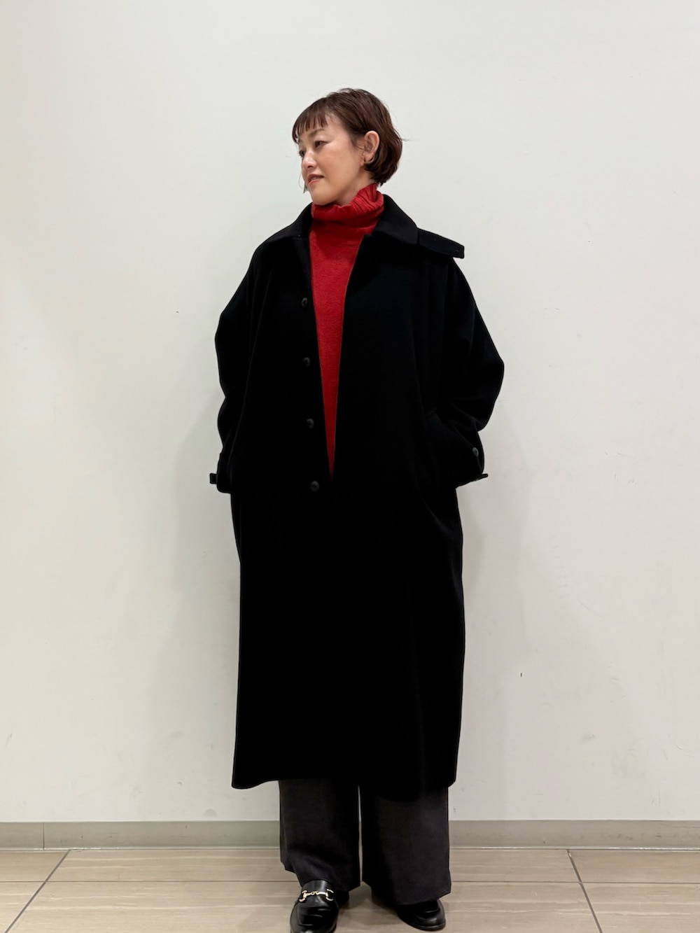 ハミルトンの赤いタートルにロングコートでちょっと大人な装いです。