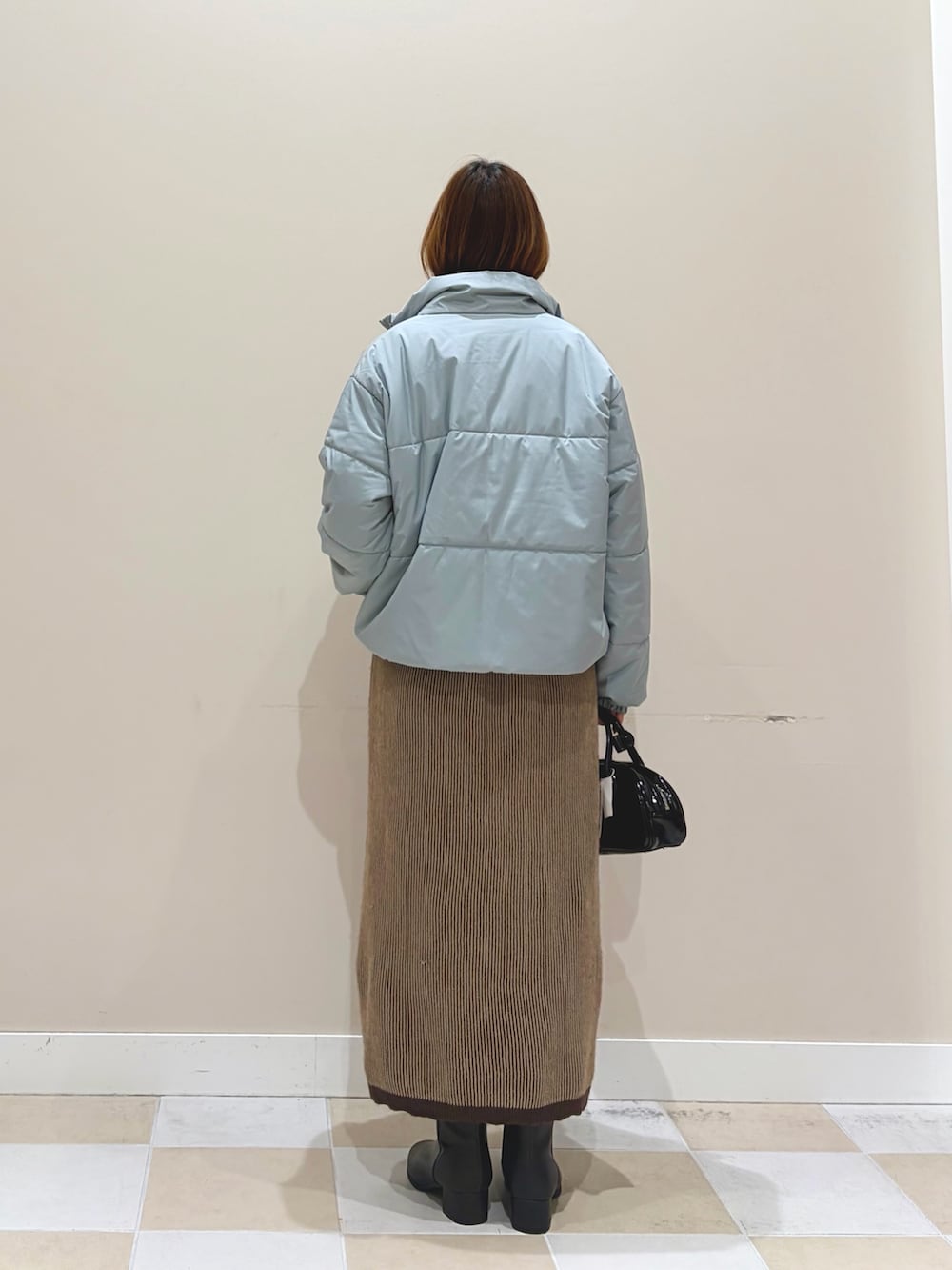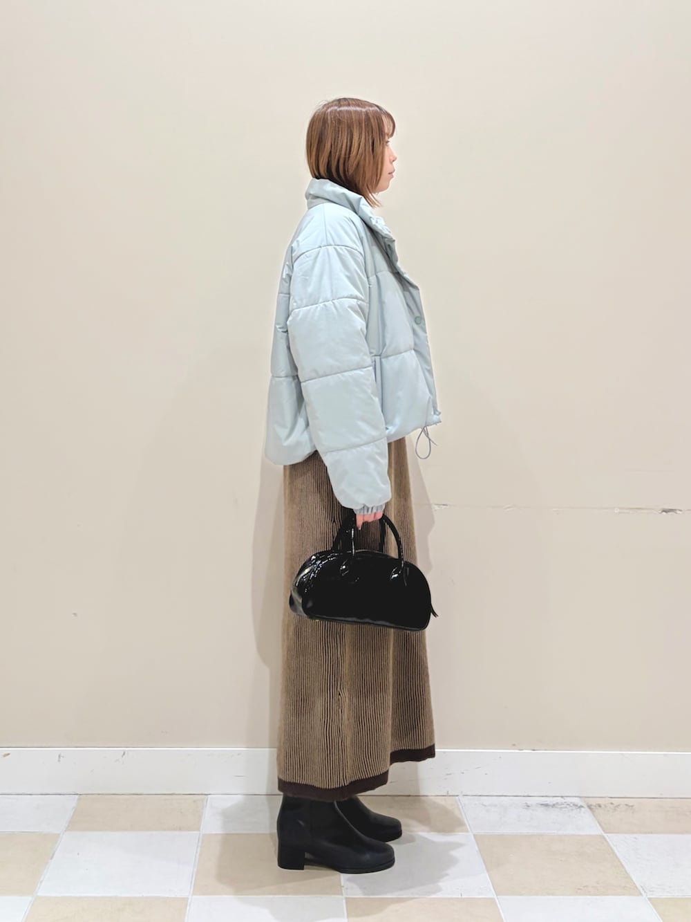 綺麗なライトブルーのショート丈中綿ジャケットにビスチェがセットになったニットワンピースを合わせてお出掛けにおすすめのスタイルにしました!
