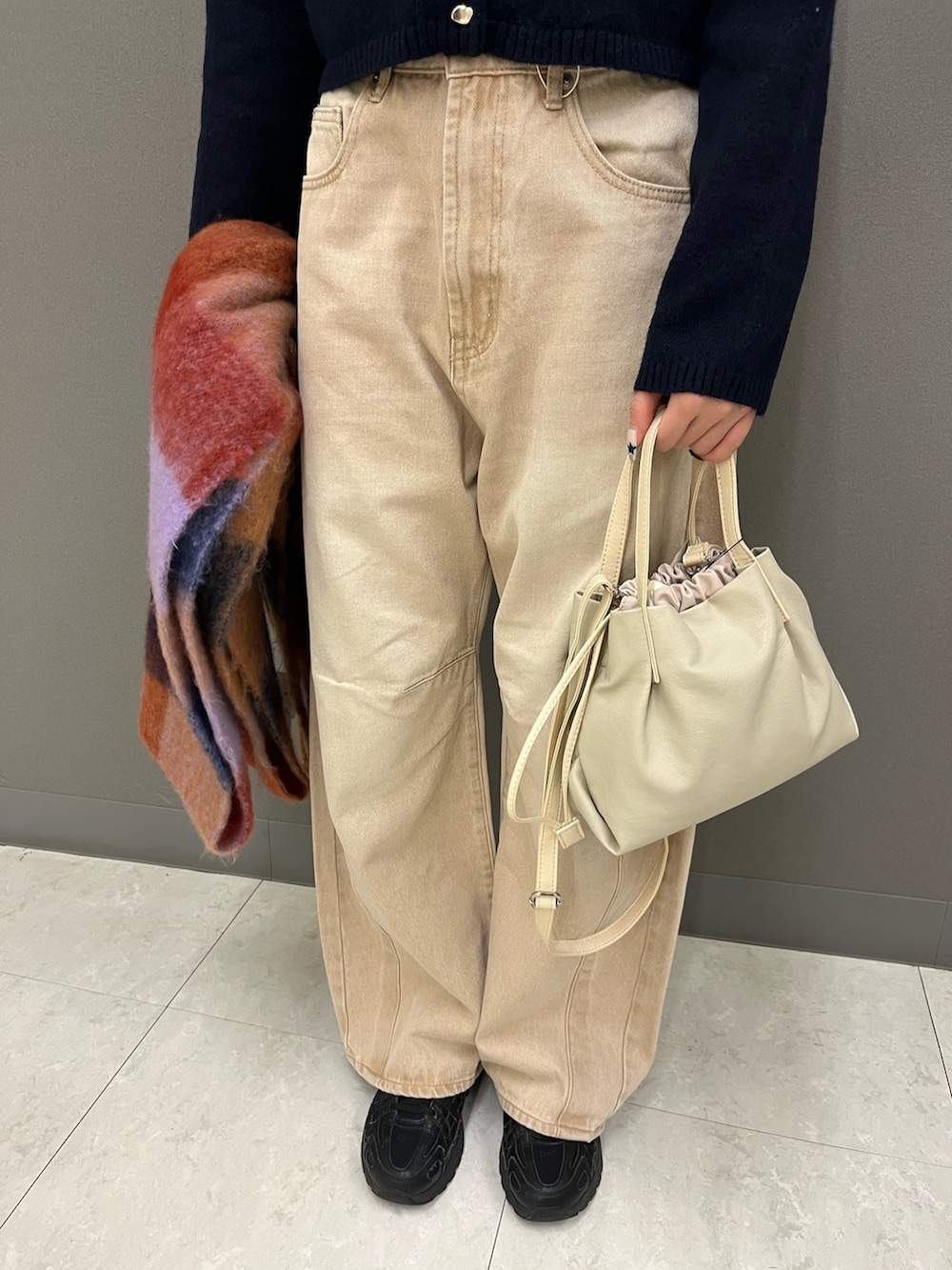 暖色のチェックマフラーをプラスすることで、一気に季節感と華やかさをアップできます🔥