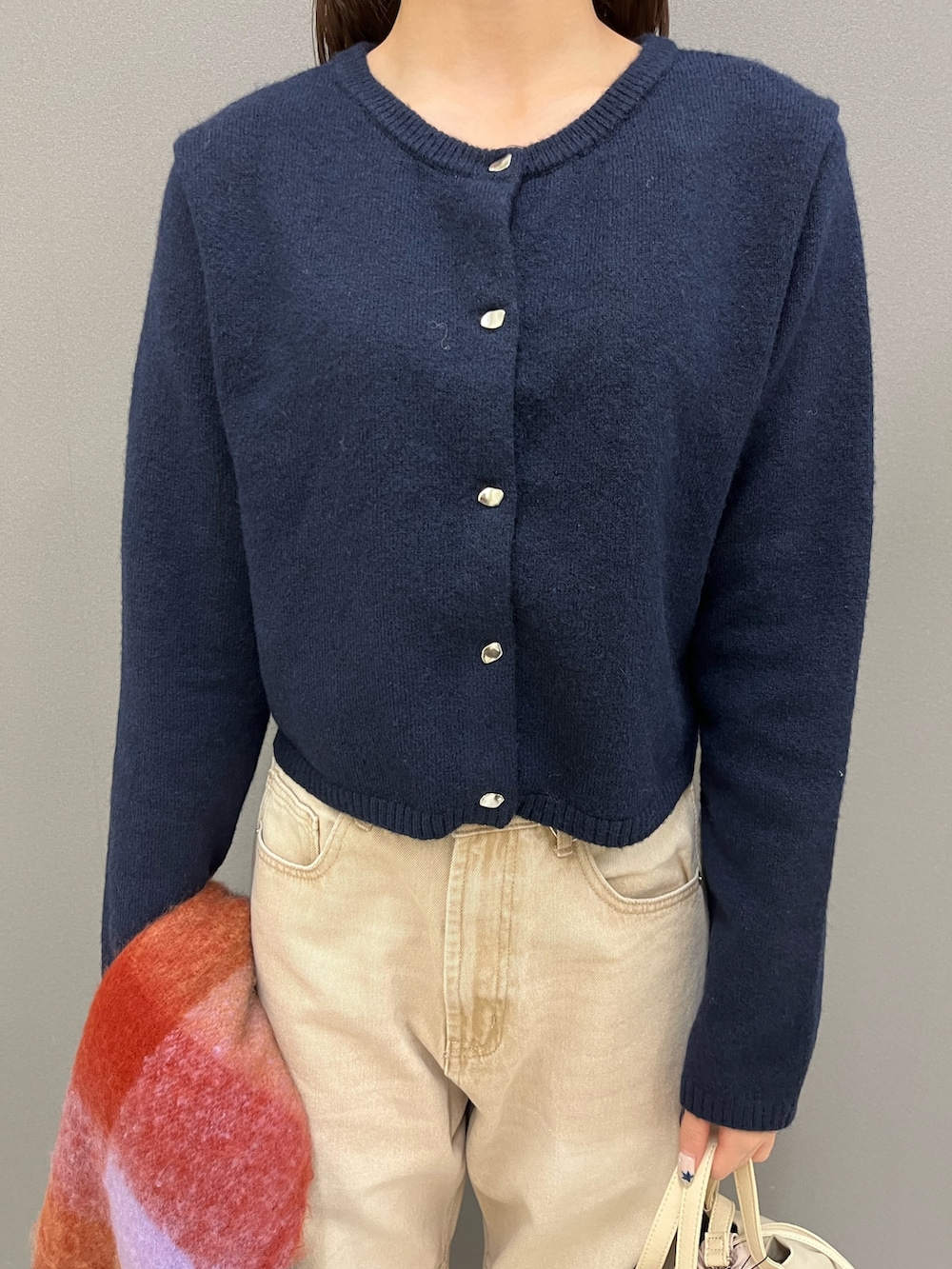 ネイビーのメタルボタンカーディガンに、シルエットが完璧なベージュのカーブデニムを合わせて、シンプルだけど抜け感のあるコーデになっております💙