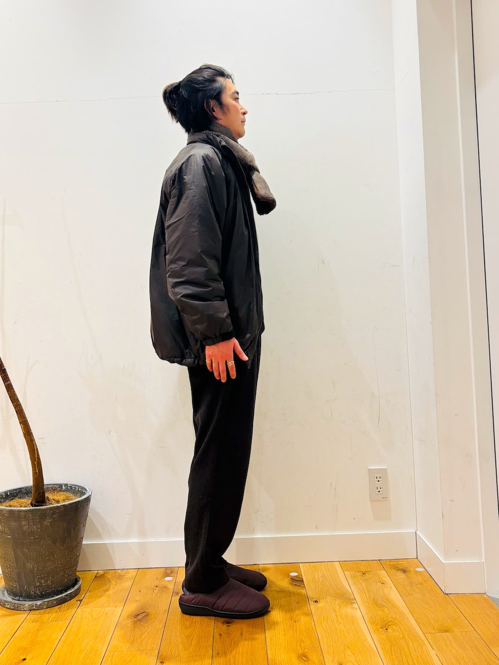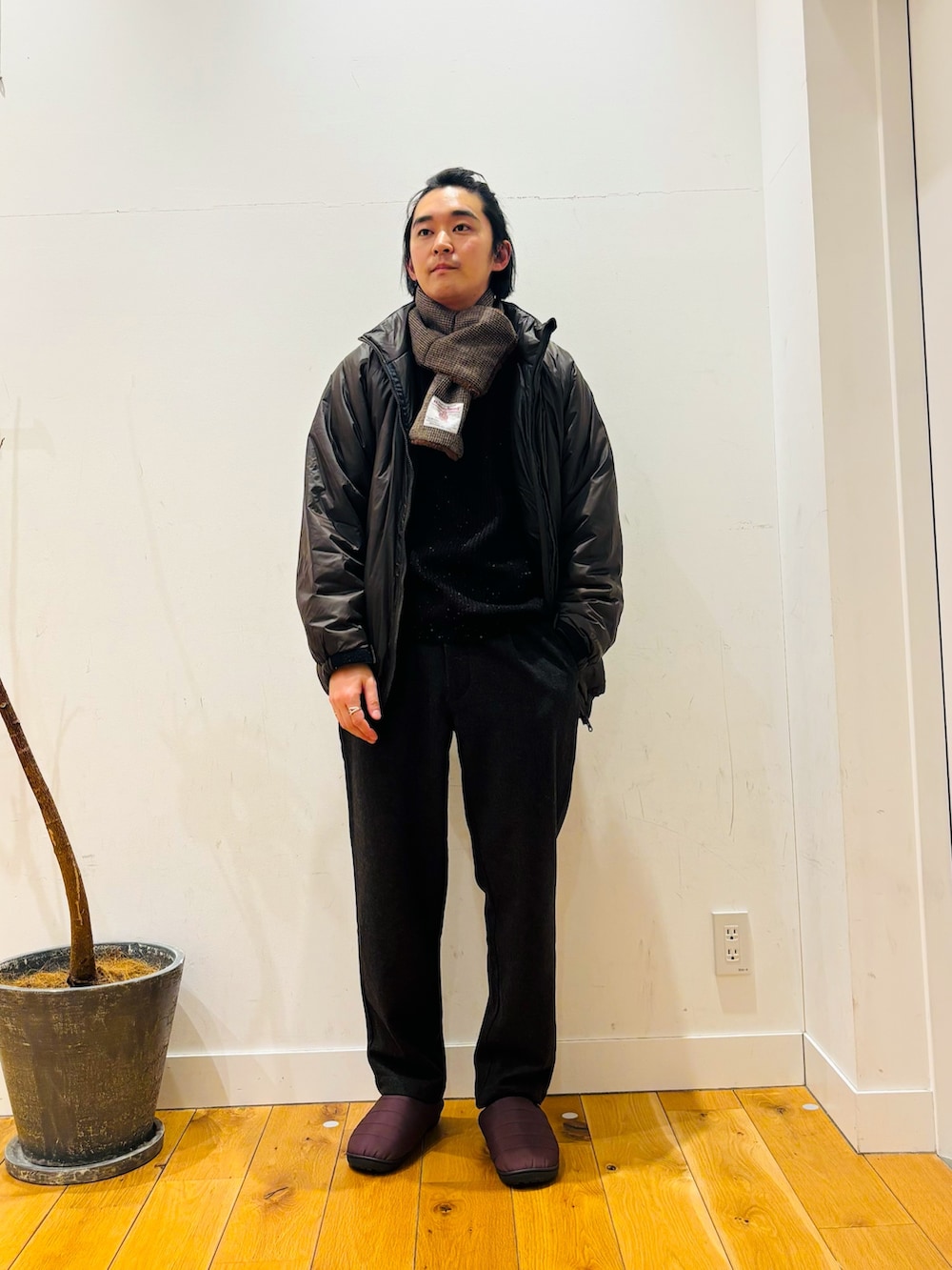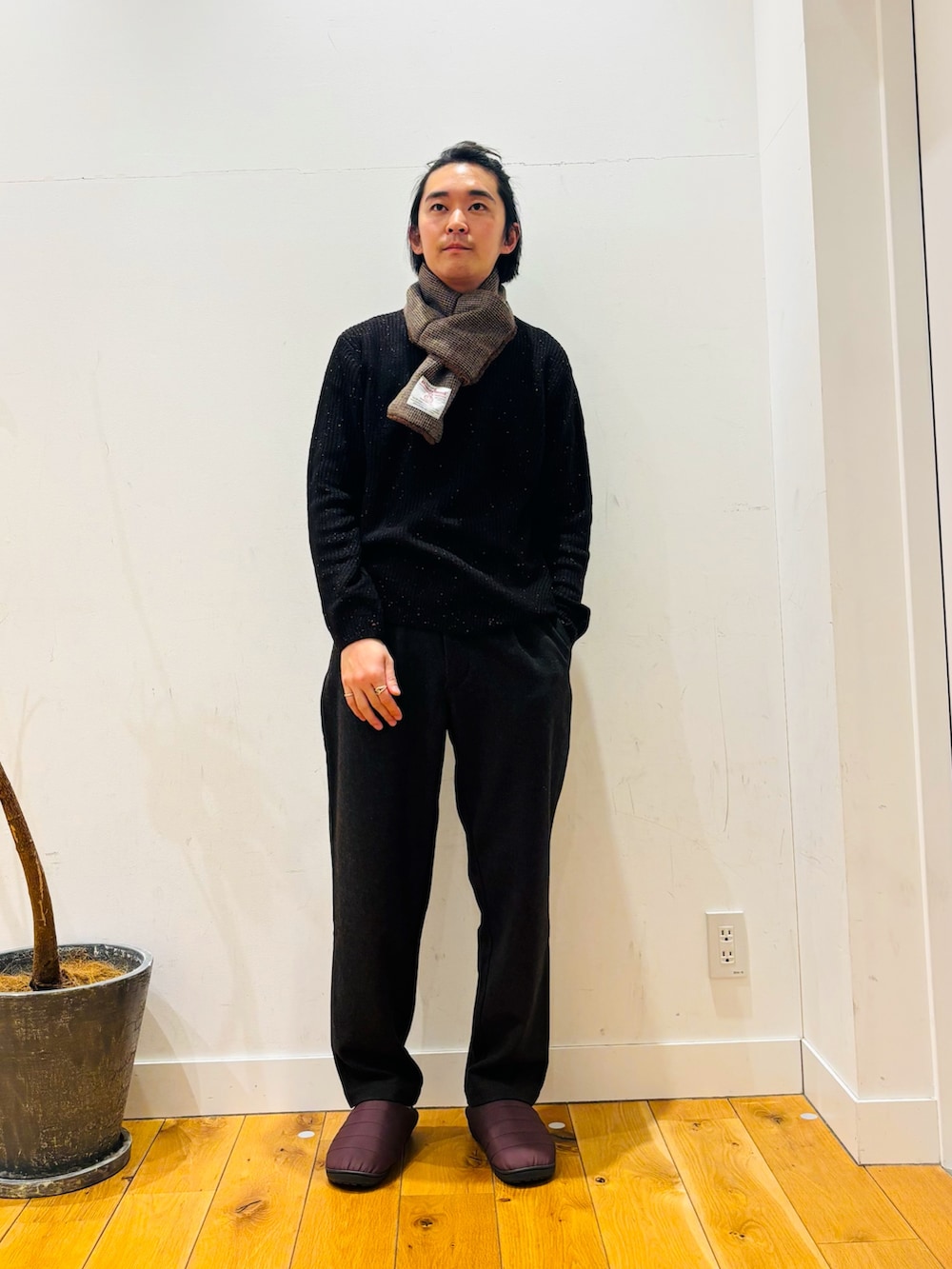 ニットやマフラーで少しキレイのアイテムで合わせて足元でラフなサンダルで合わせるのがポイント!!