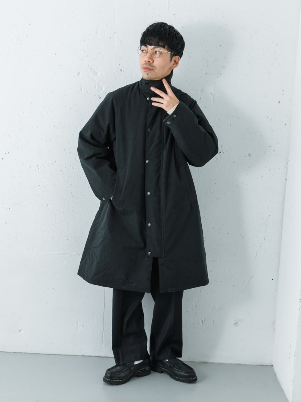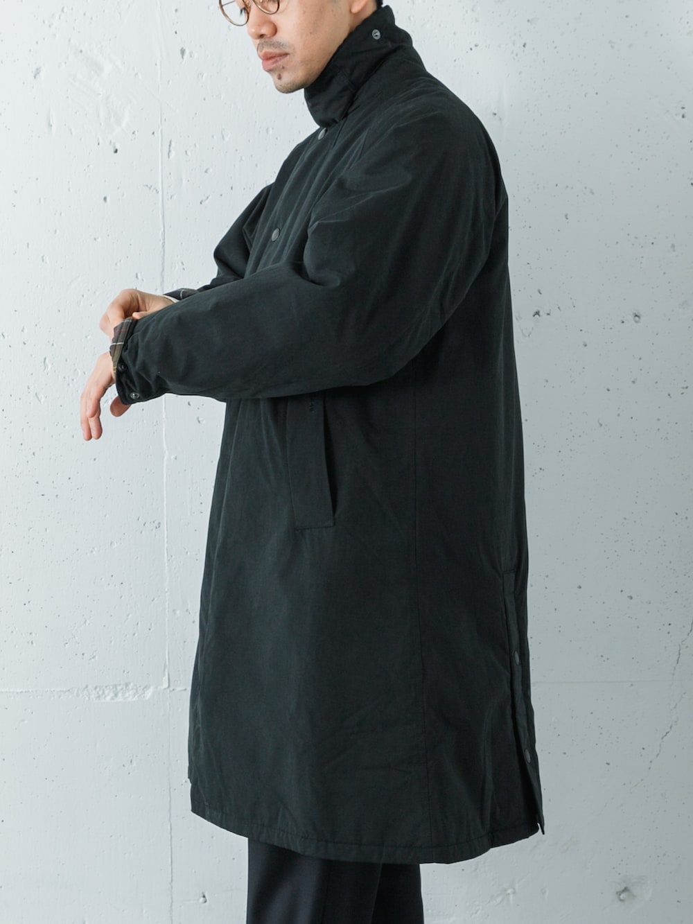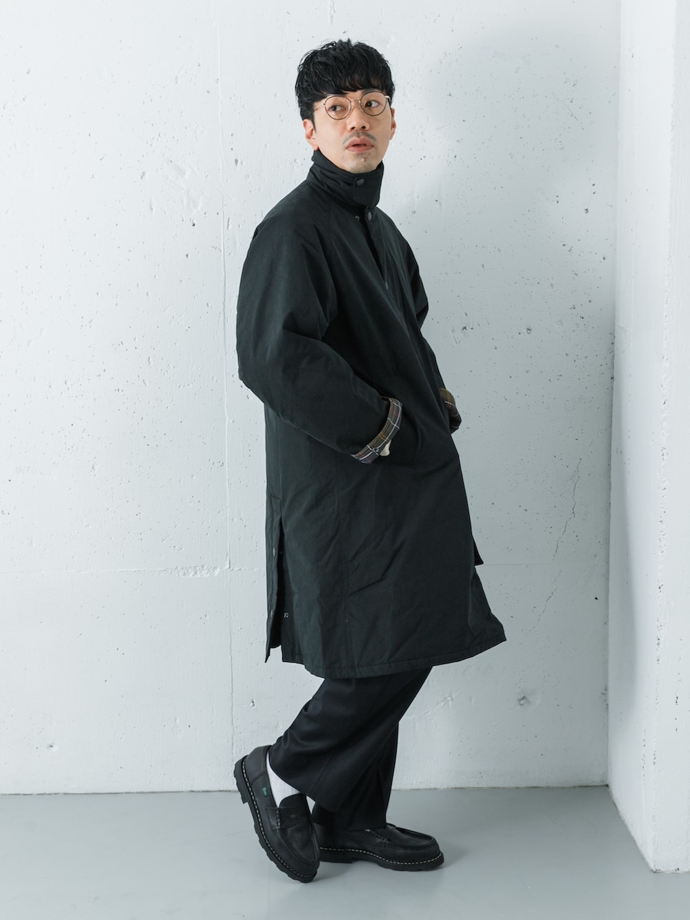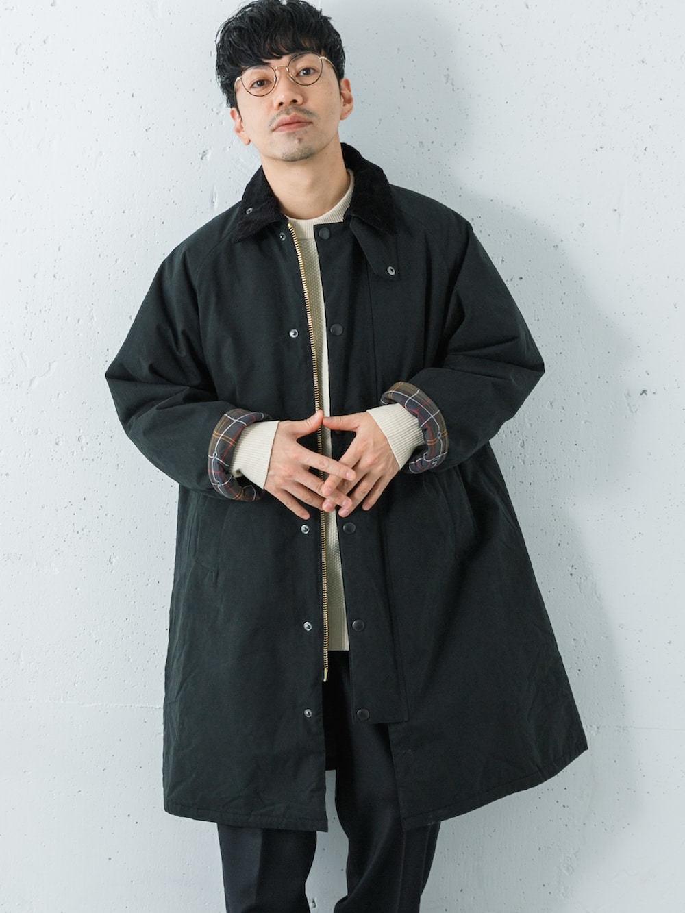 カラーはどちらもブラックでワントーンでまとめてアウターの袖を折り返してチェックをポイントにしました◎