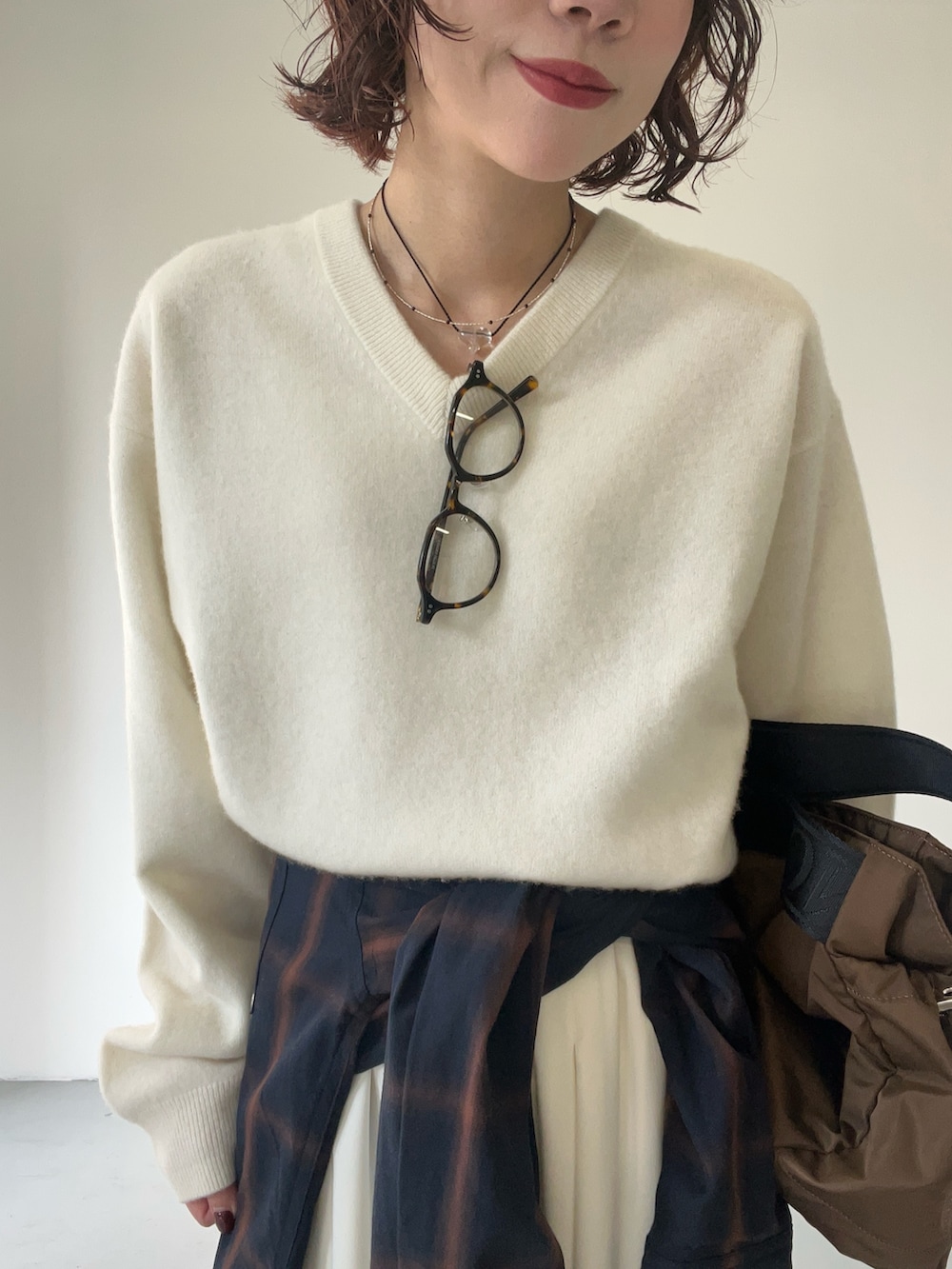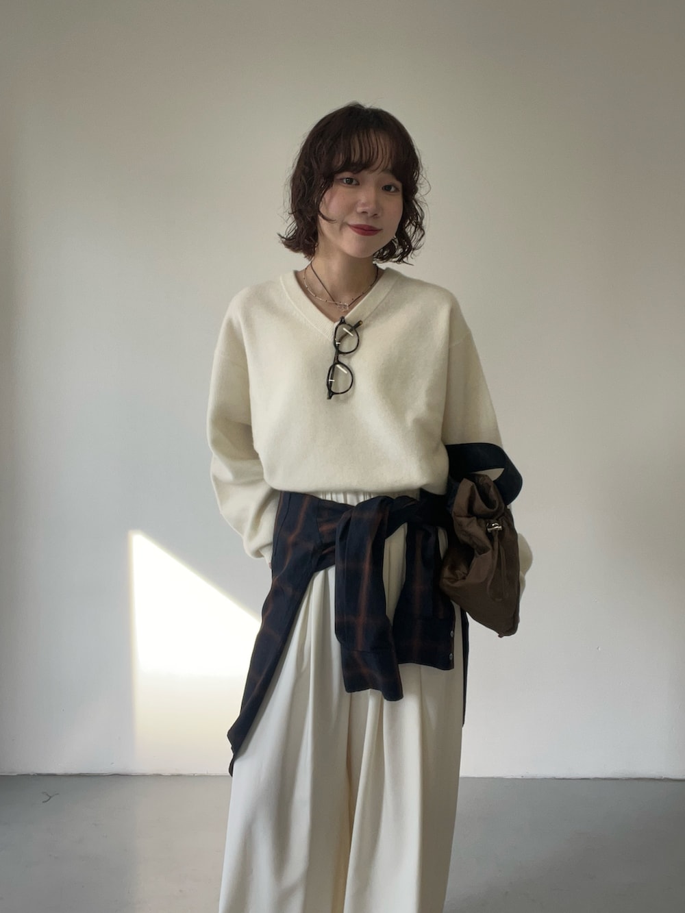 首元は深すぎないVネックなので1枚でも着れ、シャツやカットソートのレイヤードスタイルもおすすめです🌟