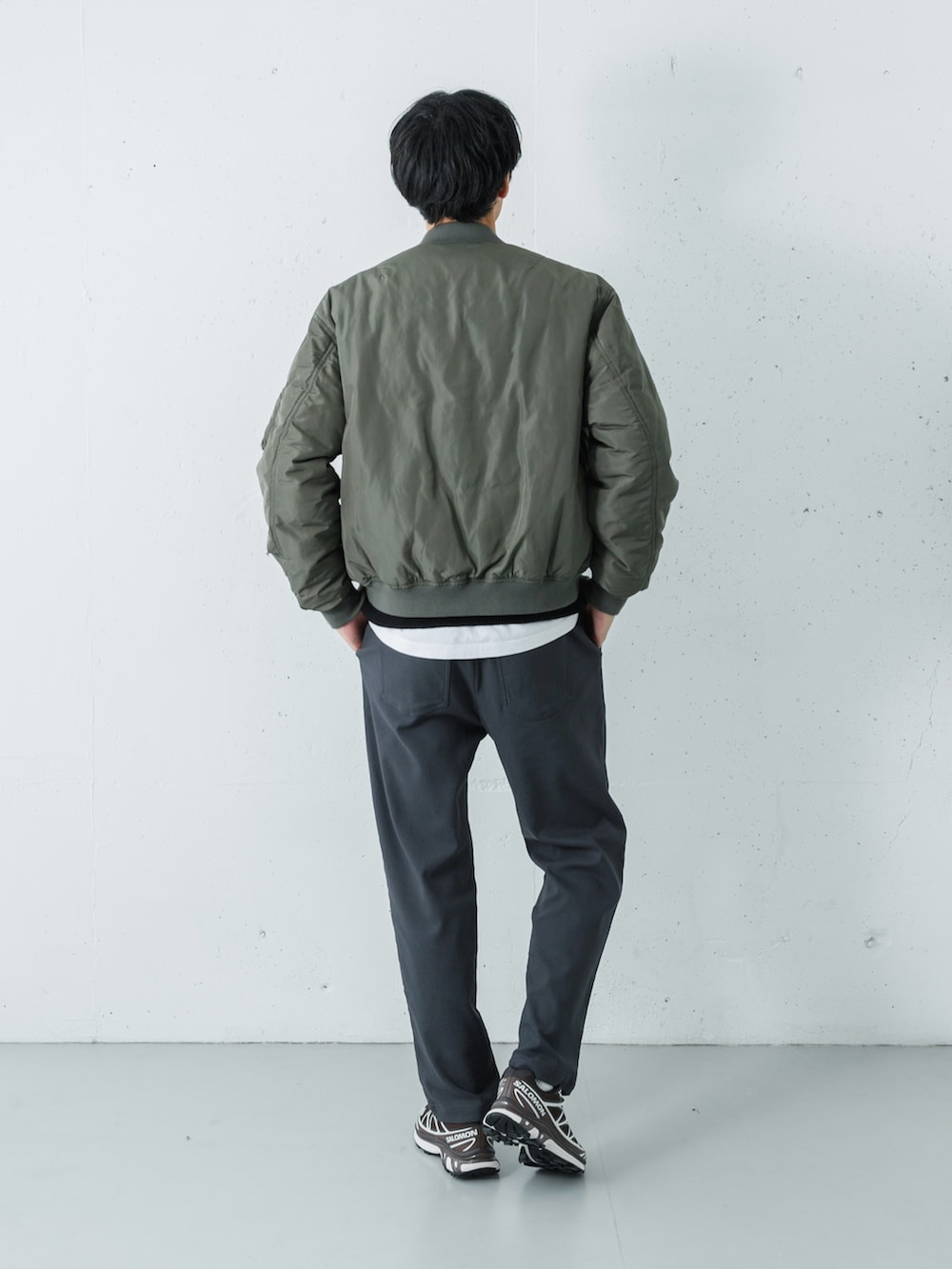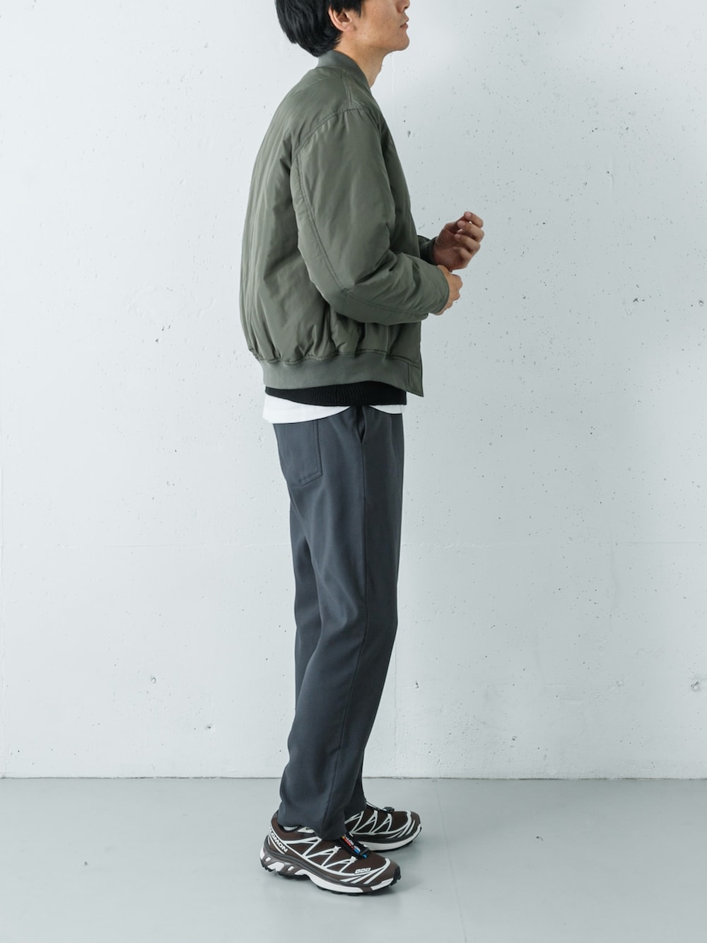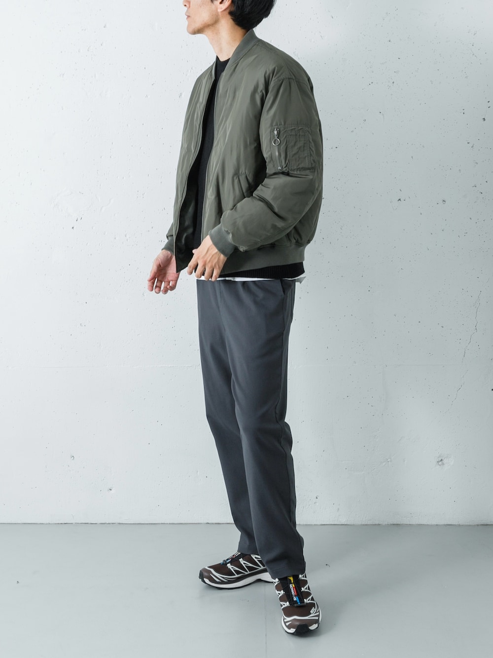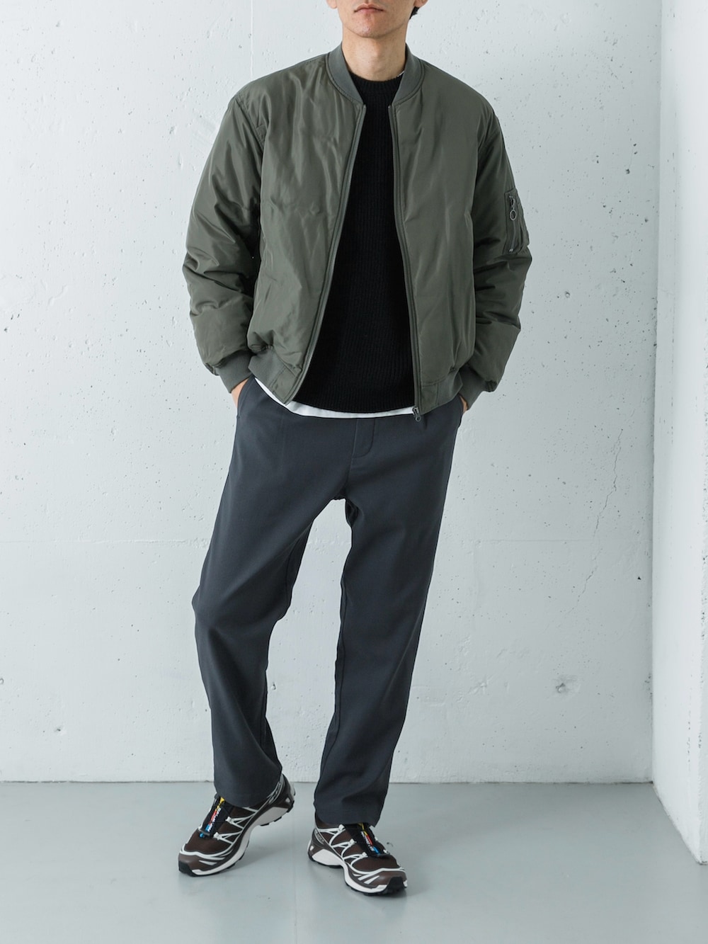 ボトムスには裏起毛のスリムイージーテーパードパンツを選び、暖かさを保ちながらもすっきりとしたシルエットにまとめました。