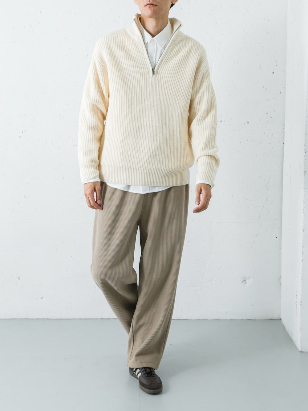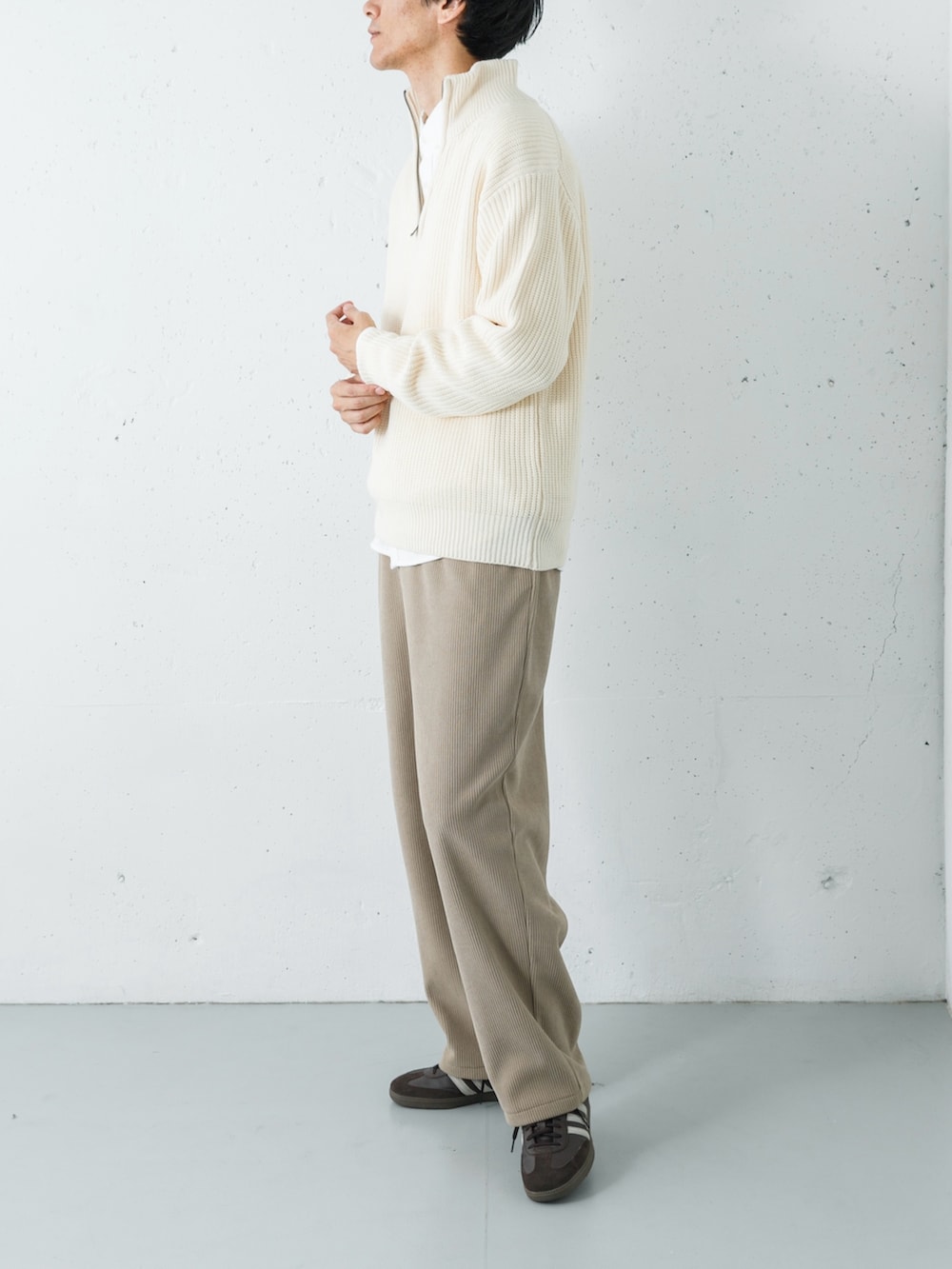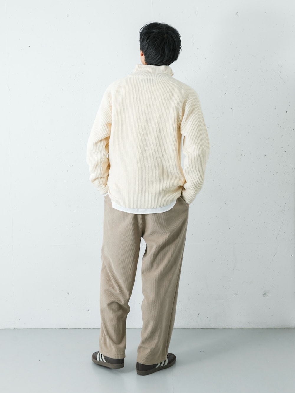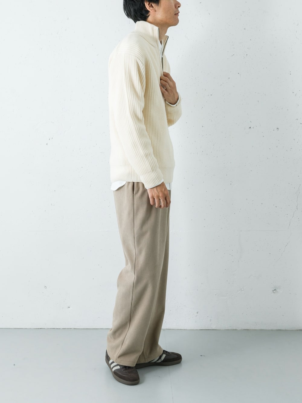 ボトムスには暖かな裏フリースコーデュロイワイドパンツを選び、冬らしい素材感とリラックスしたシルエットを構築しました。