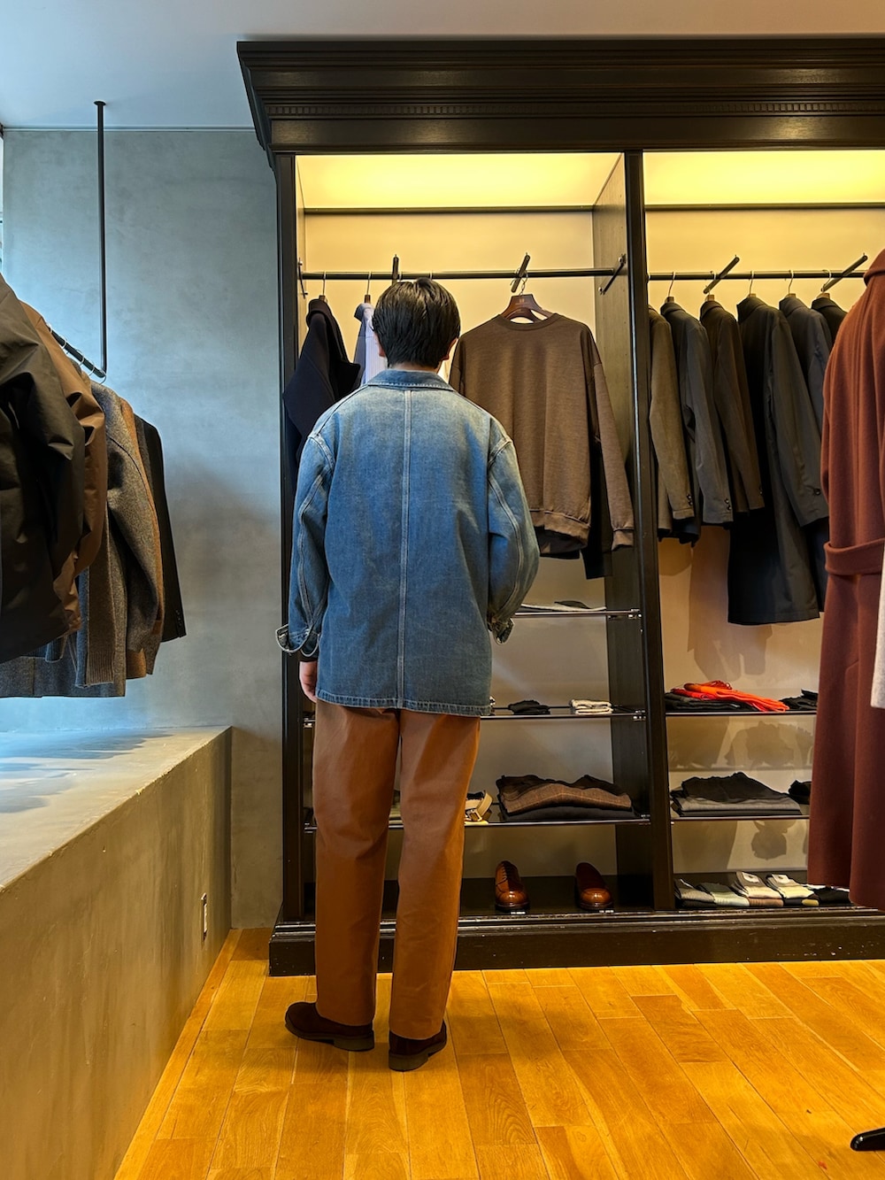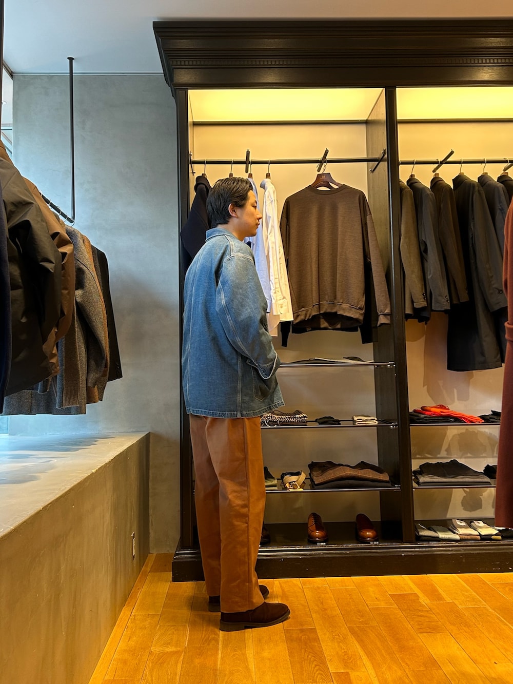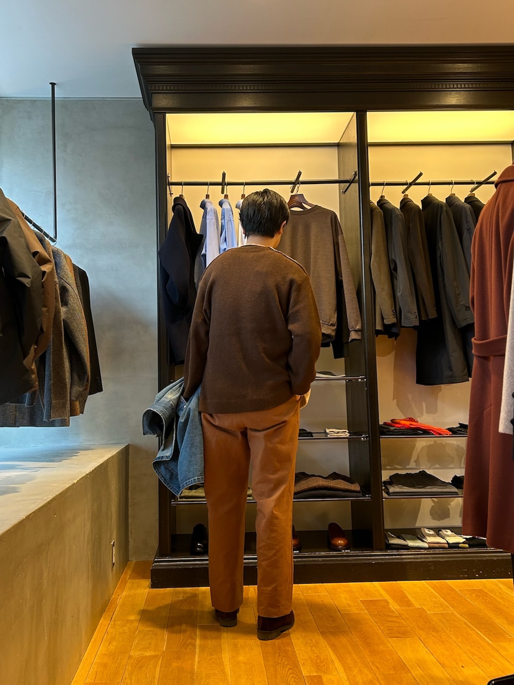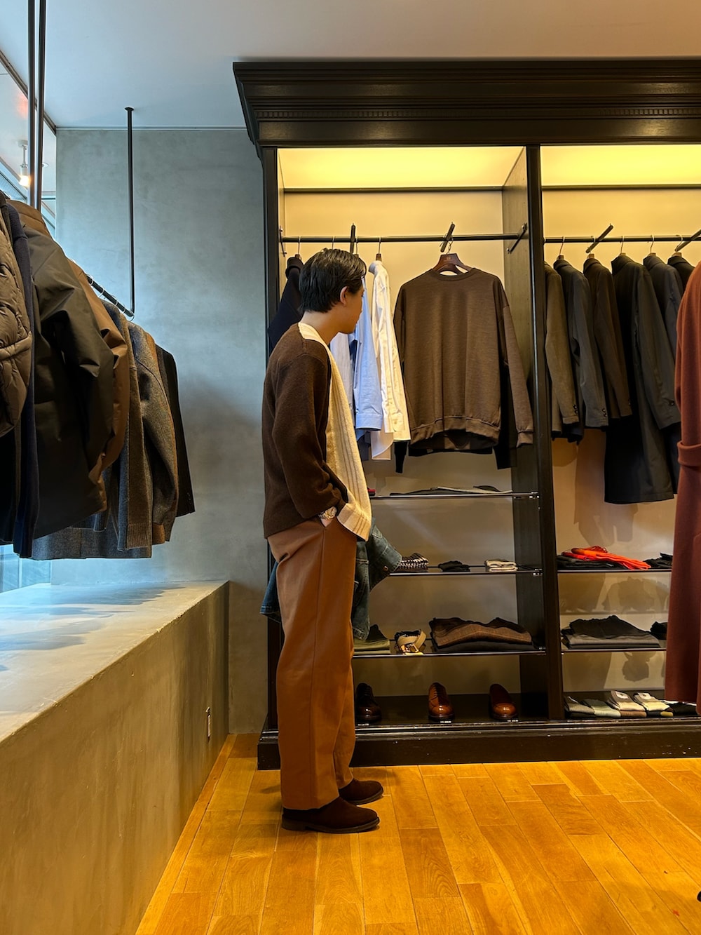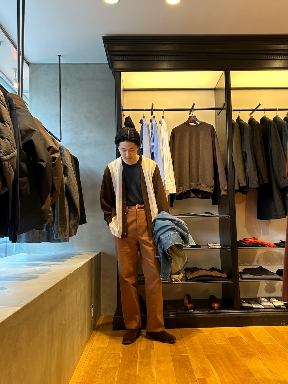 新作UNDYED ALPACA STRIPE CARDIGANでのスタイリングです。