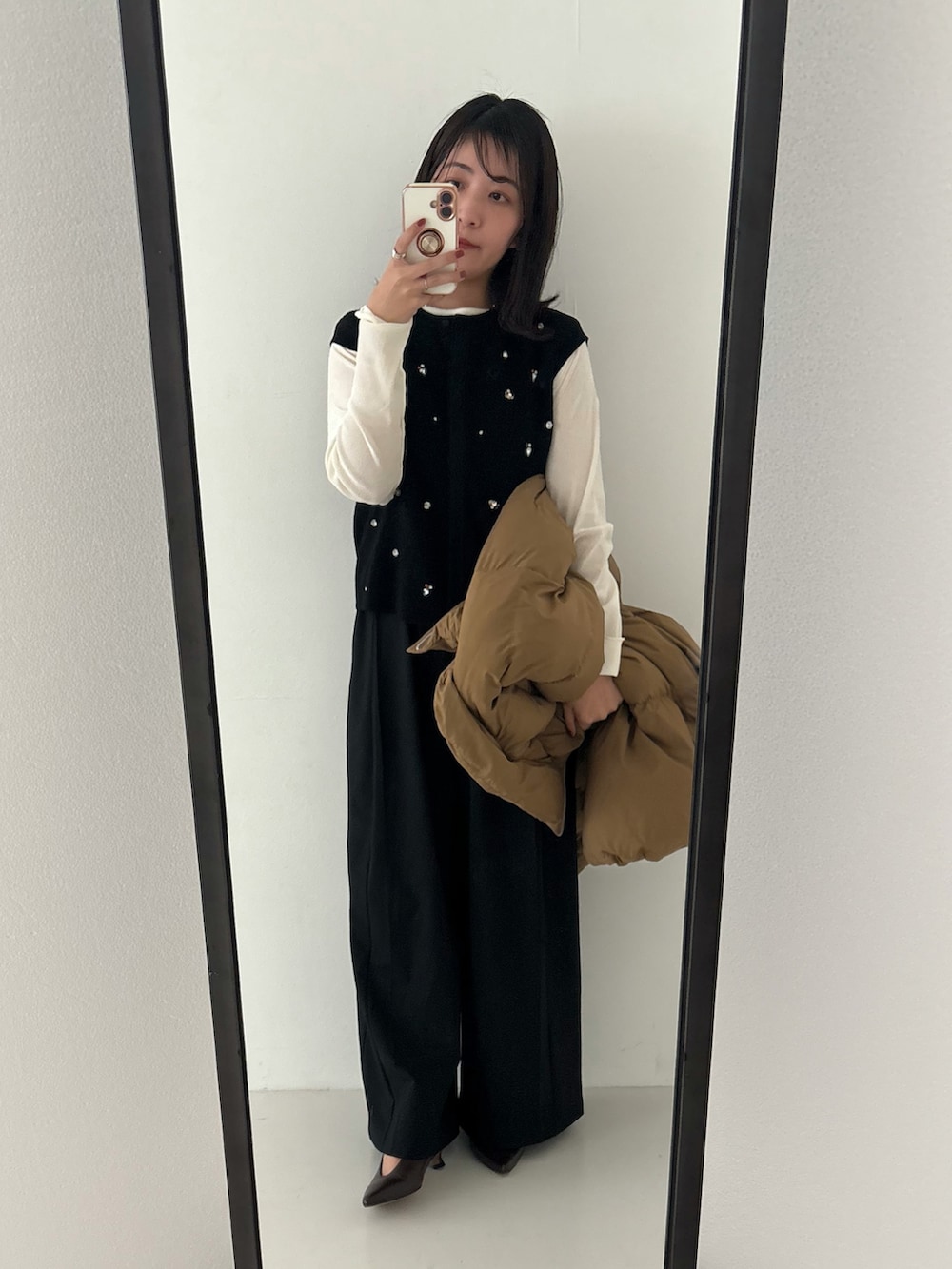 ビジュー使いですが、ニットがワッフル網みで少しカジュアル感があり、普段使いしやすいデザインです。