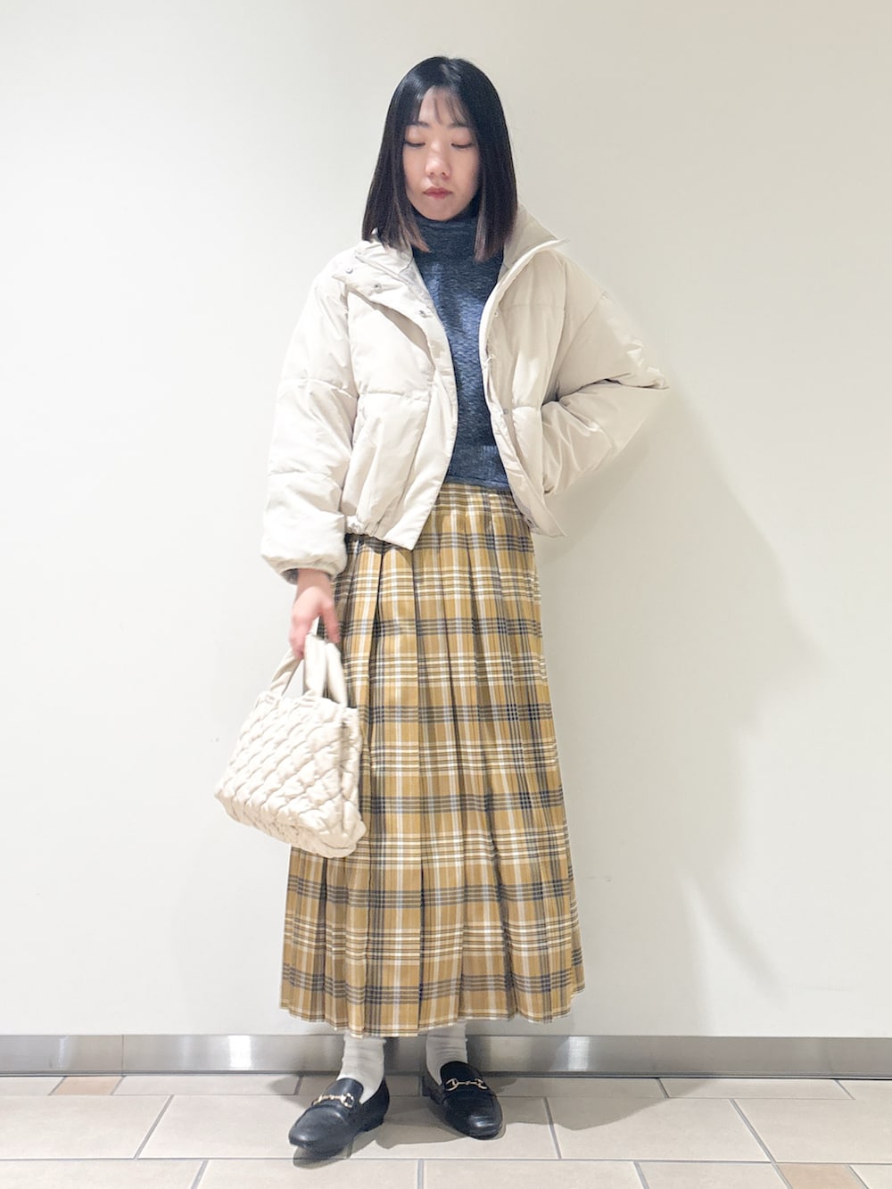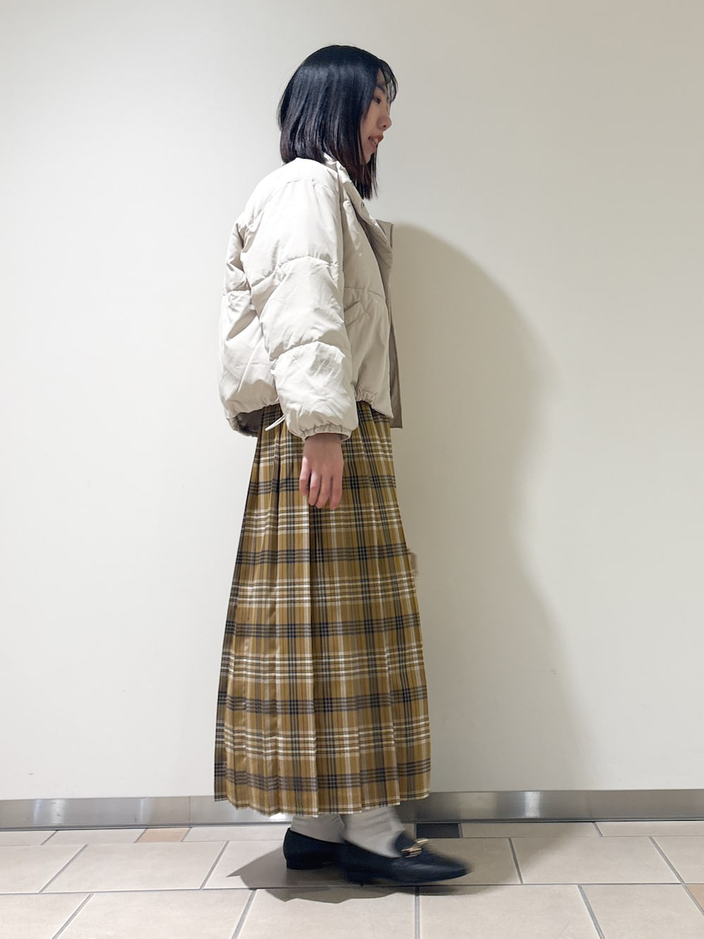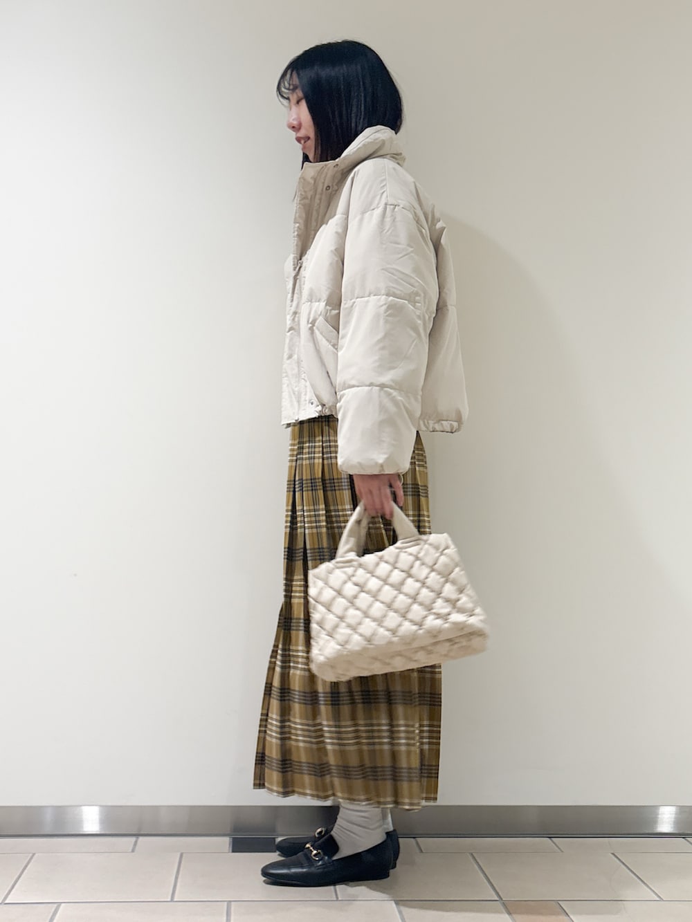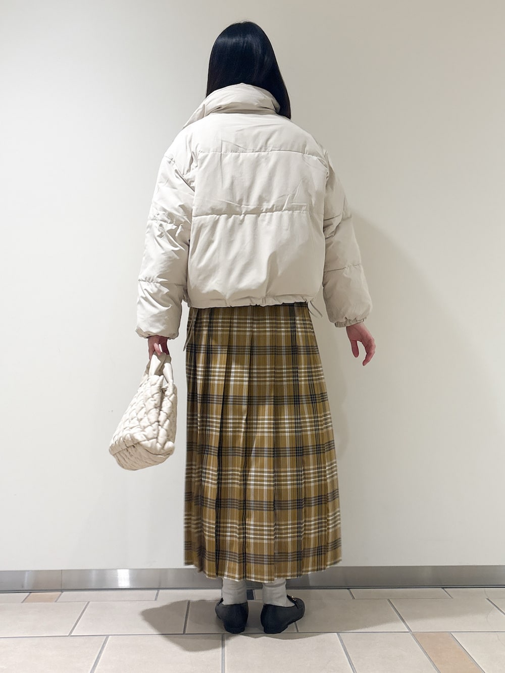 アウターにはチェックスカートとリンクさせた明るい色をチョイスしました!中綿なのでとっても軽く、マットな質感が上品見えします◎