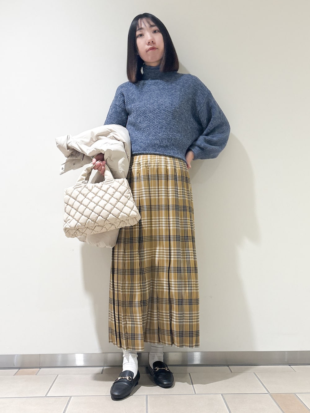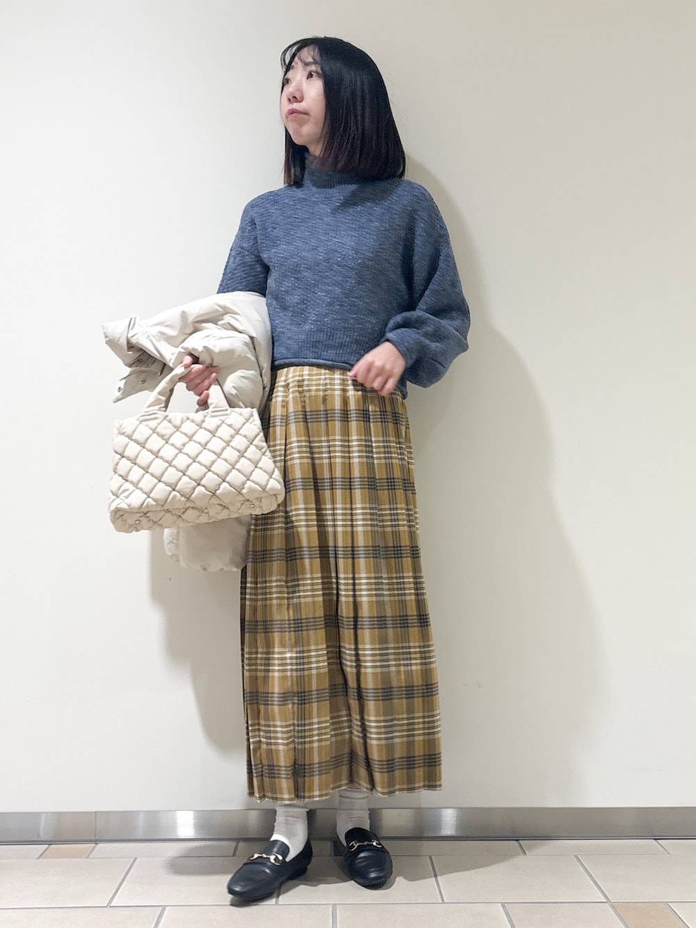 トップスには反対色に近いブルーのニットを合わせました!丈が短めなのでインしなくてもスッキリ、ウエスト位置が高く見えます^^