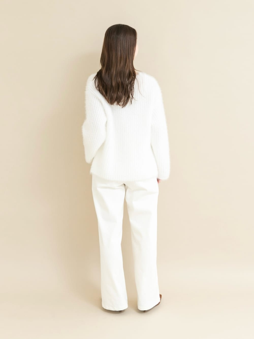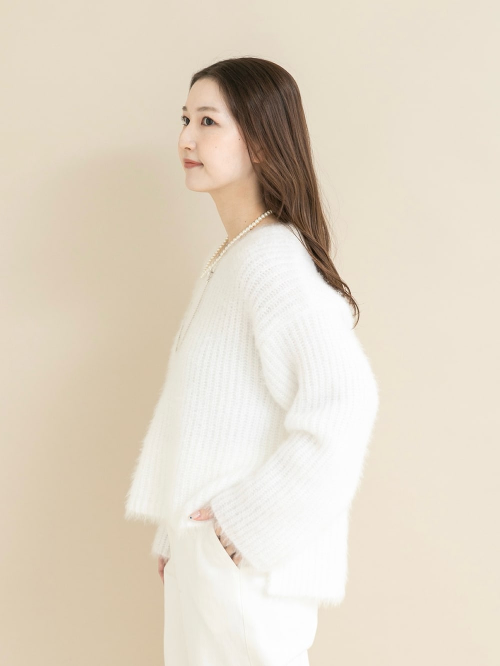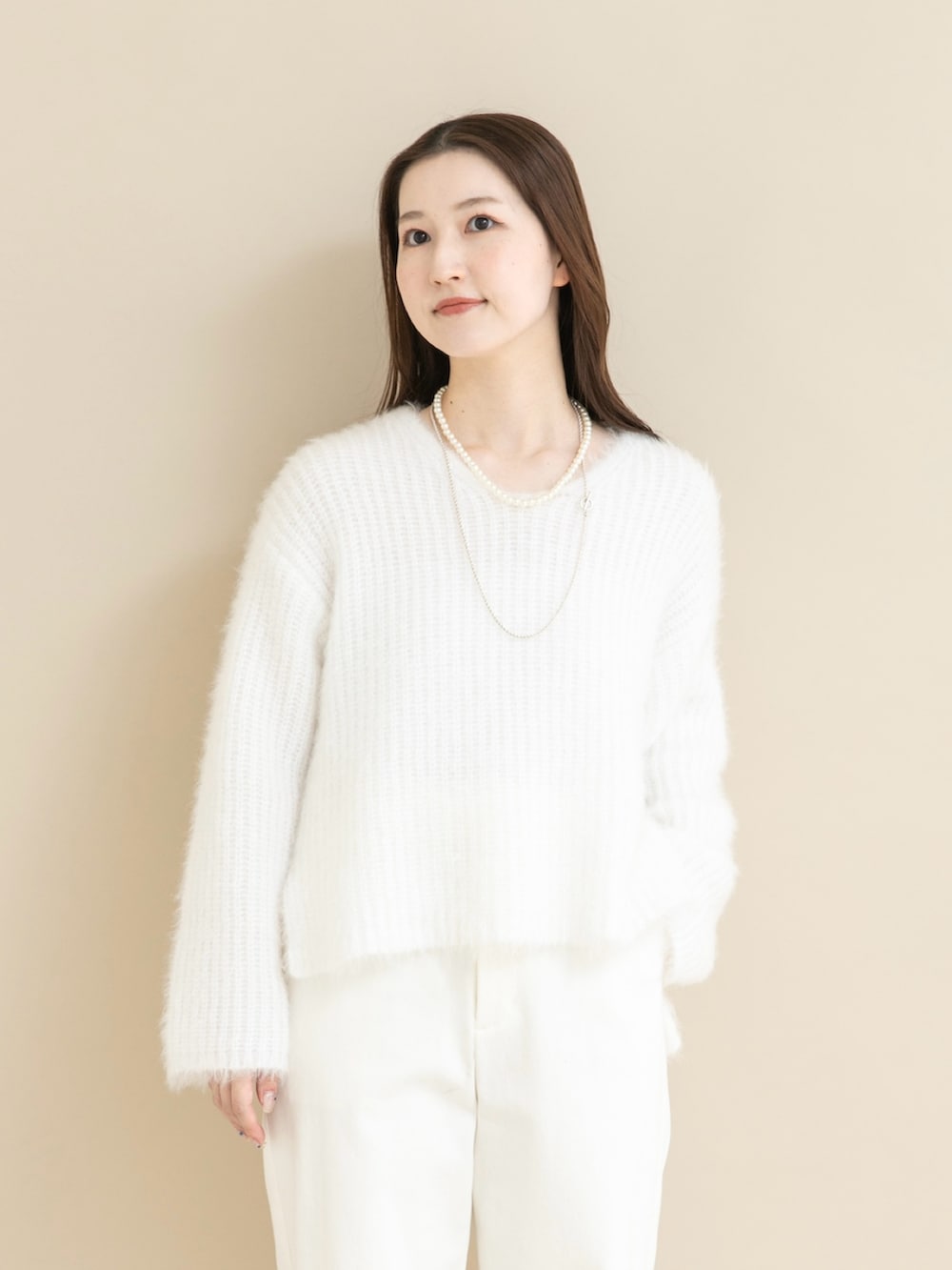 程よく開いたVネックで、お首周りをスッキリ見せてくれますよ。