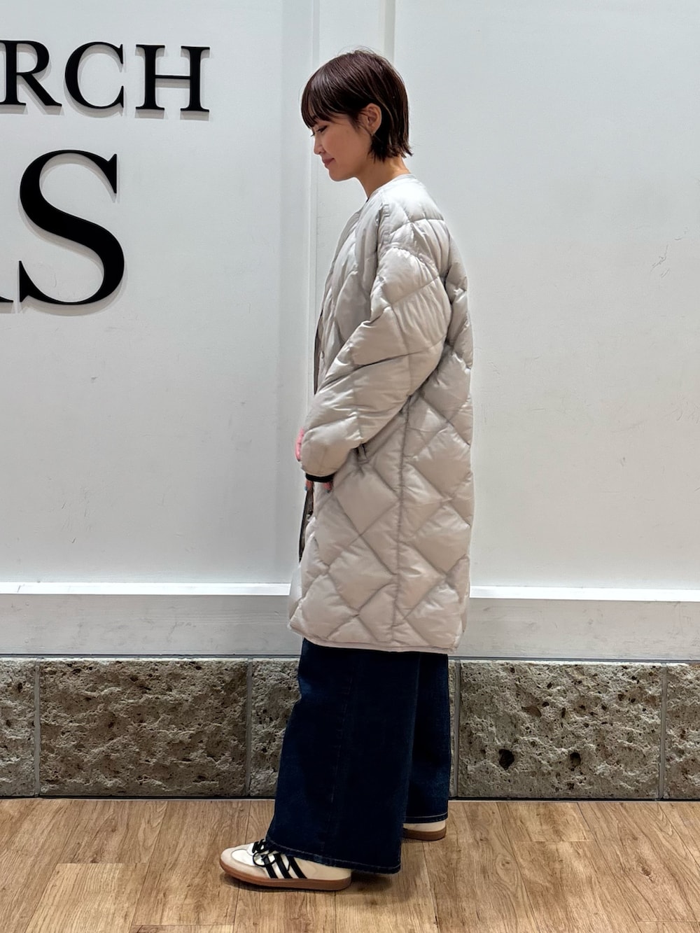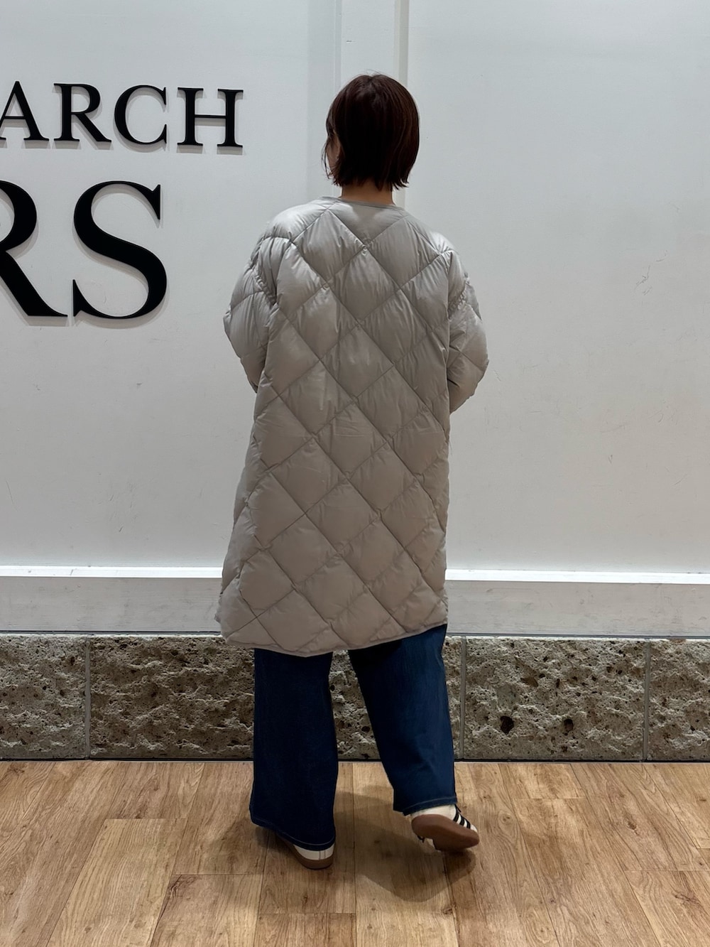 キルティングロングコート入荷しています。撮影で羽織っただけでもあたたかく、そしてとても軽いです!158cmで膝上くらいの長さです。膝まで隠れると体型カバーにもなっていいですよね◎