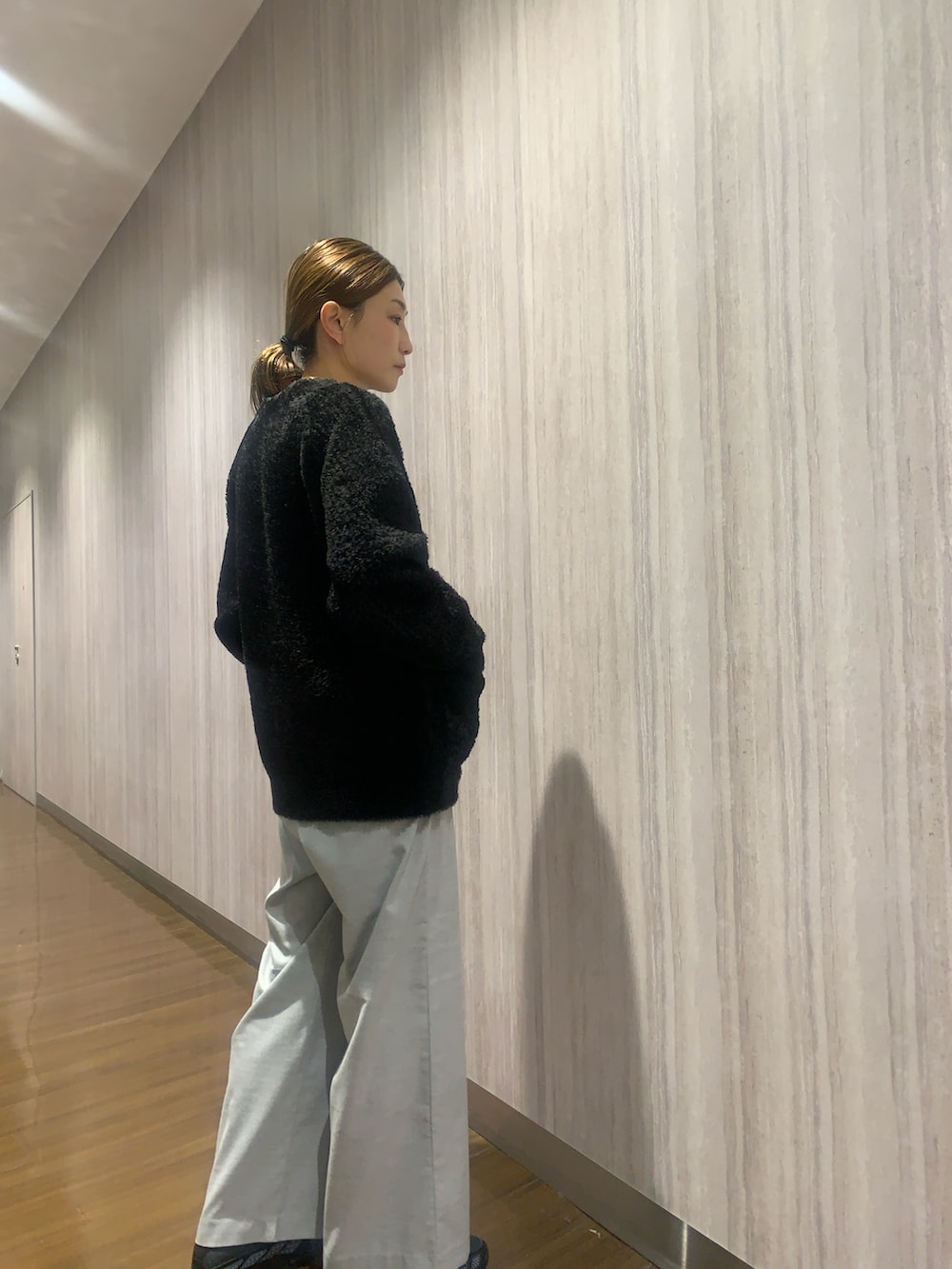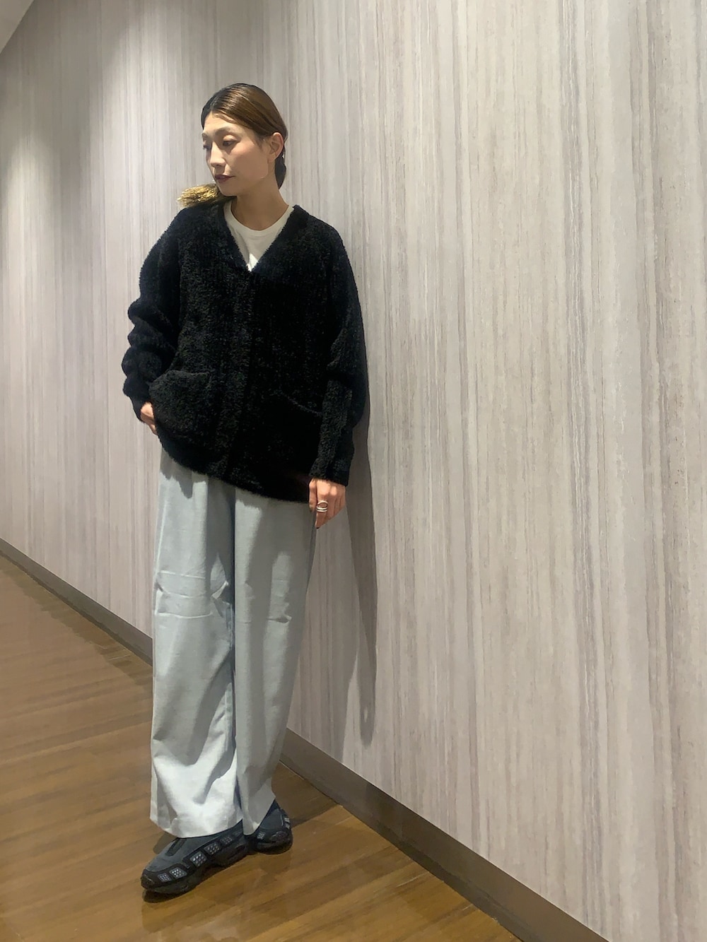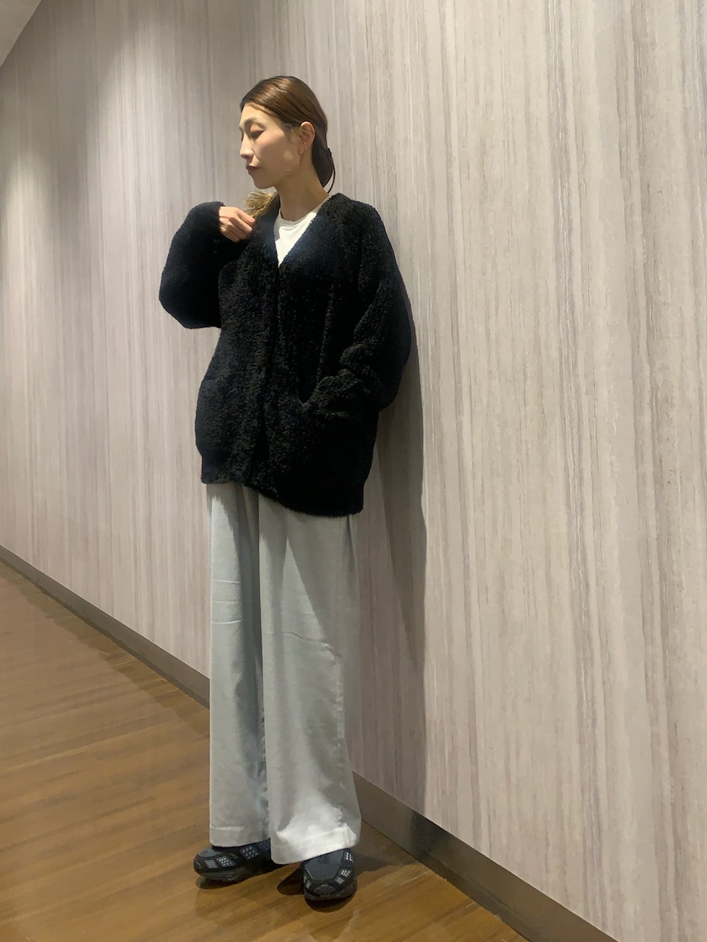 ボトムは、微起毛・裏起毛を施したウールライクイージーワイドトラウザー。カラーニットに合わせても◎