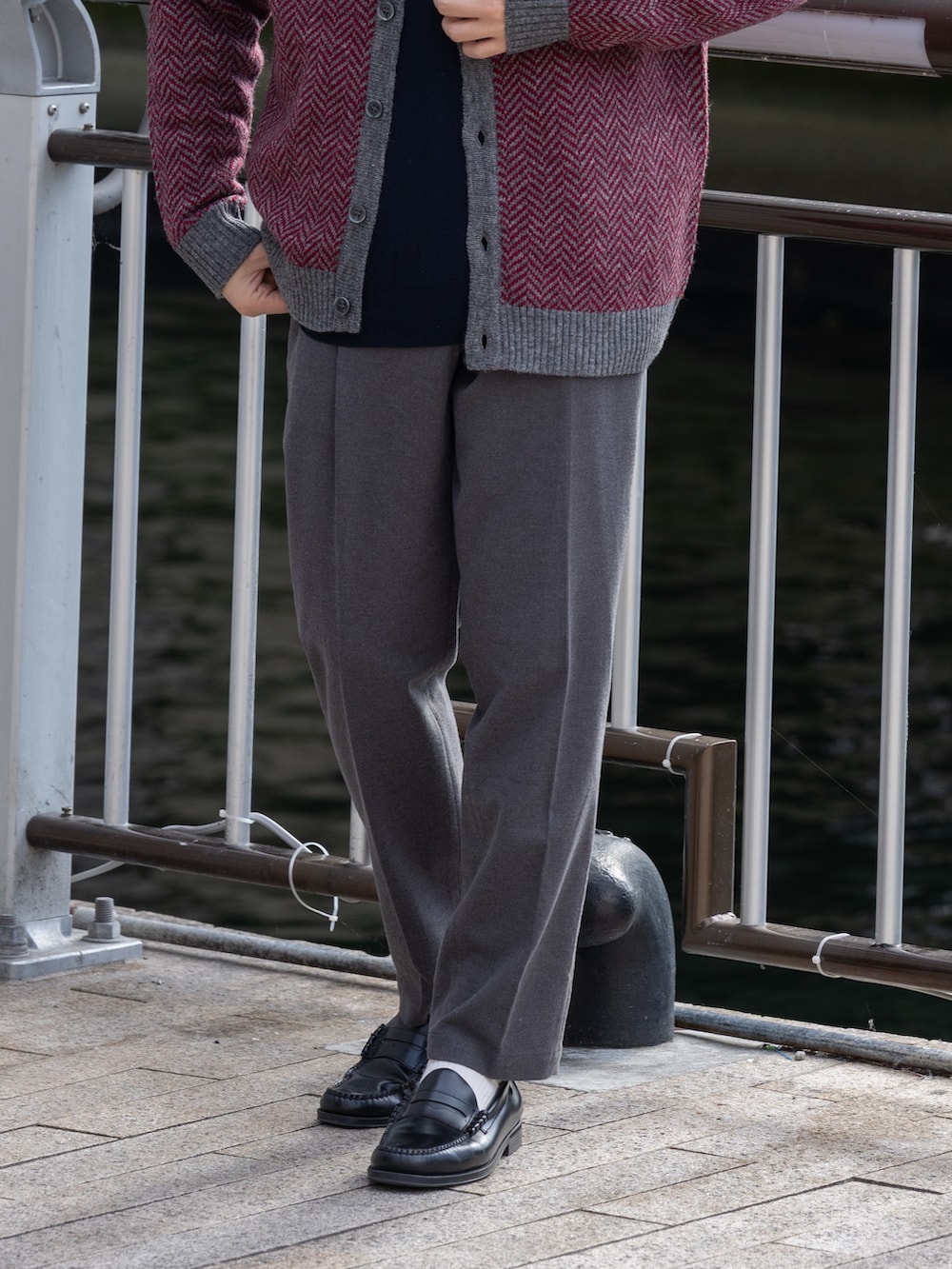 スラックスはきれいめスタイルに相性の良いシルエットであLサイズにしたことで少し緩さがアップしてカジュアル寄りになります。