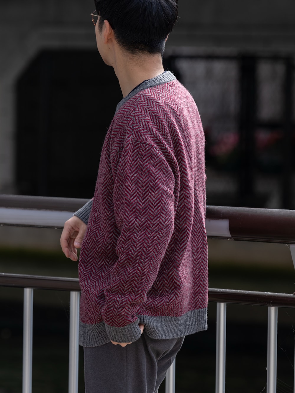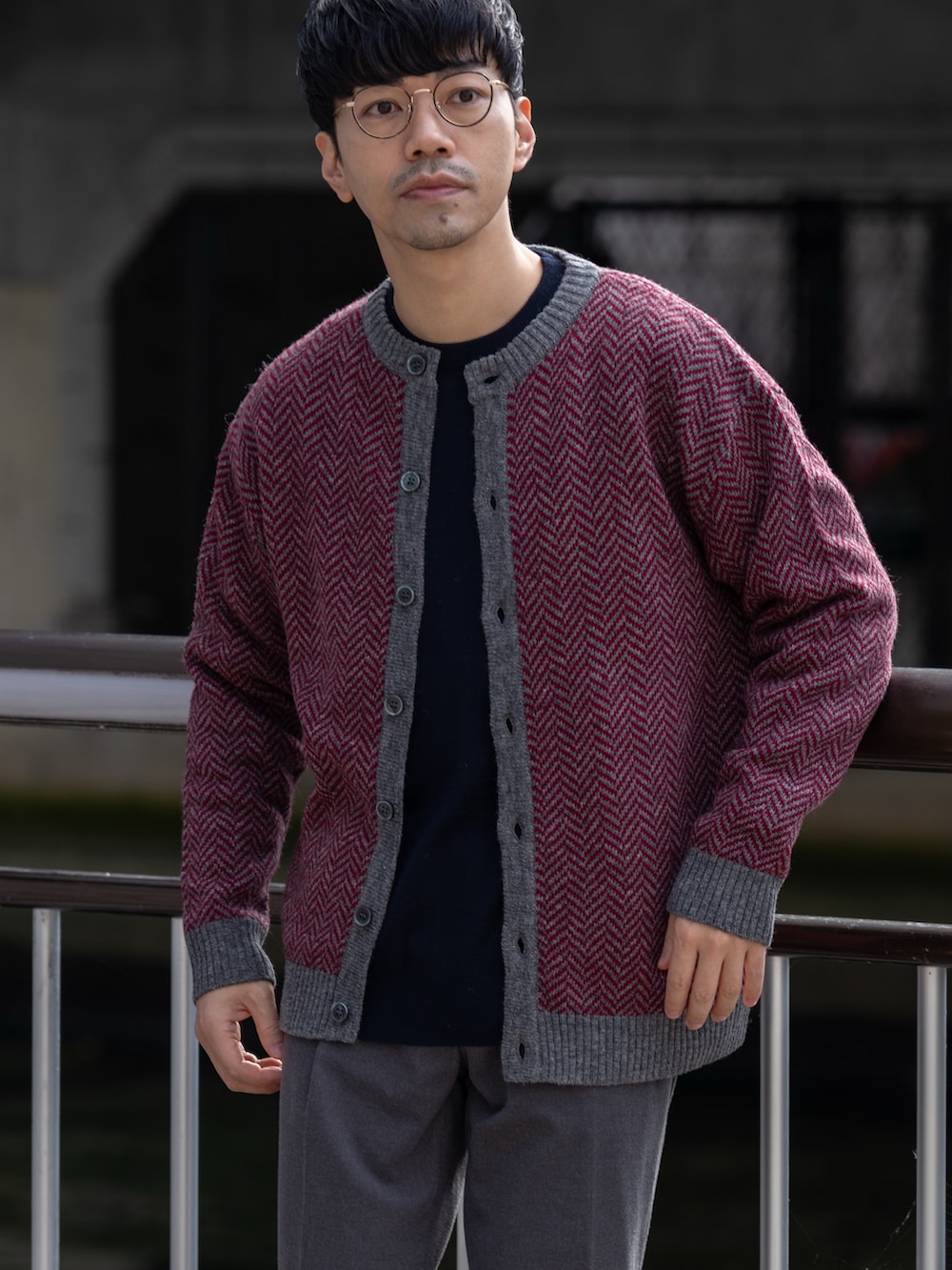 ROSSO『XLサイズあり』ヘリンボーン柄クルーニットカーディガン- カラー: