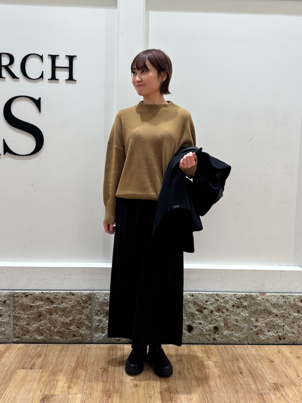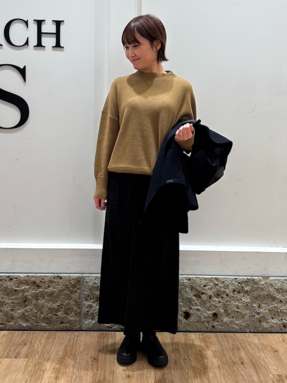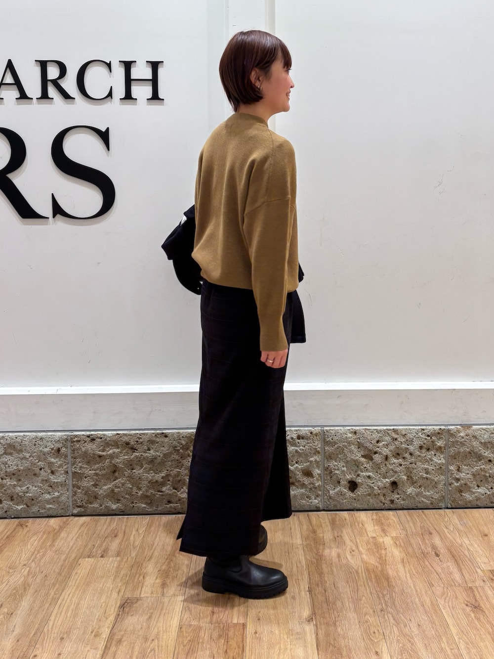 ボトルネックニットプルオーバー着用しています。ほどよい丸みのあるシルエットなのでスカートなど女性らしいアイテムとの相性が特にいいですね◎イエローカーキは落ち着いた印象で着ていただけますよ☻