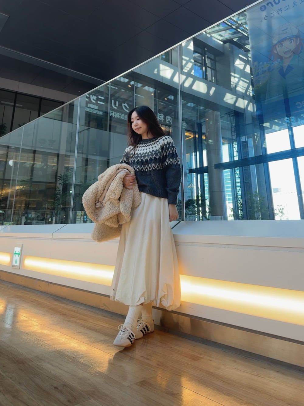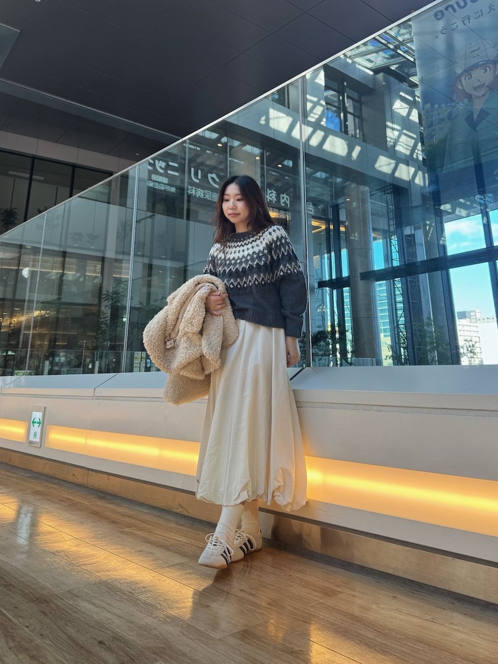 トップスに、ノルディック柄ニットを合わせてみました🤍🩶