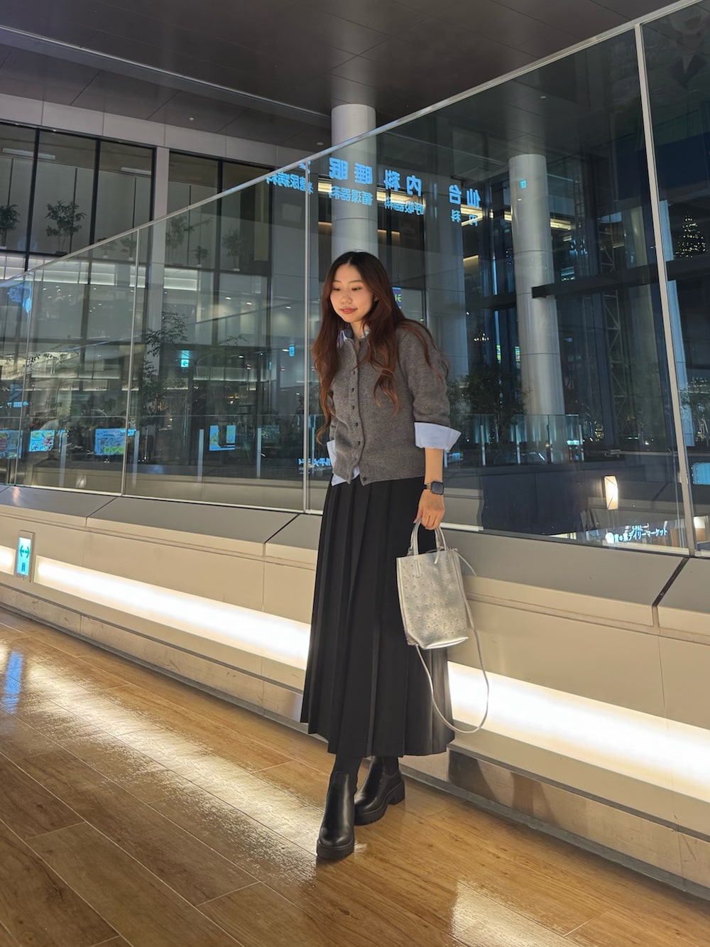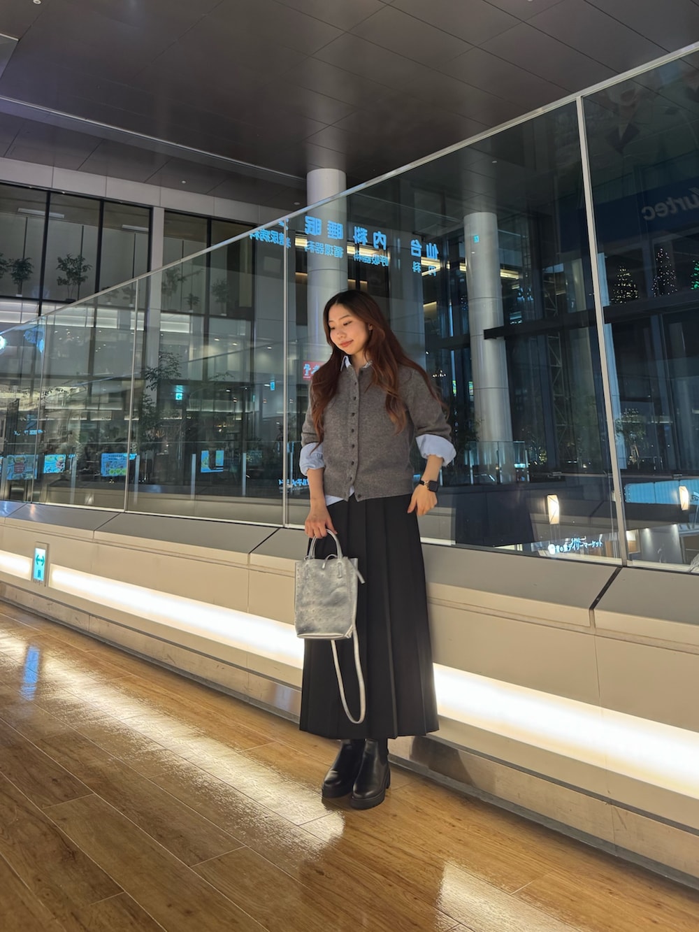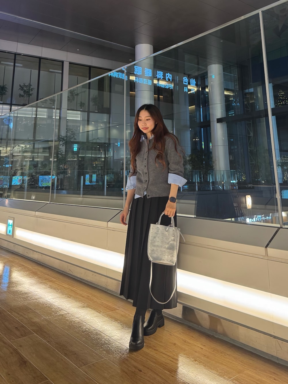 ウールニットシリーズのカーディガンに、シャツをレイヤードした重ね着コーデ🩶