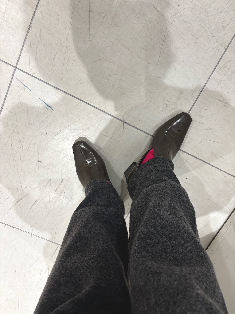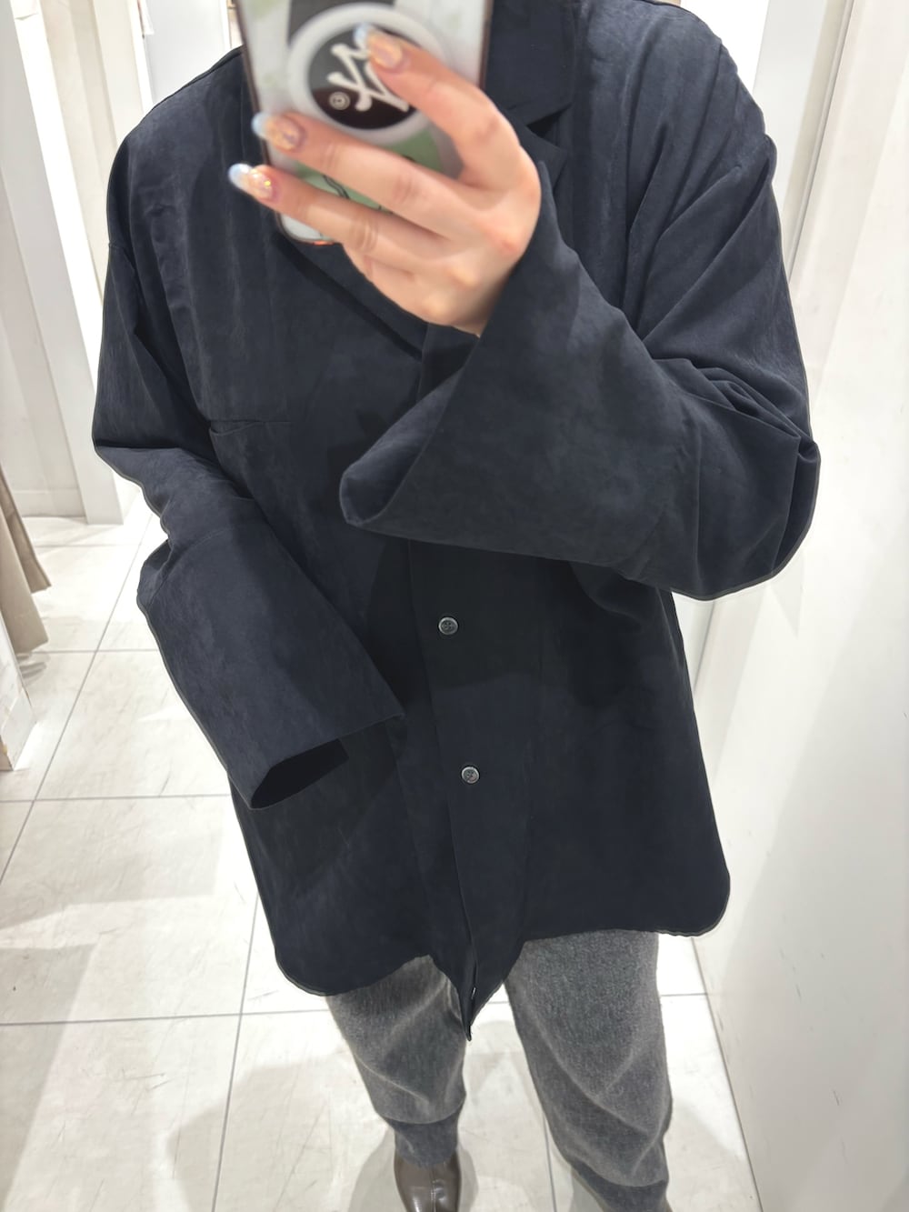 ブラックとグレーでまとめつつ、ピーチスキンのシャツやニットパンツなどテクスチャーで温かみをプラスしてみました。