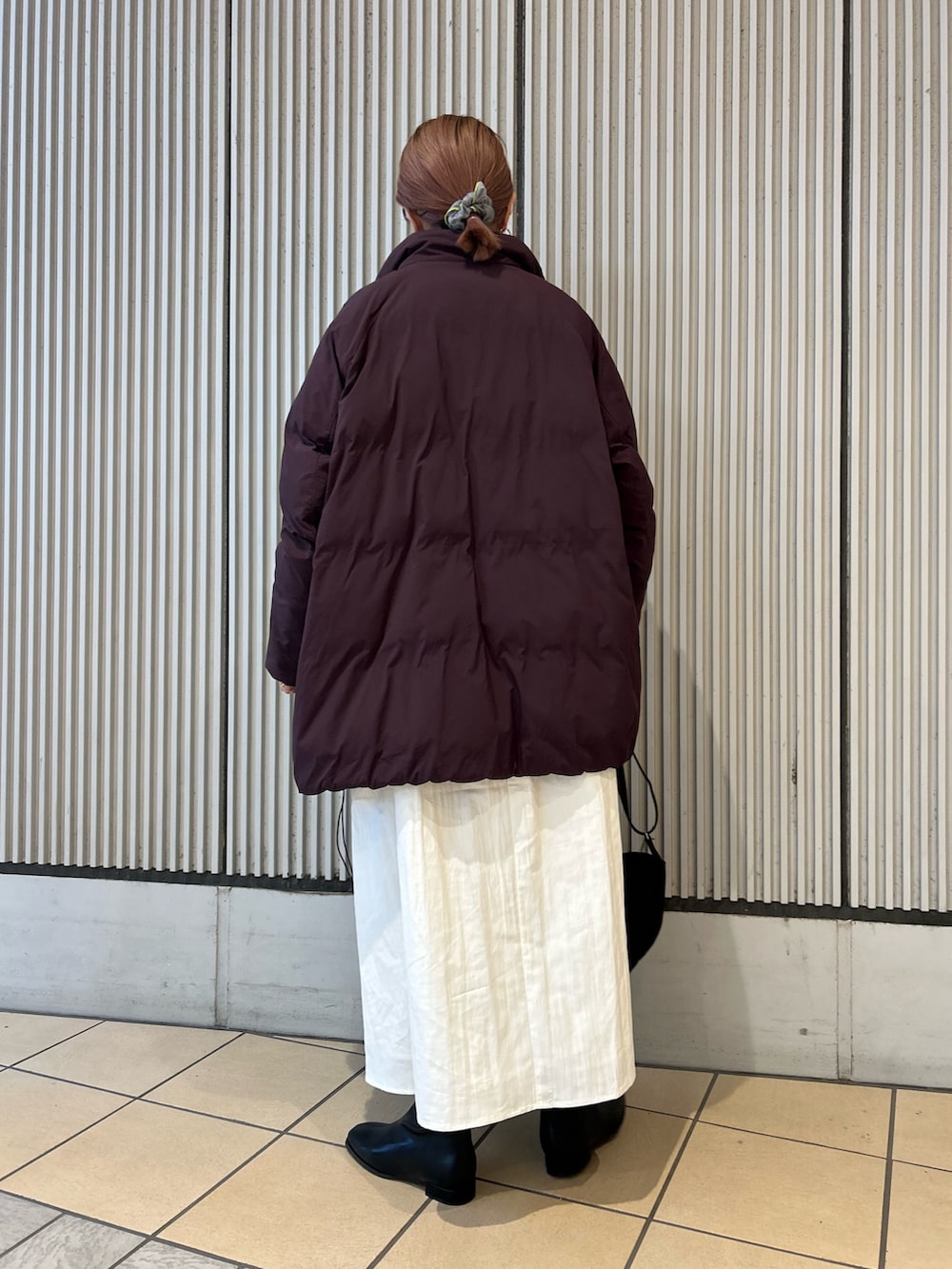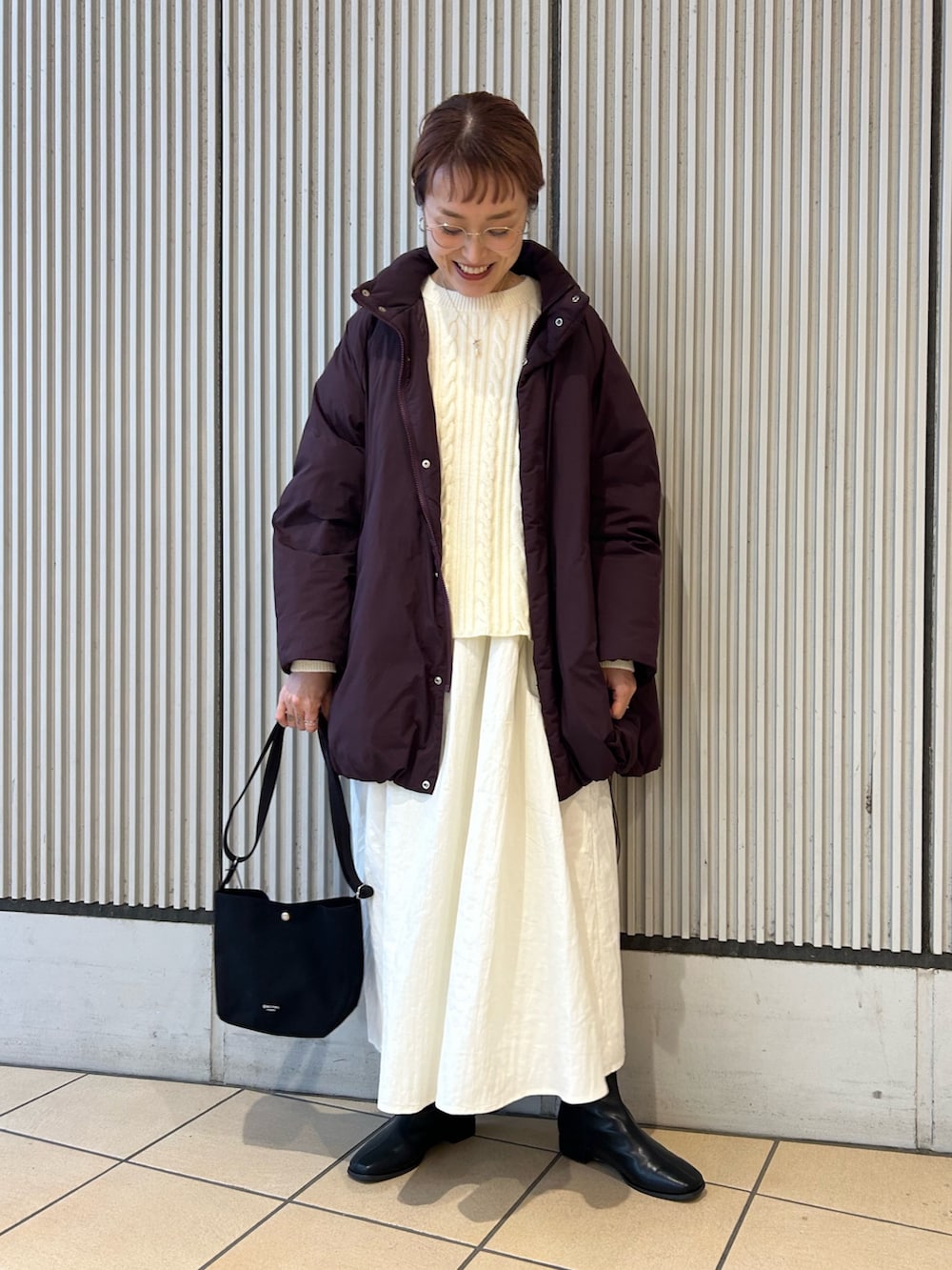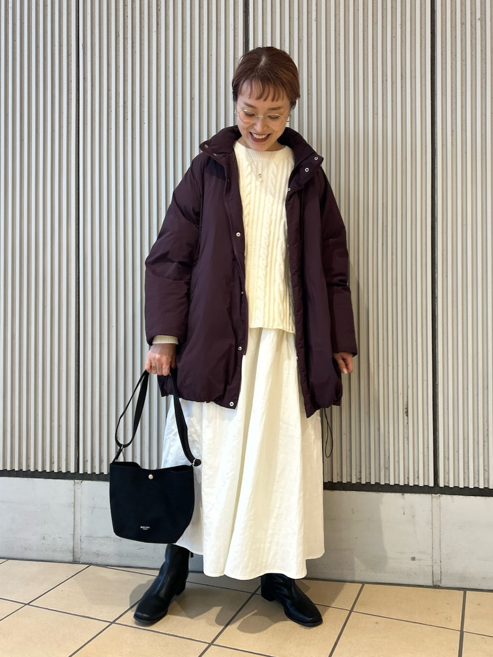 ホワイトコーデに、パープルの色味が綺麗なコートを合わせてみました。