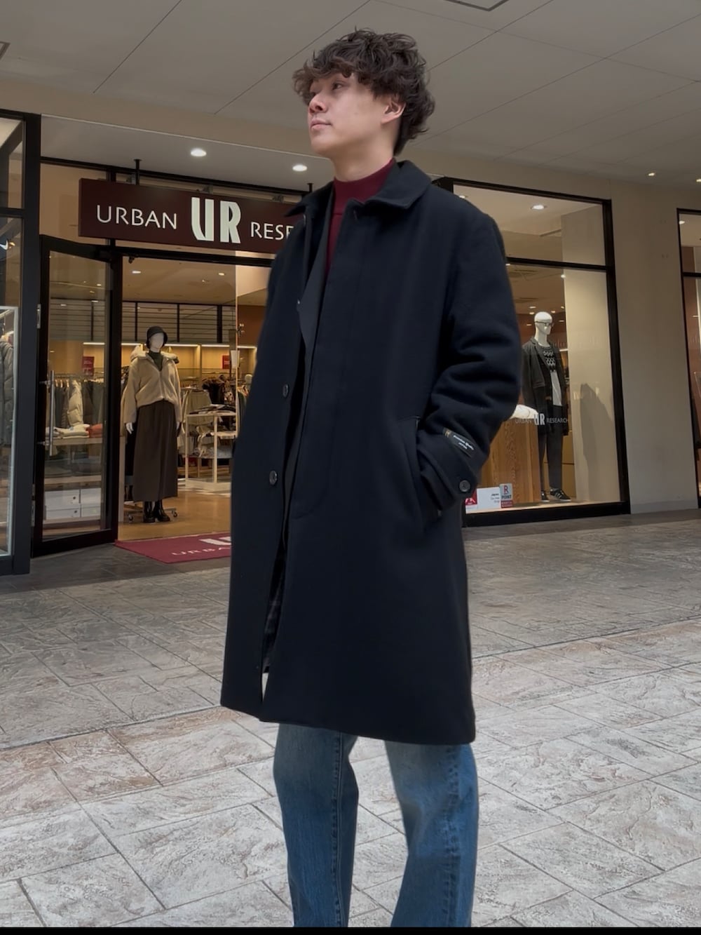 インナーにハイネックのニット、テーラードジャケットを重ねて層を作り、おしゃれ感を演出!!デニムの青もよく映えます!!