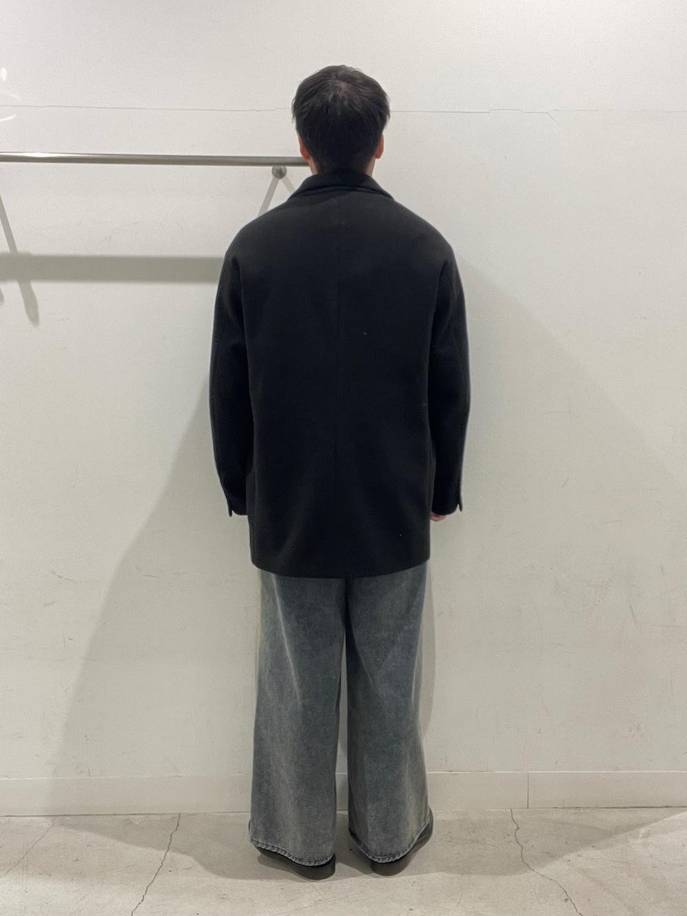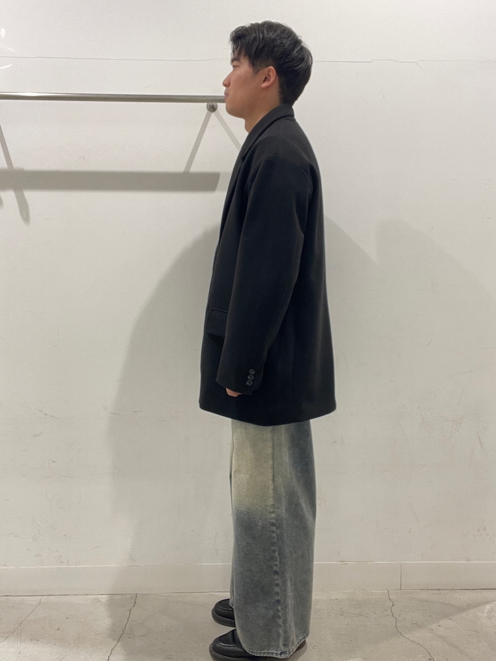 黒のテーラードジャケットにブラウンのニットを合わせて落ち着いた印象に!