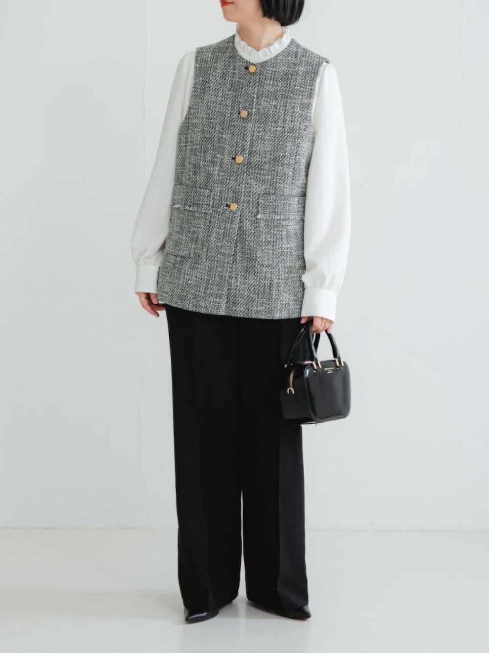 上品なツイードが着こなしを格上げする、ノーカラーツイードジレ。