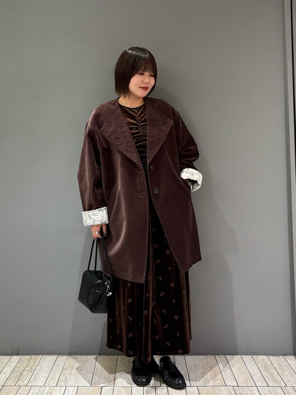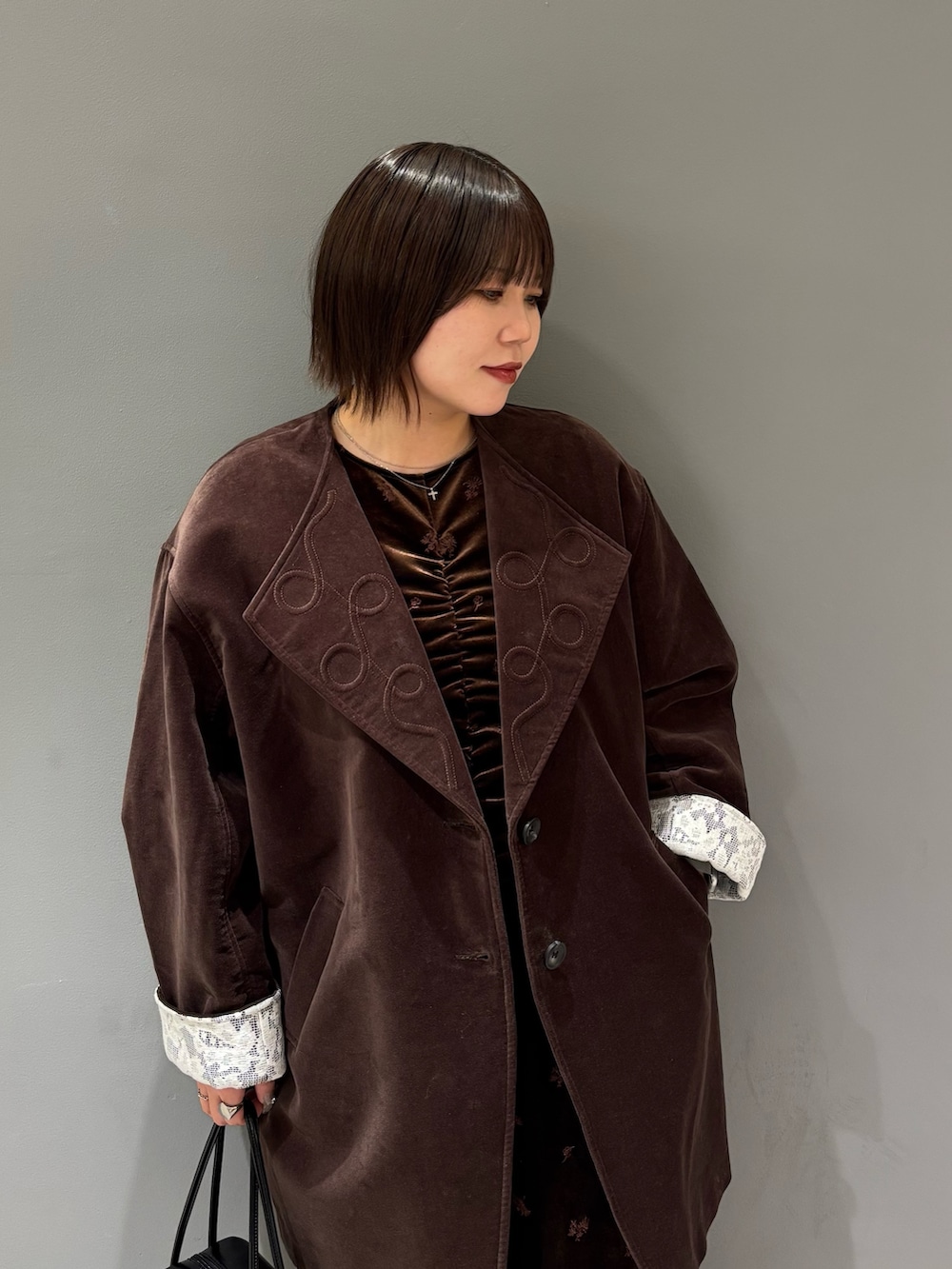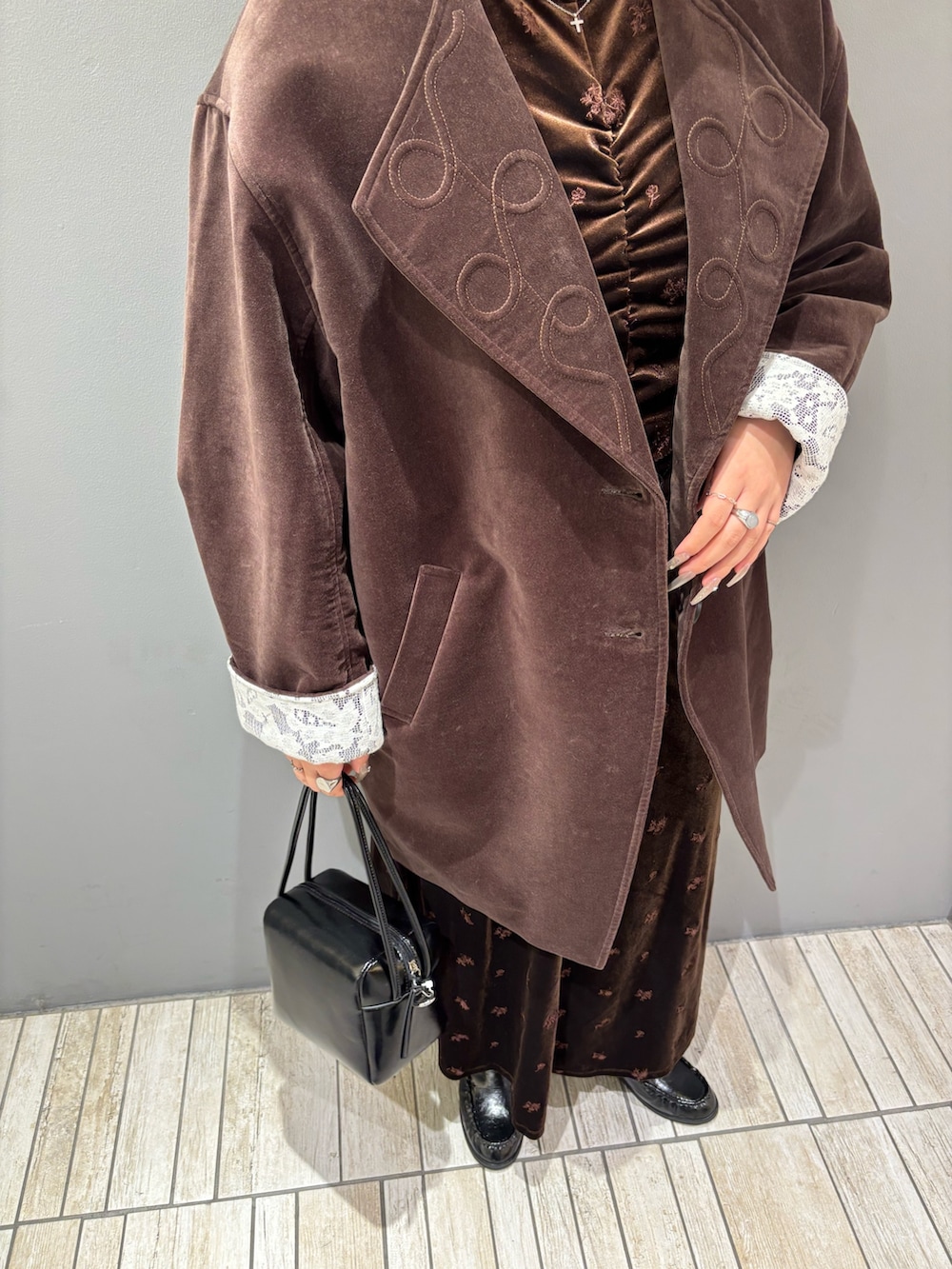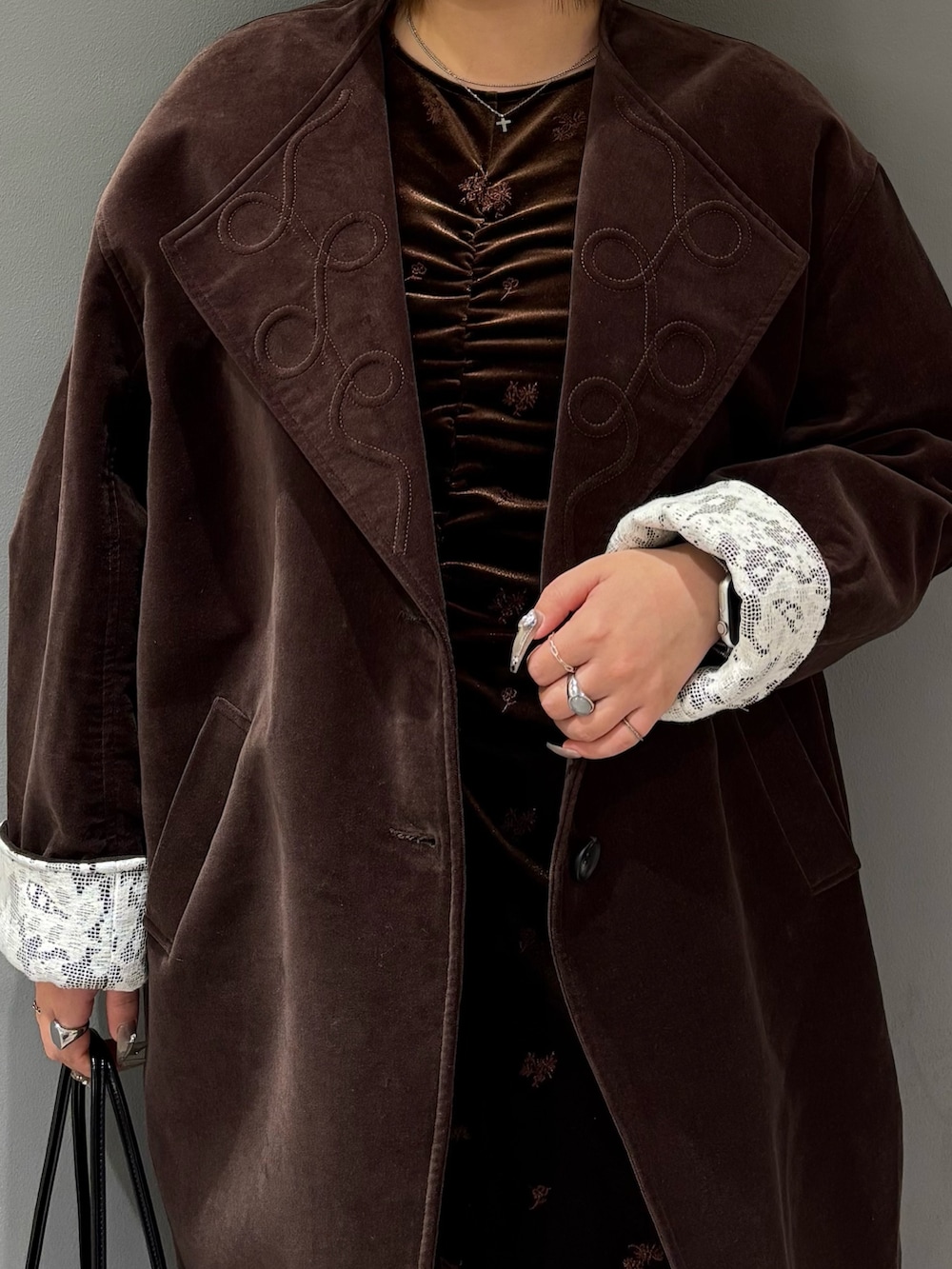 ベロアのモード感に袖口のレースが相まって更に雰囲気のあるアイテムに...!!胸元に立体ステッチもあったりと細かなディティールまでこだわっております🫶🏻