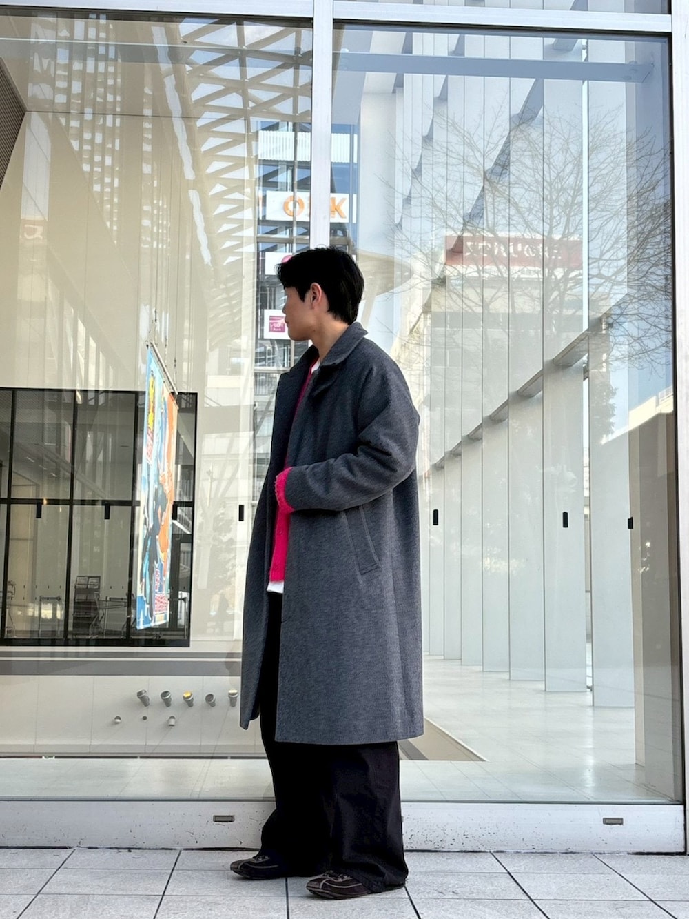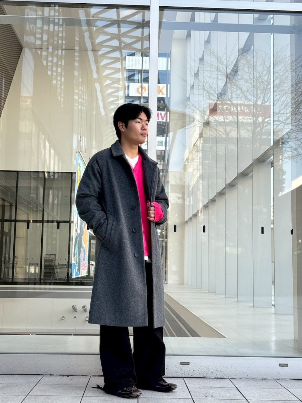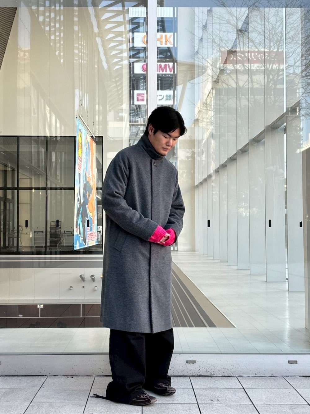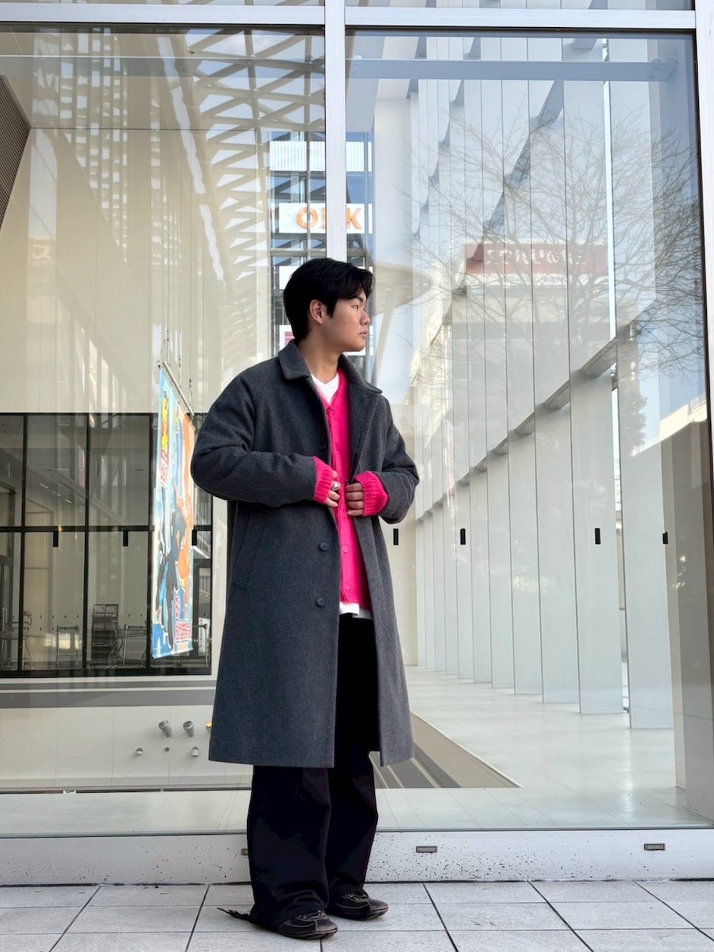 ご覧いただきありがとうございます。本日の差し色コーデになります。ロングコートは全体の面積を取る分、ネックや手首の部分にビビッとカラーで遊びを入れてあげましょう。