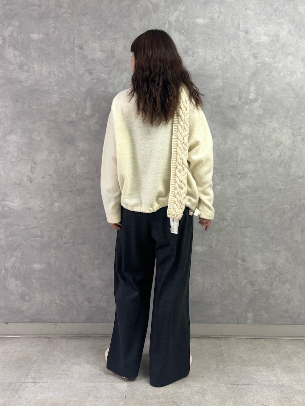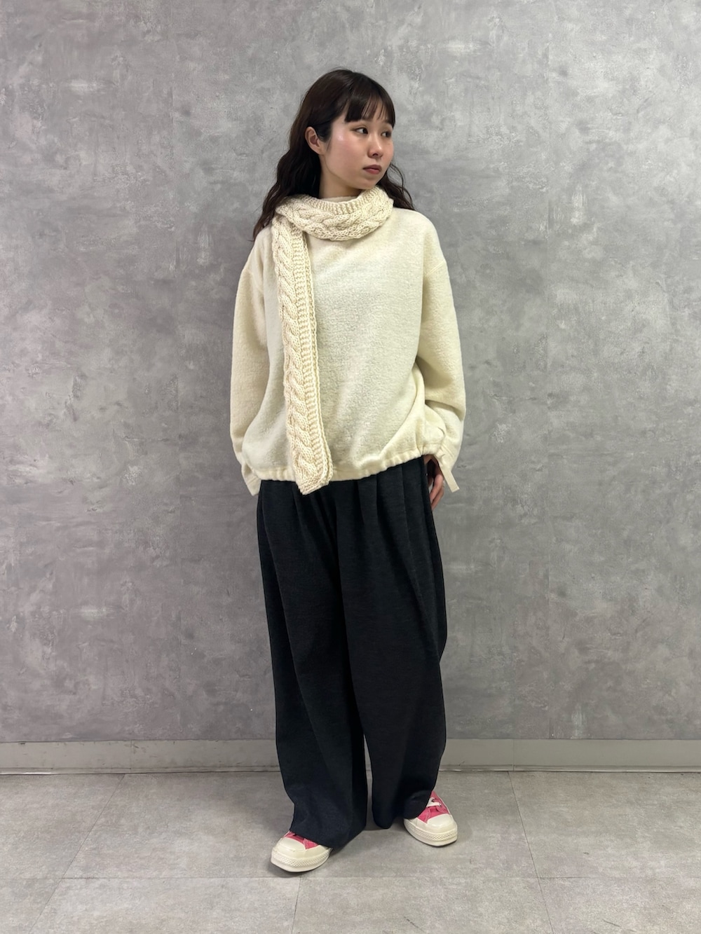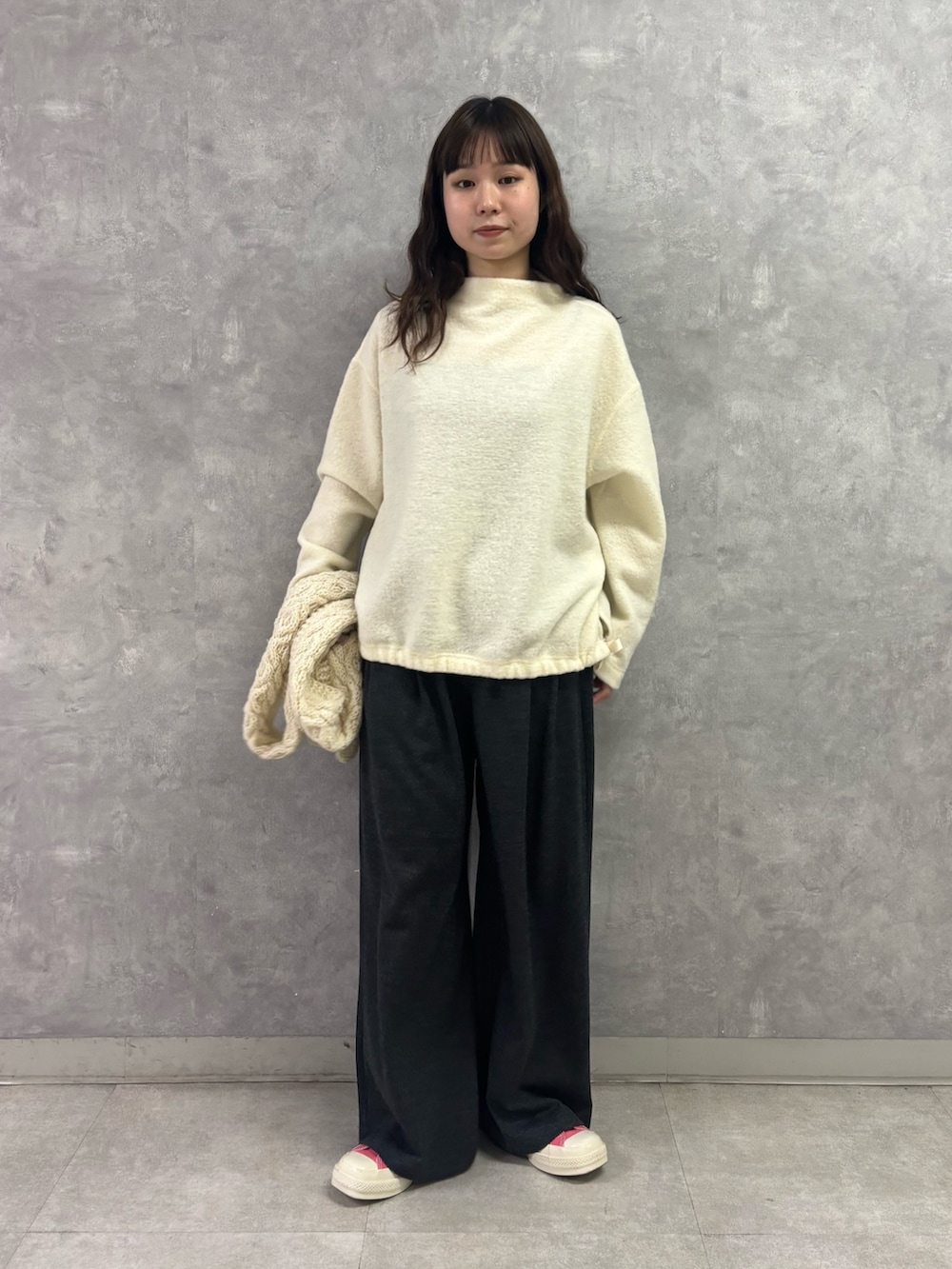 冬らしい温かみのある表面感が可愛くも、ボトルネックで上品にまとまるところがポイントです◎