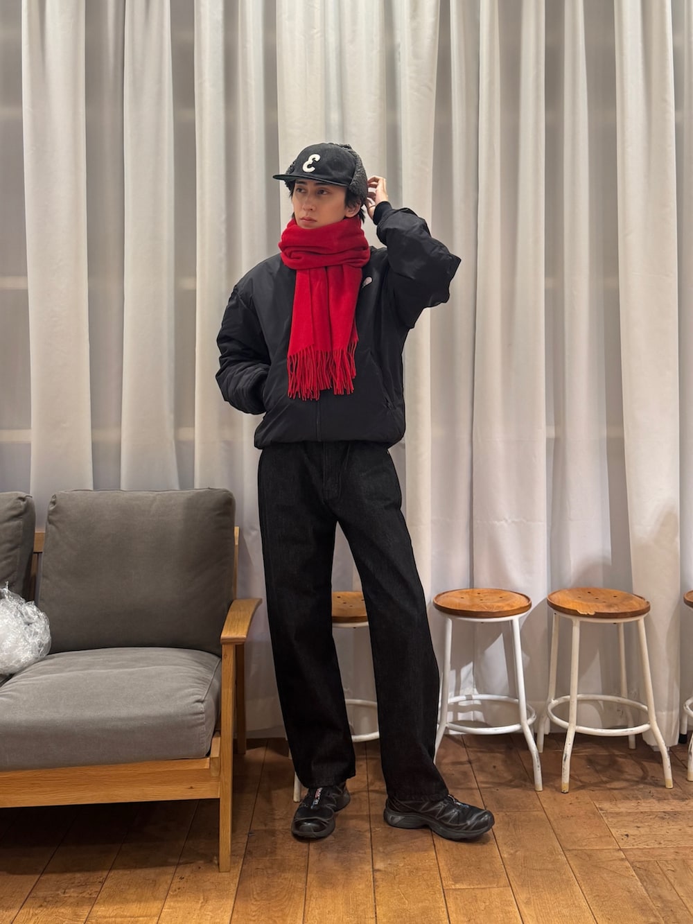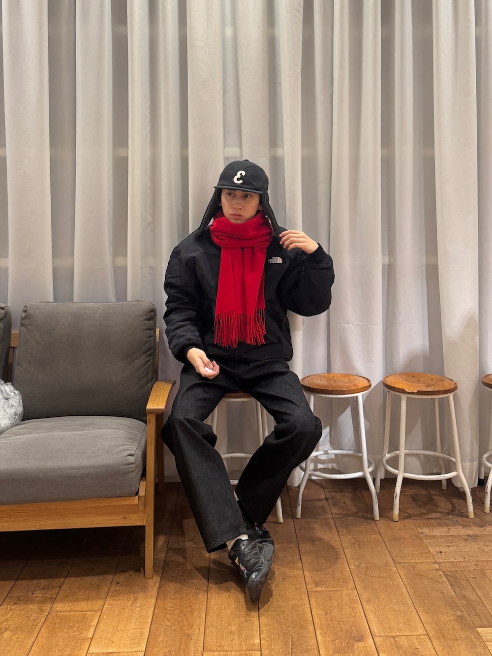 黒のアウターに発色の良い赤マフラーを差し込むことで、冬らしい温度感と都会的なメリハリを演出します☺️