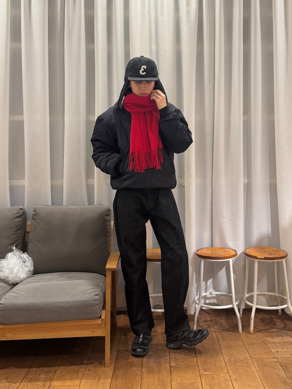ボアキャップとシューズもモノトーンで統一し、マフラーの赤が際立つコントラストを楽しめるスタイリングになっています✨