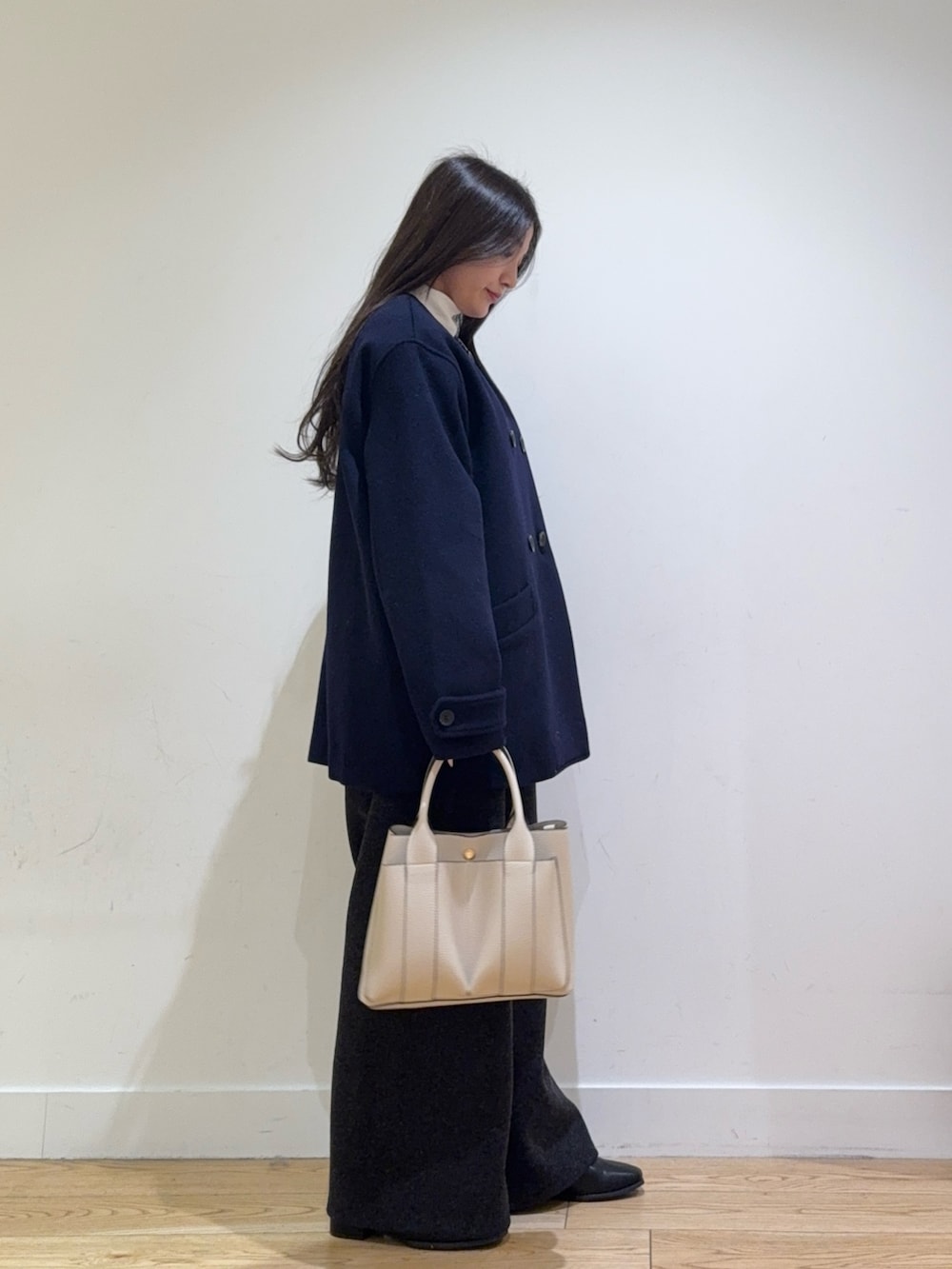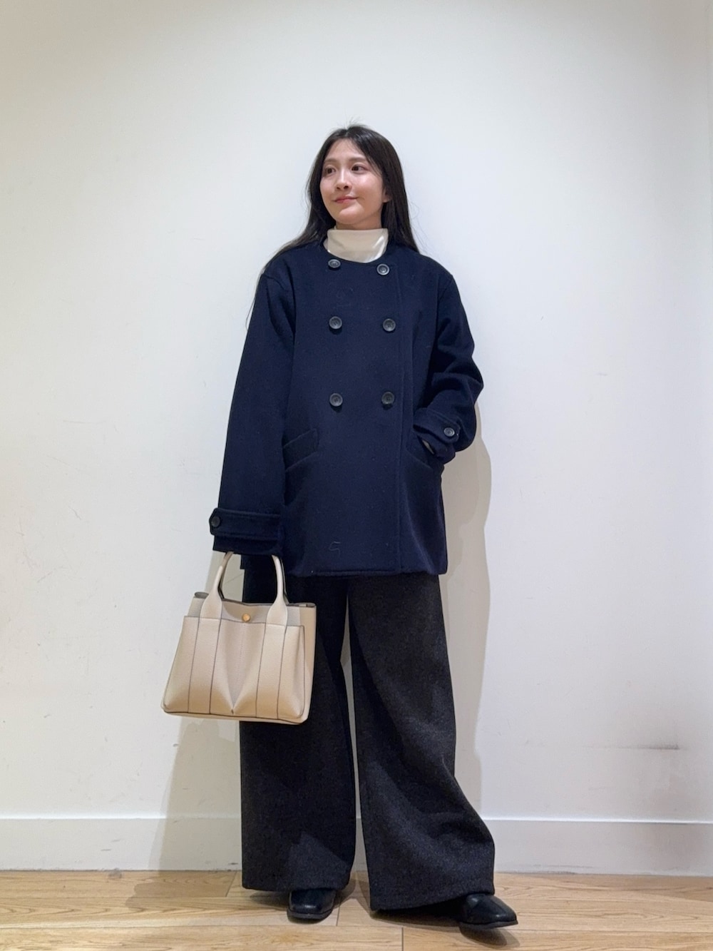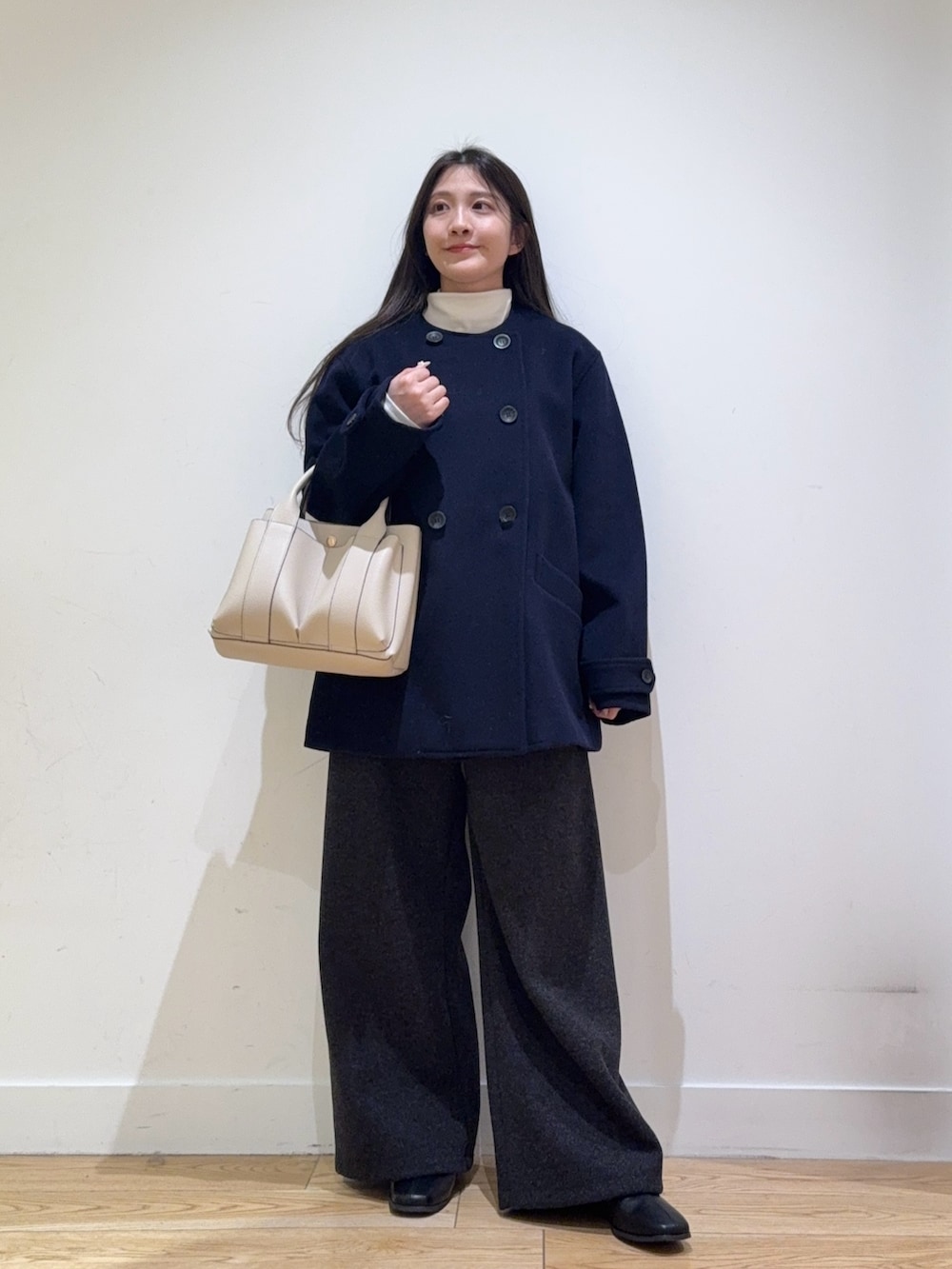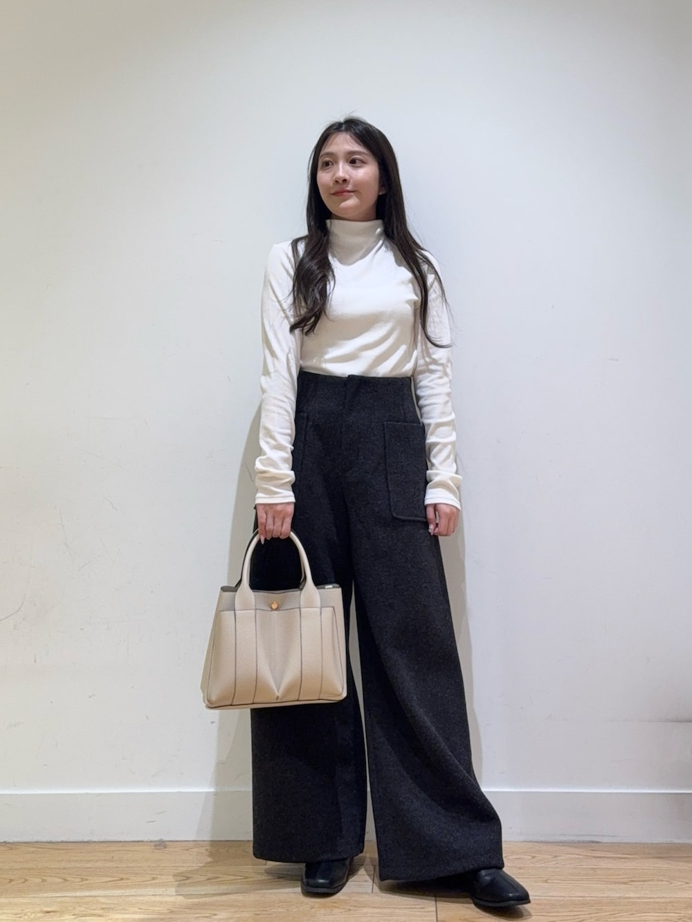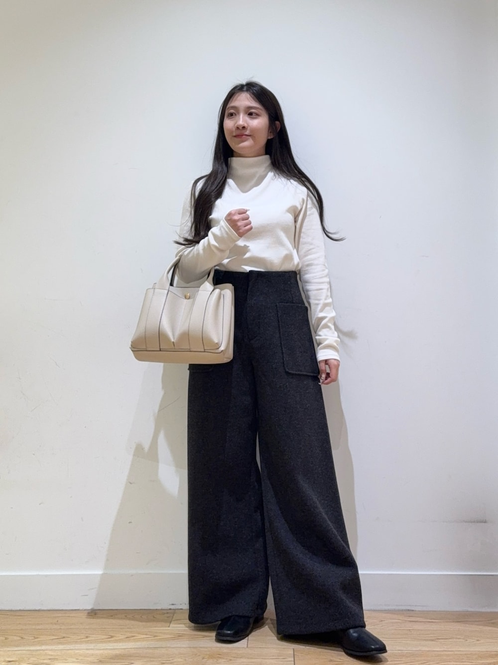 カットメルトンワイドパンツは、ハイウェストでシルエットがきれいなのでスタイルが盛れてます!149cmでヒールが少しあると引き摺らない長さだったので低身長の方にもおすすめです!