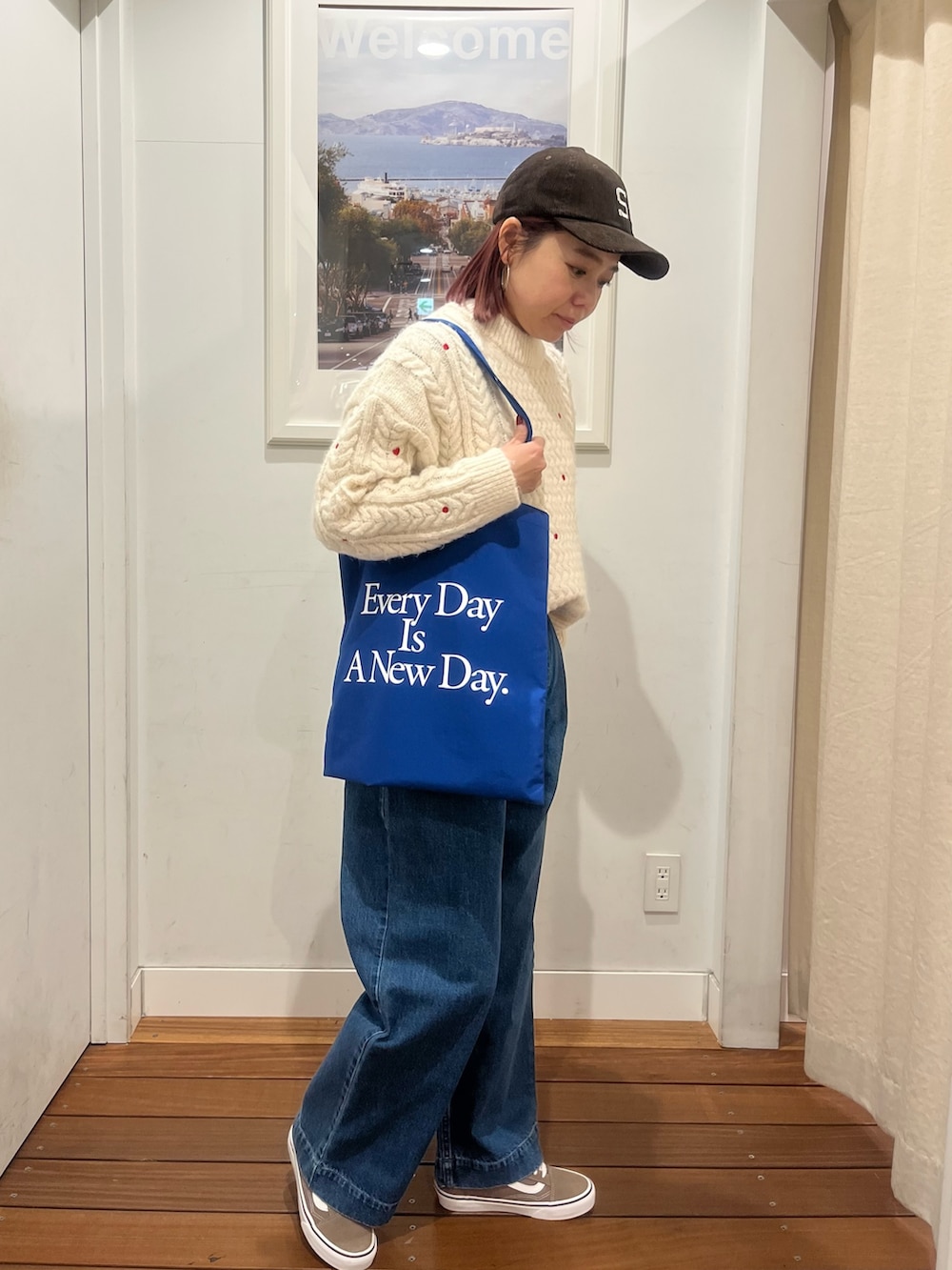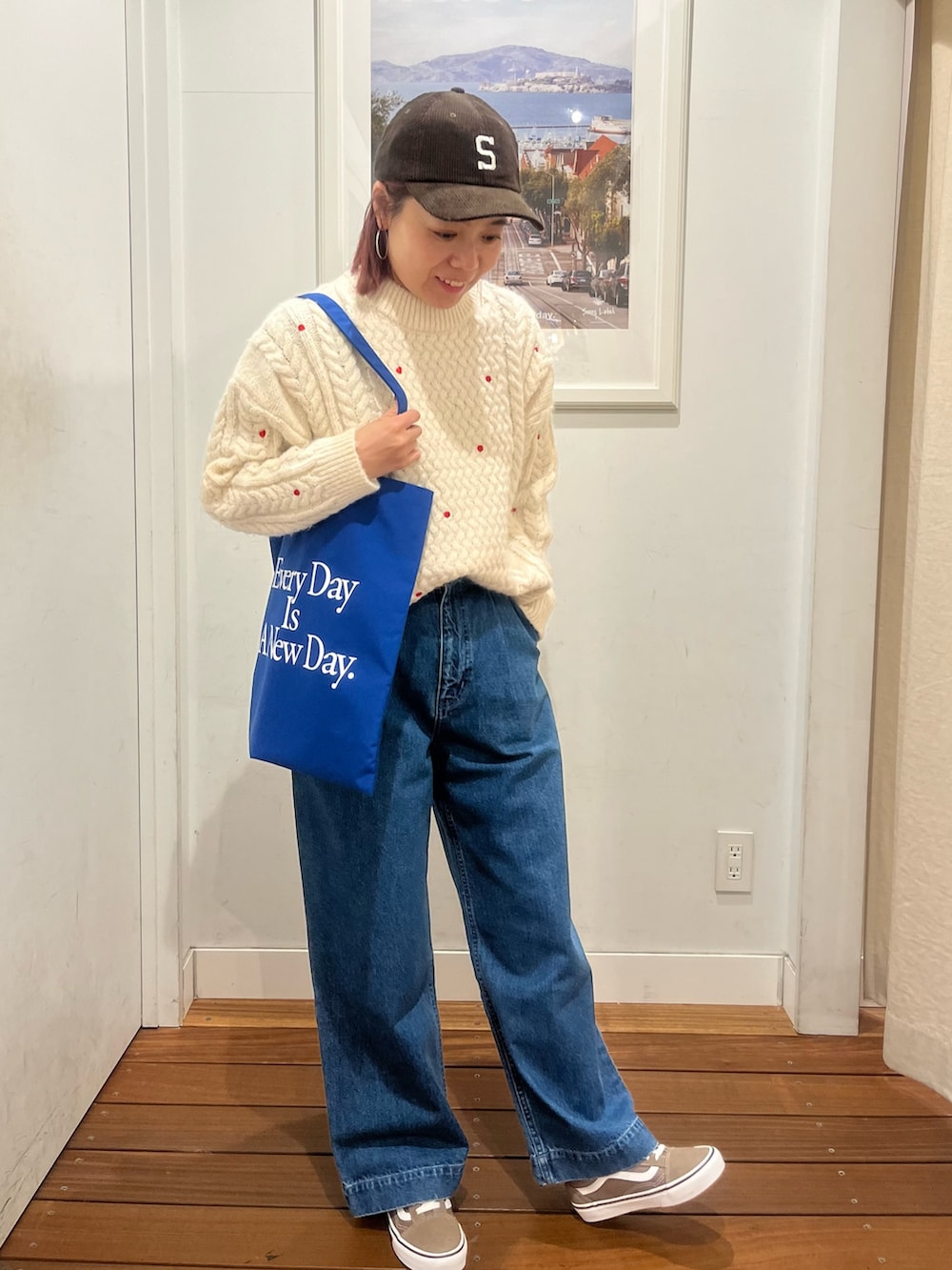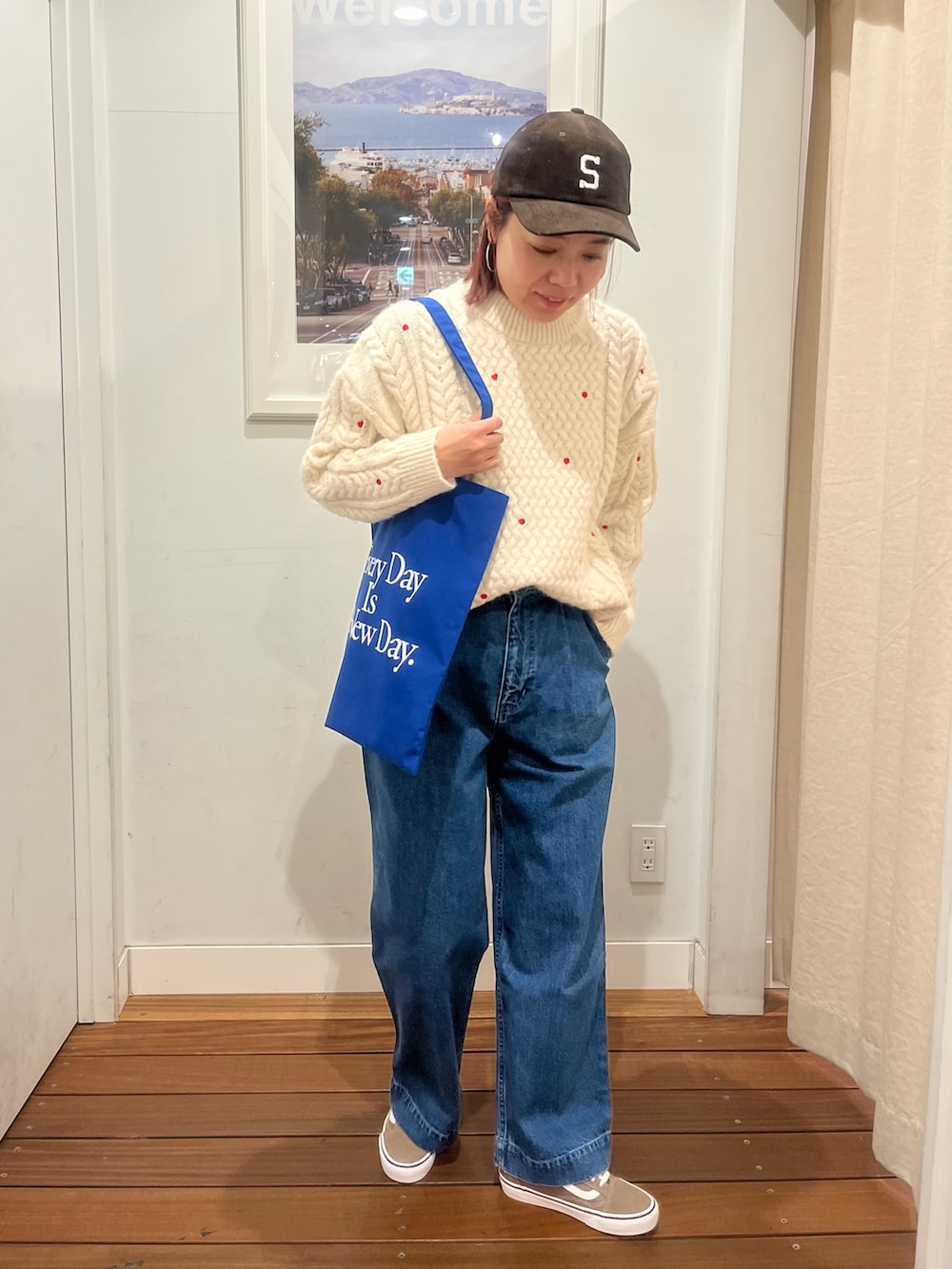 着用のニットは、赤のハートの刺繍やドットの刺繍が入ってて、とてもホリデーらしくクリスマスに着たくなるニットです!