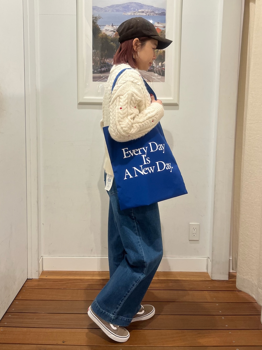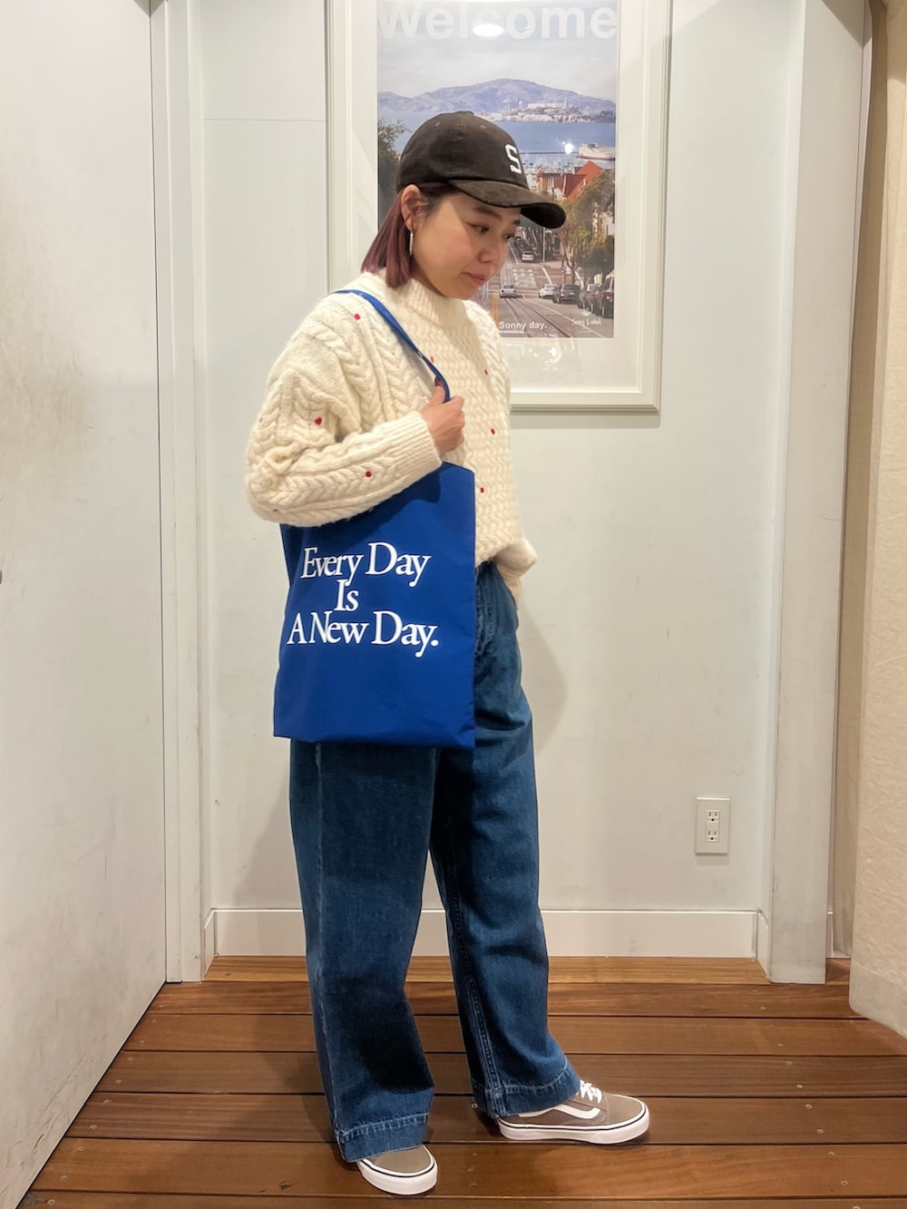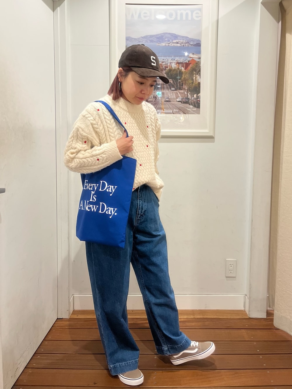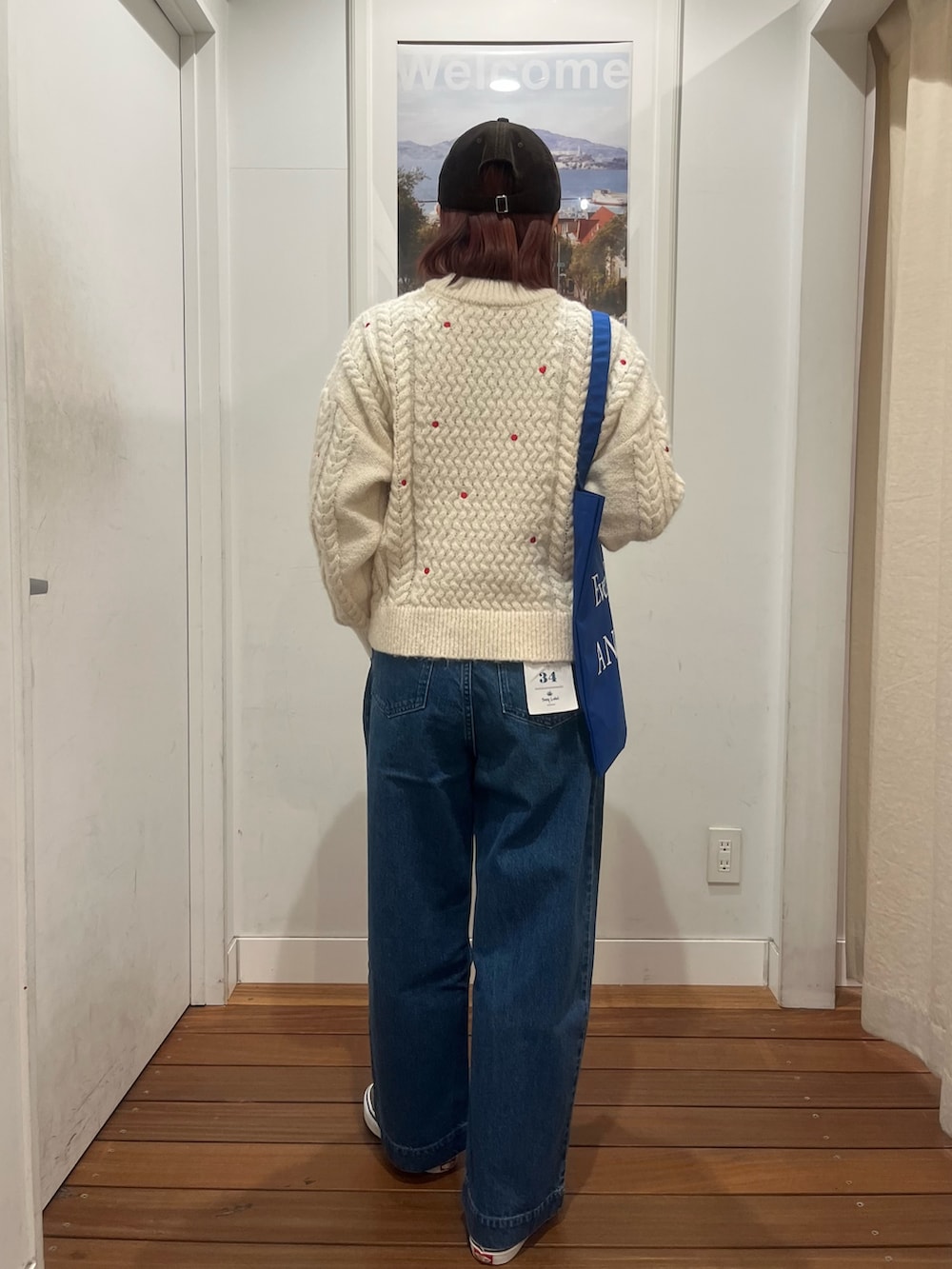 着用のニットは、赤のハートの刺繍やドットの刺繍が入ってて、とてもホリデーらしくクリスマスに着たくなるニットです!