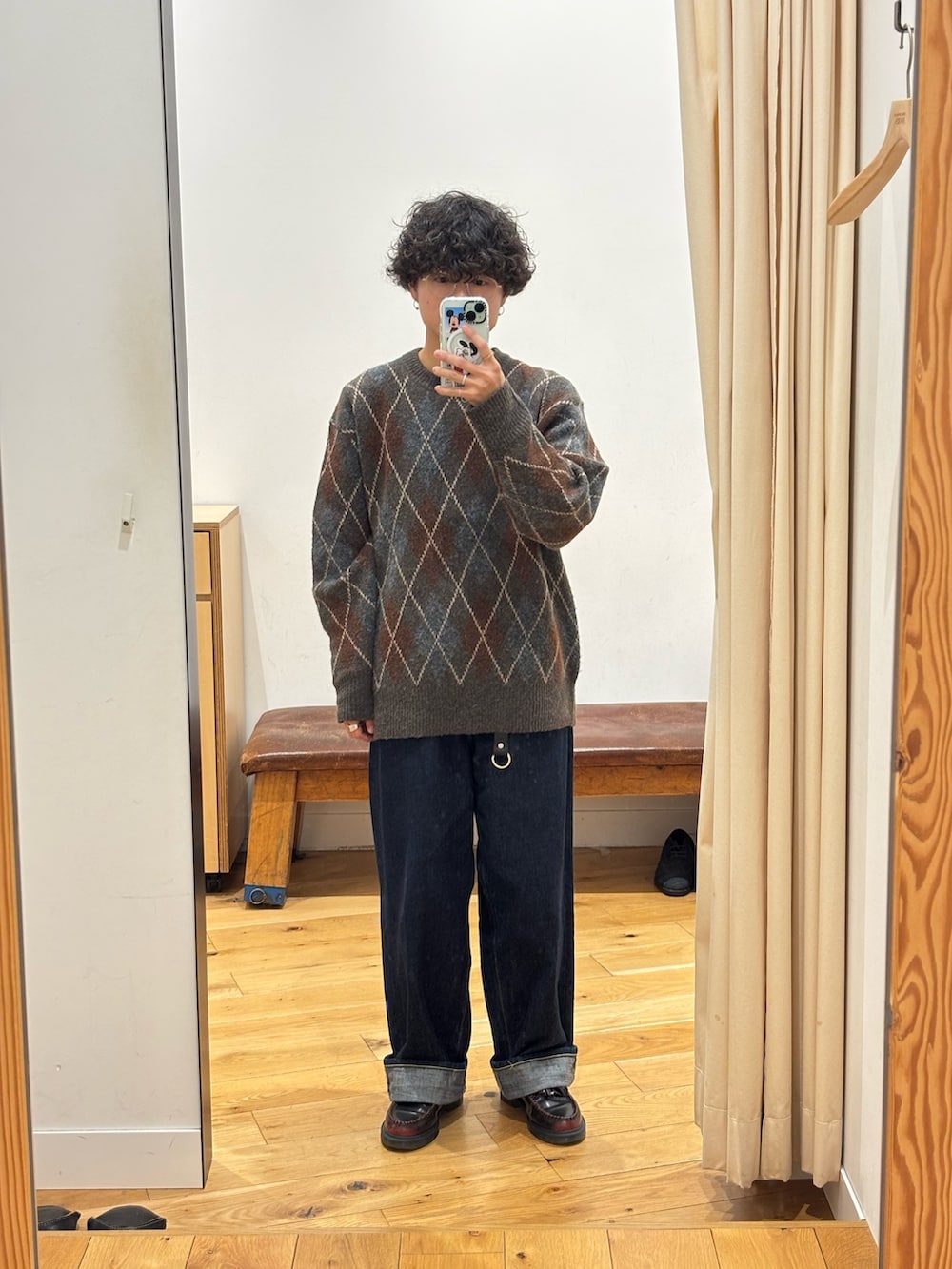 店頭でも入荷してすぐ好評のアーガイルニットとワイドシルエットのデニムで合わせました👖