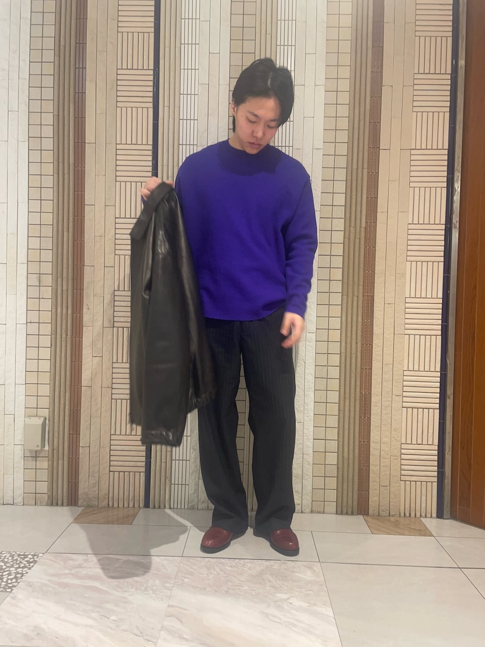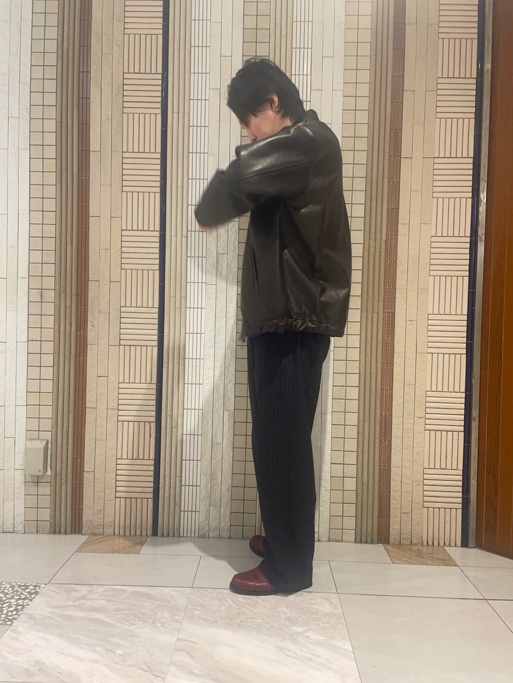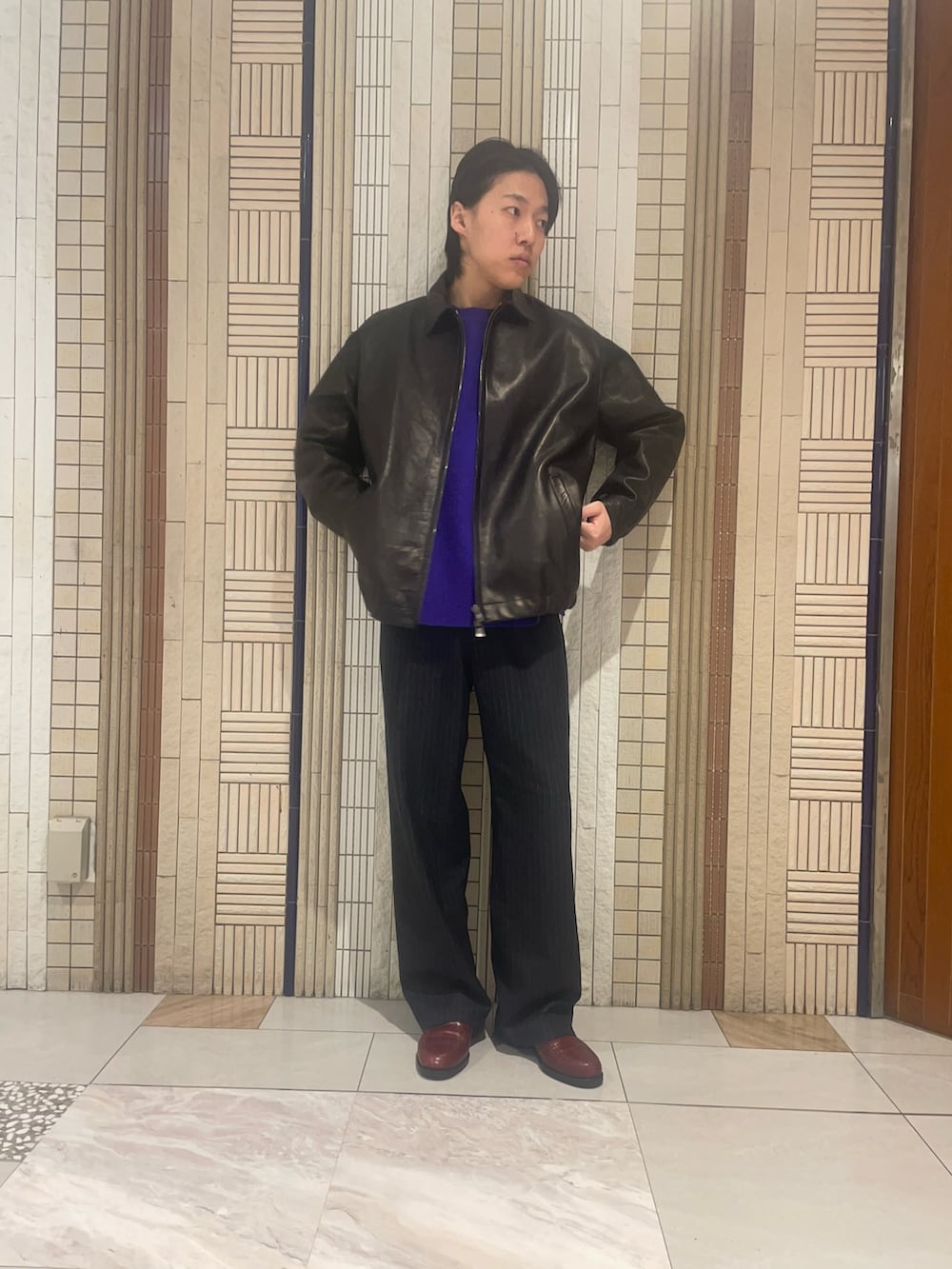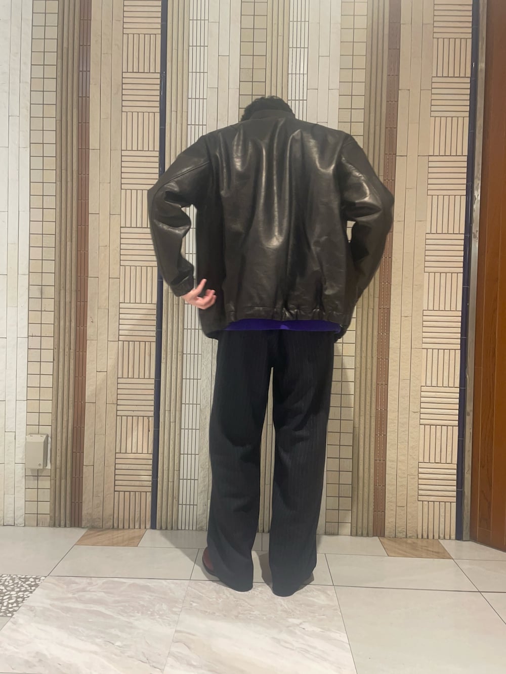 さてさて、モテる男たる者、レザーはカッコよく着るべきです。絶対にそうです。普段コートやダウンで済ます所を男らしいレザーが出てくるとギャップで女性はイチコロだと偉い人が言っていました。その説をかれこれ5,6年信用しているので今回はレザーにニットです。羊ほど優しい雰囲気はなく、牛ほどの無骨はさ無い。そんな革界の中性的存在の馬革。そんな贅沢な革と裏地のデザインをふんだんに楽しめるのがこのジャケットです。これには流石の私の頭髪も左右非対称になりました。
