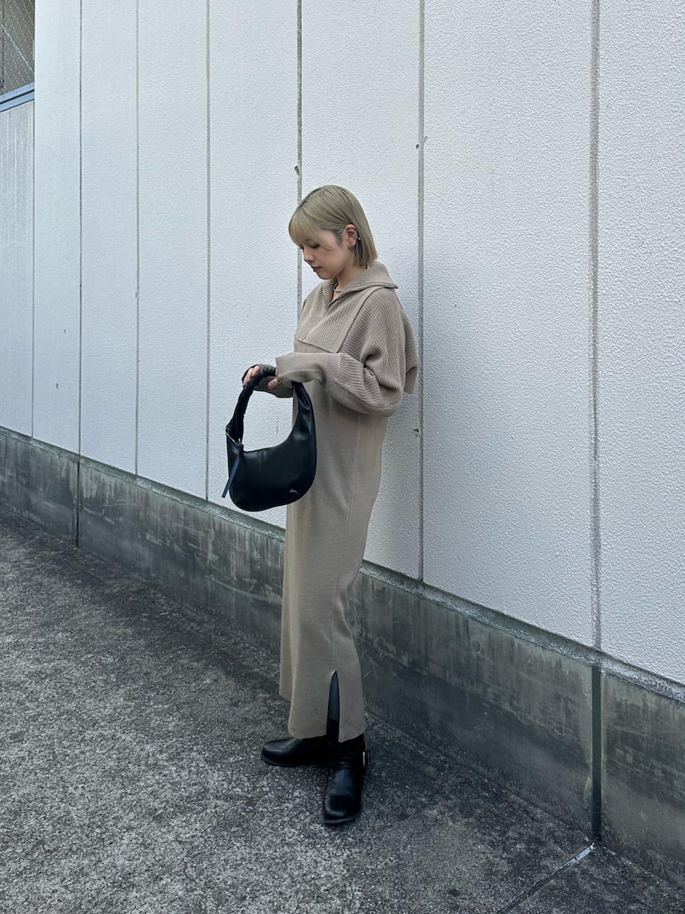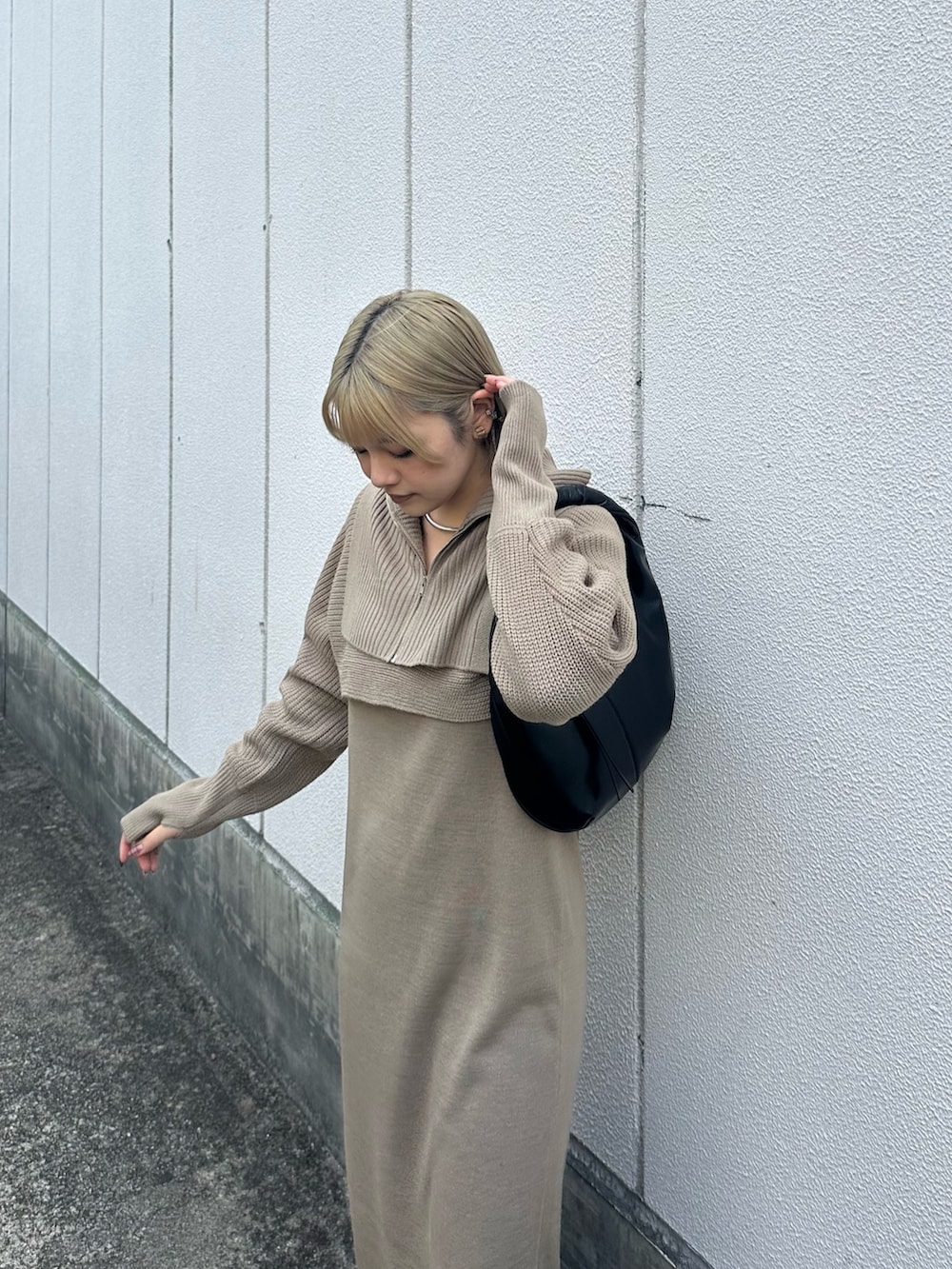 色は柔らかいベージュにしましたが、大人っぽく着用したく、小物は黒でまとめてみました◎
