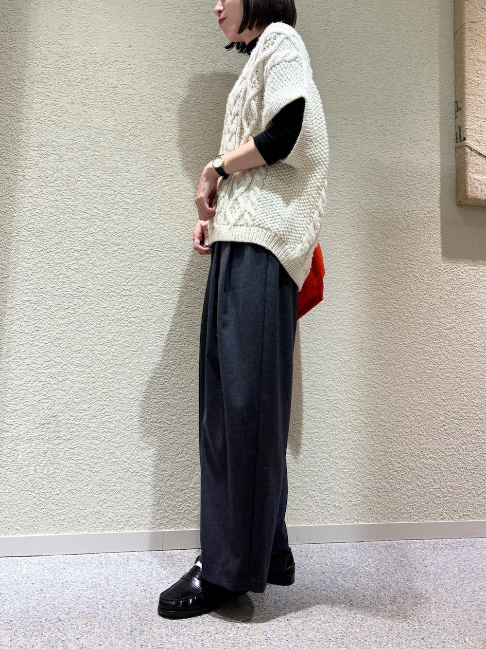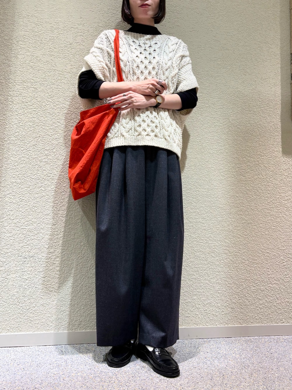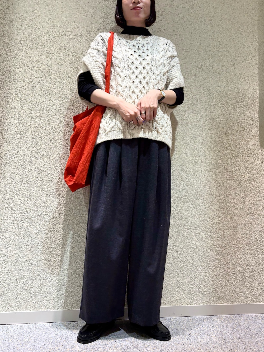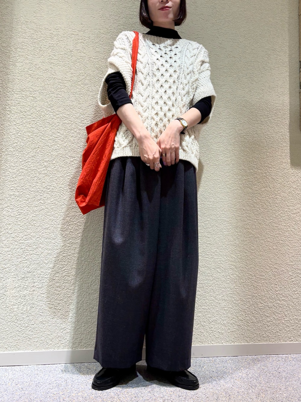 赤のバッグを差し色にちょっとホリデー感のあるコーディネートにしました^ ^