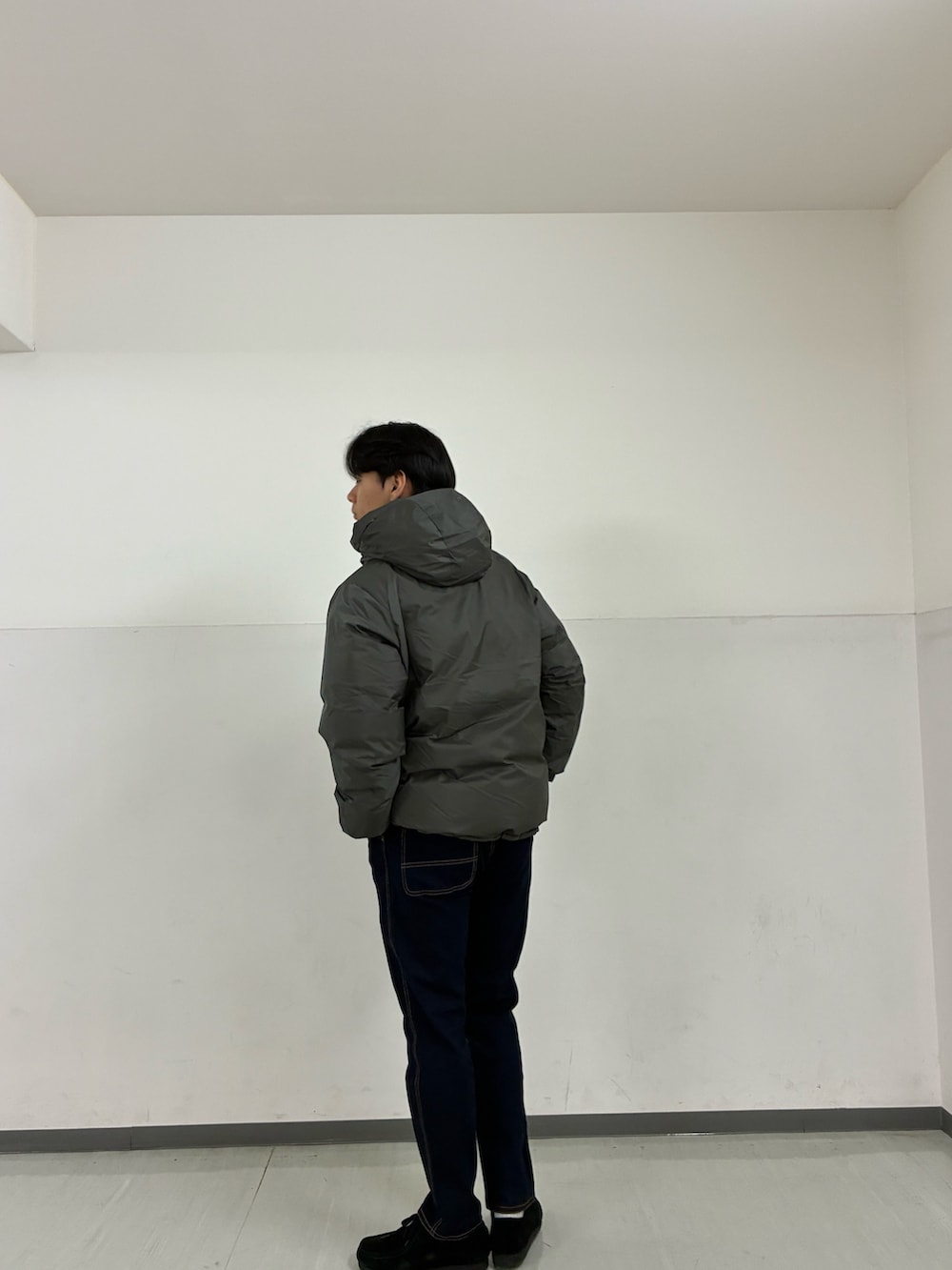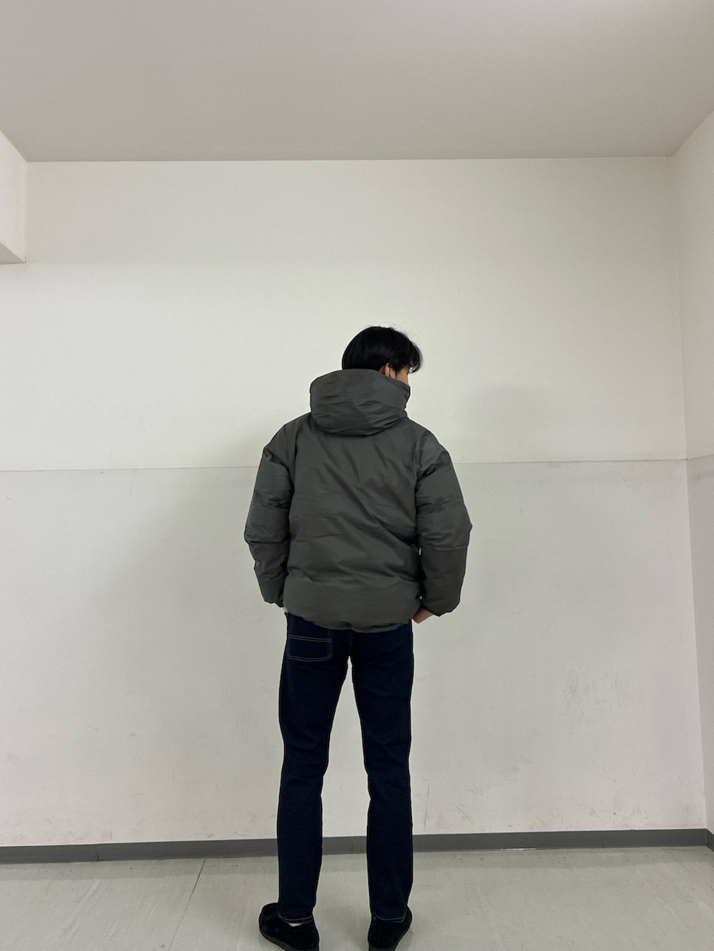 上半身をダークトーンのオリーブ(グレー)でまとめ、濃紺のデニムで引き締めることで、野暮ったさを排除したスマートな印象に。